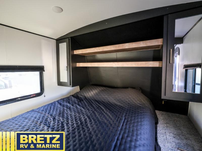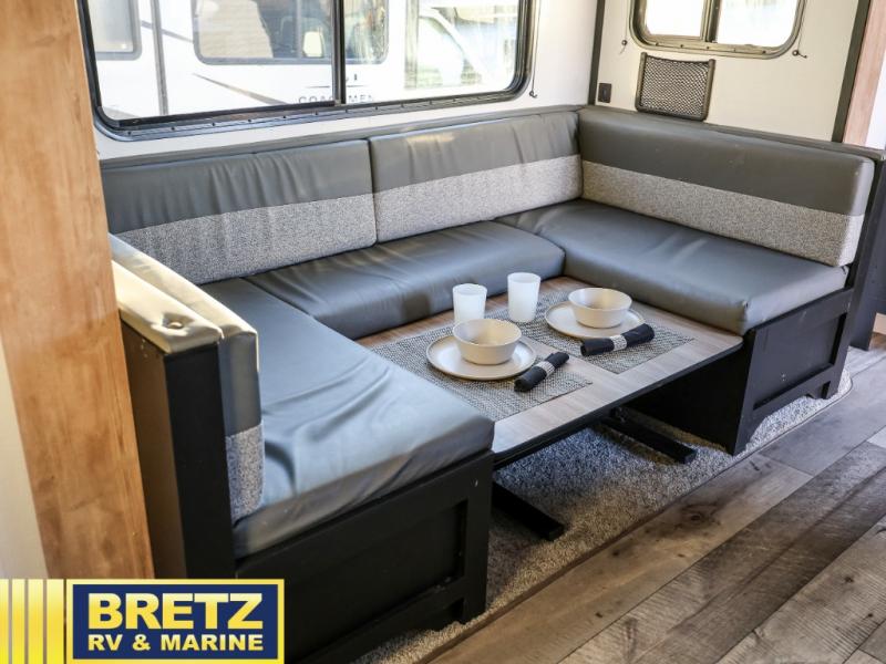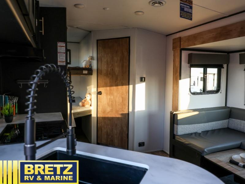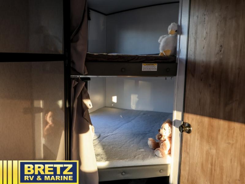 Whether you enjoy camping with your companion or a larger group, you will have plenty of space to call your own and to offer sleeping space for friends and family. There is a private front bedroom with a queen bed and storage for you, a U-shaped dinette slide for eating meals at and sleeping at night when needed, as well as a set of double-size bunks in the rear giving you sleeping space for a total of eight. Outside, you can make meals using the outdoor kitchen, relax under the 18' power awning, and store your camping gear in the pass-through compartment. If you need a little bit more help to create dinner, you can head back inside where you will find a three-burner range with glass top and more in the full interior kitchen.