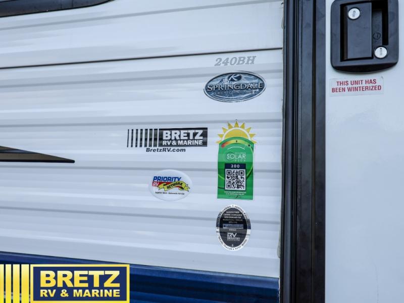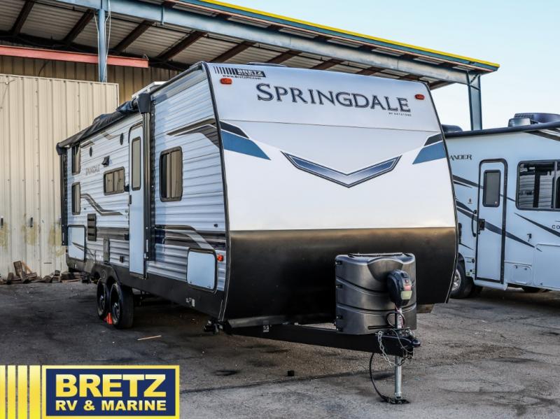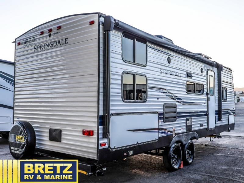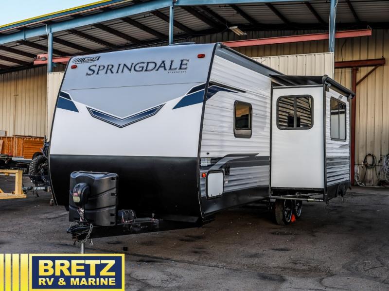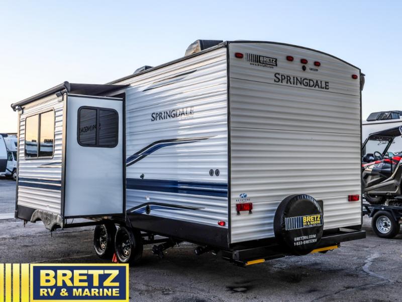With any Keystone Springdale travel trailer, you will have a friction hinge entry door with sturdy LCI SolidStep steps, a pass-through storage compartment for your outdoor gear, and reliable Dexter E-Z Lube axles to maneuver your Springdale down the road and into the campsites. Some of the Keystone Exclusives provide 12V color-coded wiring with easy-to-trace circuits which is better than conventional RV wiring allowing a faster diagnosis for quicker repairs, and the streamlined heat distribution that uses in-floor heat vents for more efficiency for uninterrupted air flow. Also included, the Blade high performance air flow system that delivers 30% more air flow. The interior gives you pressed kitchen countertops, pleated night shades, and designer upholstered window valances for easy care and style, and more depending on the Springdale you choose!