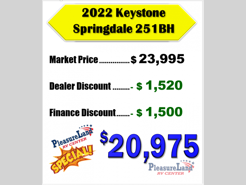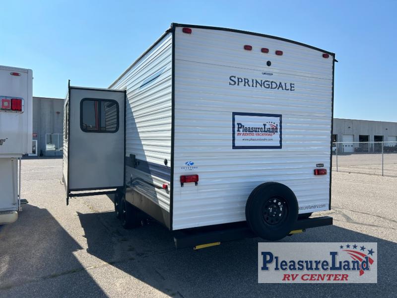 With any Keystone Springdale travel trailer, you will have a friction hinge entry door with sturdy LCI SolidStep steps, a pass-through storage compartment for your outdoor gear, and reliable Dexter E-Z Lube axles to maneuver your Springdale down the road and into the campsites. Some of the Keystone Exclusives provide 12V color-coded wiring with easy-to-trace circuits which is better than conventional RV wiring allowing a faster diagnosis for quicker repairs, and the streamlined heat distribution that uses in-floor heat vents for more efficiency for uninterrupted air flow. Also included, the Blade high performance air flow system that delivers 30% more air flow. The interior gives you pressed kitchen countertops, pleated night shades, and designer upholstered window valances for easy care and style, and more depending on the Springdale you choose!