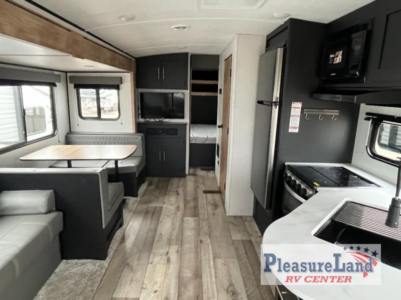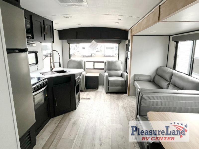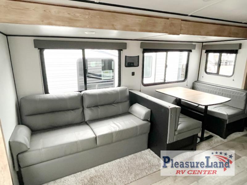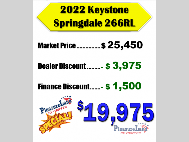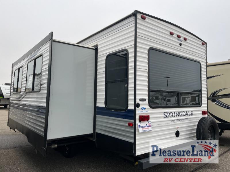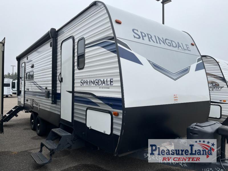 With any Keystone Springdale travel trailer, you will have a friction hinge entry door with sturdy LCI SolidStep steps, a pass-through storage compartment for your outdoor gear, and reliable Dexter E-Z Lube axles to maneuver your Springdale down the road and into the campsites. Some of the Keystone Exclusives provide 12V color-coded wiring with easy-to-trace circuits which is better than conventional RV wiring allowing a faster diagnosis for quicker repairs, and the streamlined heat distribution that uses in-floor heat vents for more efficiency for uninterrupted air flow.  Also included, the Blade high performance air flow system that delivers 30% more air flow. The interior gives you pressed kitchen countertops, pleated night shades, and designer upholstered window valances for easy care and style, and more depending on the Springdale you choose!