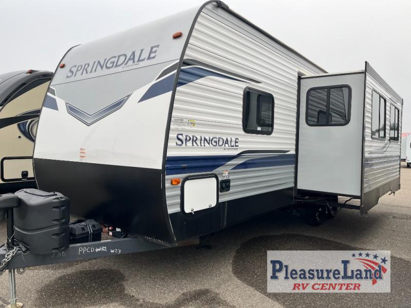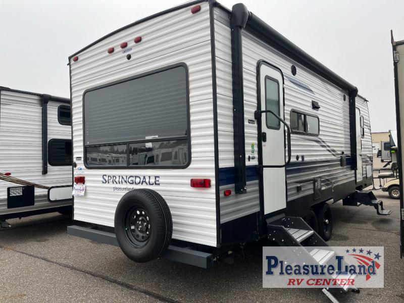 This rear living Springdale travel trailer features a large slide for added interior space, a booth dinette for meals, and two entry doors for convenience. The owners will have their own queen bed in the front private bedroom for a separate place to chill. The booth dinette and the sofa can both fold down into sleeping space after you have enjoy relaxing, dining and playing games.  There is also plenty of storage space with overhead cabinetry, kitchen cupboards, and bedside closets, so you can bring whatever you need with you to make your next camping trip enjoyable!