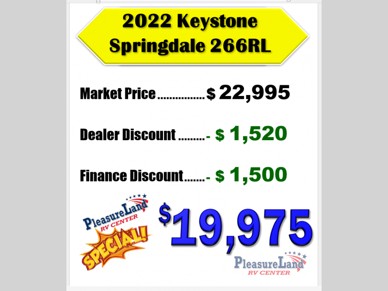 With any Keystone Springdale travel trailer, you will have a friction hinge entry door with sturdy LCI SolidStep steps, a pass-through storage compartment for your outdoor gear, and reliable Dexter E-Z Lube axles to maneuver your Springdale down the road and into the campsites. Some of the Keystone Exclusives provide 12V color-coded wiring with easy-to-trace circuits which is better than conventional RV wiring allowing a faster diagnosis for quicker repairs, and the streamlined heat distribution that uses in-floor heat vents for more efficiency for uninterrupted air flow.  Also included, the Blade high performance air flow system that delivers 30% more air flow. The interior gives you pressed kitchen countertops, pleated night shades, and designer upholstered window valances for easy care and style, and more depending on the Springdale you choose!