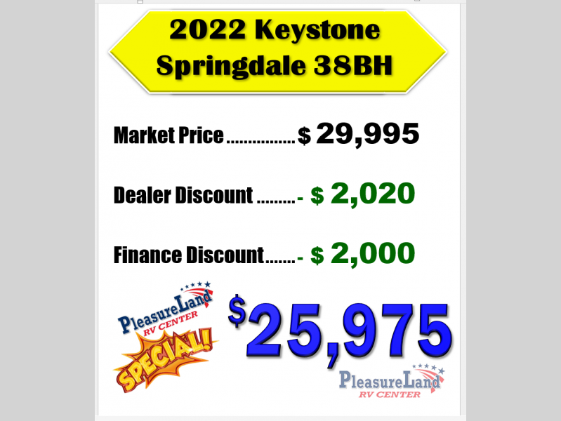 With any Keystone Springdale destination trailer, you will have a fully walkable roof with seamless one-piece TPO roof membrane, a one-piece polypropylene, heated and enclosed underbelly, plus rack and pinion slide mechanism and safety glass functional windows in the slide outs. Some of the Keystone Exclusives provide 12V color-coded wiring with easy-to-trace circuits which is better than conventional RV wiring allowing a faster diagnosis for quicker repairs, and the streamlined heat distribution that uses in-floor heat vents for more efficiency for uninterrupted air flow. Also included, the Blade high performance air flow system that delivers 30% more air flow. The interior gives you a 6'10" vaulted ceiling, designer upholstered window valances, a decorative light over the dinette, pressed kitchen countertops and so much more depending on the Springdale you choose!