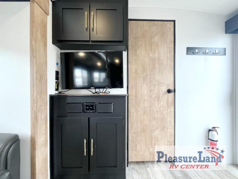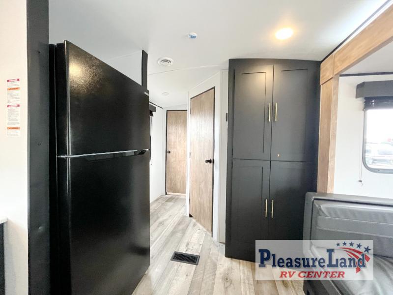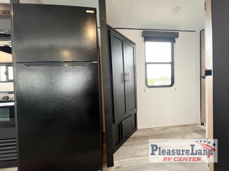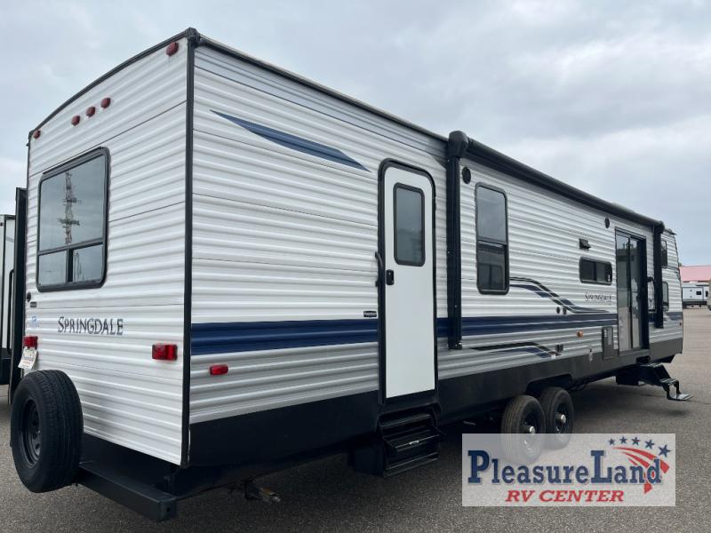 This spacious Keystone Springdale destination trailer offers a larger family or group of friends many comforts of home with sleeping for nine found between the bedding and furniture! Your kids or friends will love the front bunkhouse with triple bunks and a kids dinette, and everyone will appreciate the double slides for added space, plus the double entry doors to promote a smooth flow of traffic in and out the main living area and the rear bedroom. And the kitchen offers all that you need to prepare and cook for your hungry crew while camping. There is a large kitchen sink making clean-up easy, a three-burner range for cooking, a residential refrigerator for lots of perishable items, and two pantries for dry and canned good storage.
