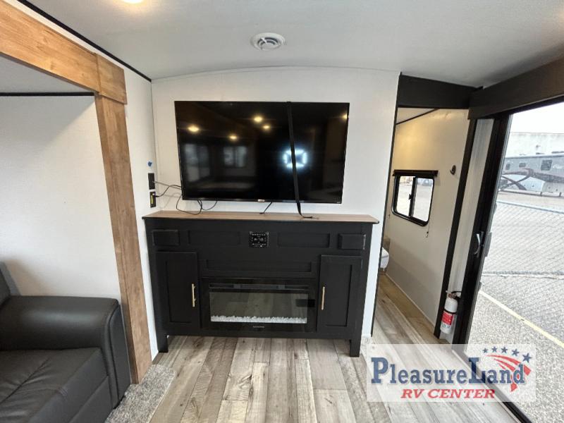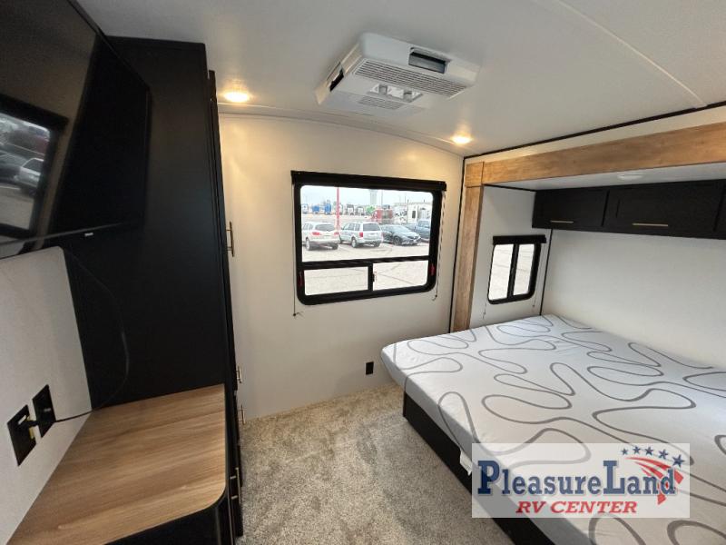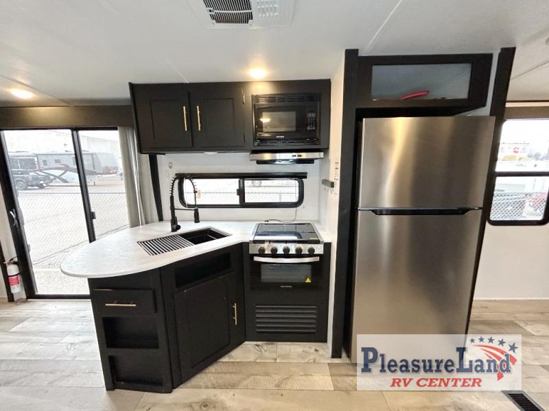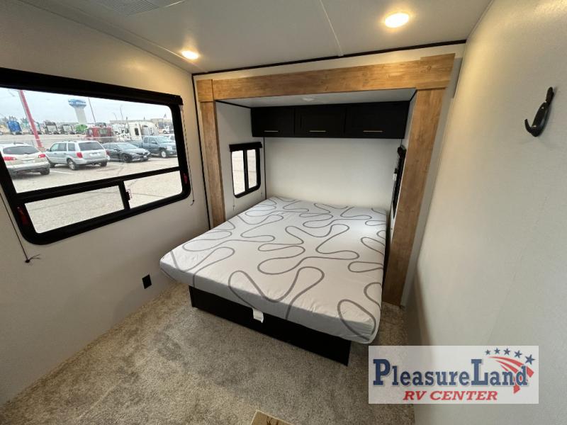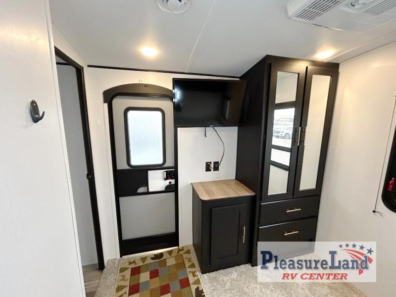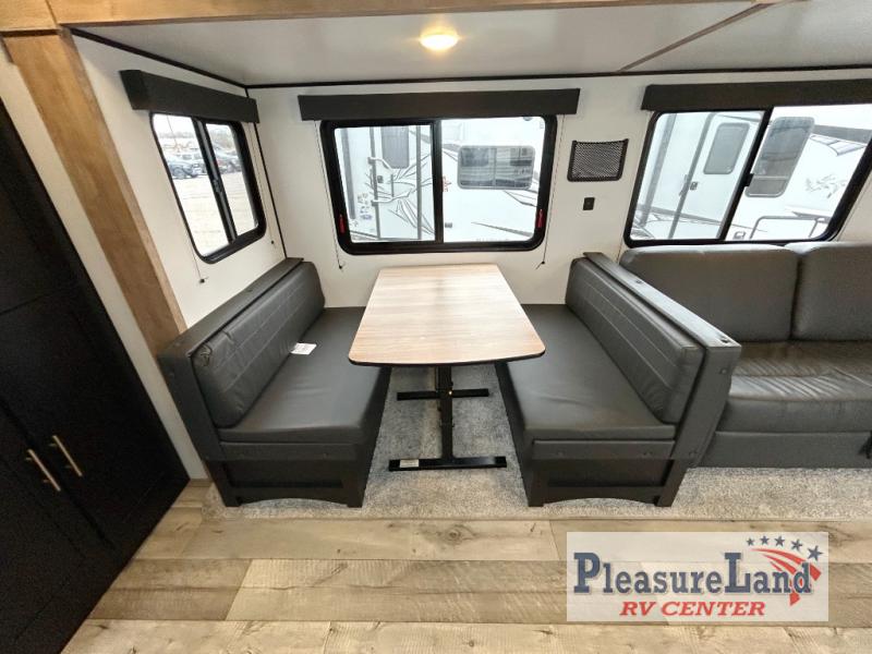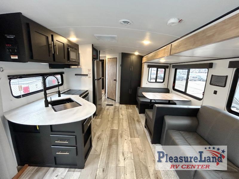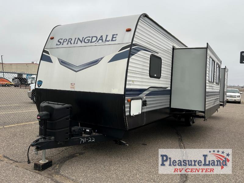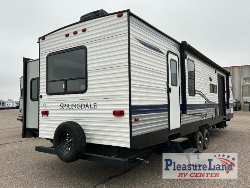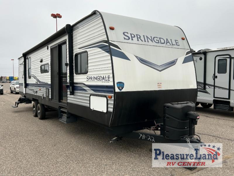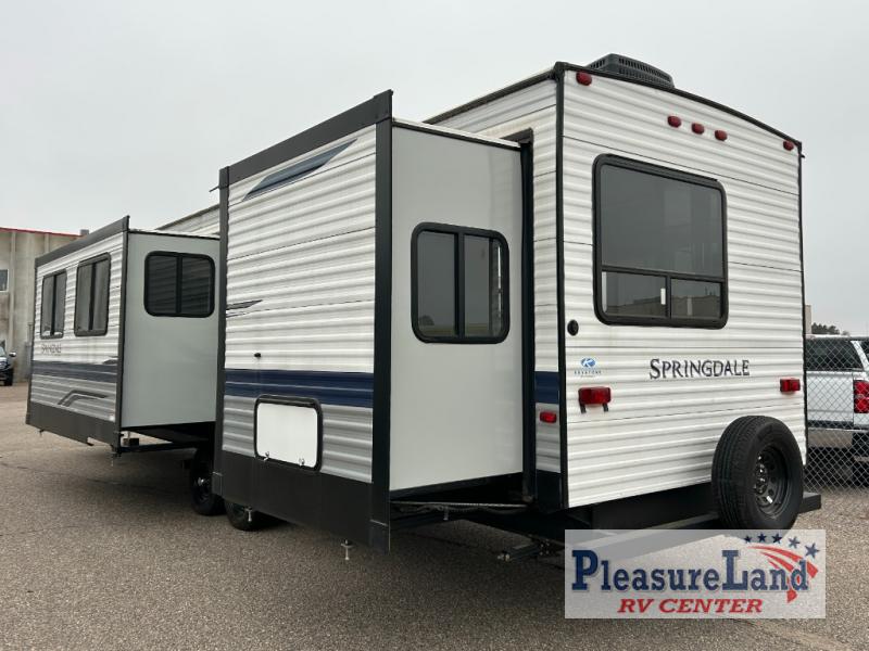 Spending time away from home will be easy in this Keystone Springdale! This destination trailer gives you two private bedrooms, both with queen-size beds, as well as some added sleeping space in the living area on the furniture. The large slide in the main area gives you plenty of walking around space while you cook all the family favorites with full amenities including a residential refrigerator. You will find plenty of storage throughout including in the two pantries, the overhead cabinets, the front bedroom closets, the rear bedroom wardrobe and along the exterior for your outdoor gear. And the full bathroom will keep you refreshed for your next activity or bedtime.