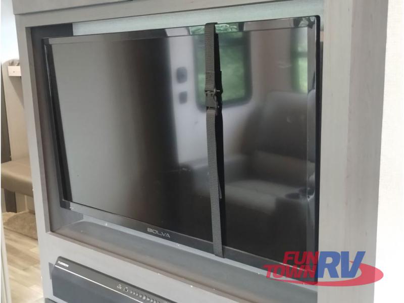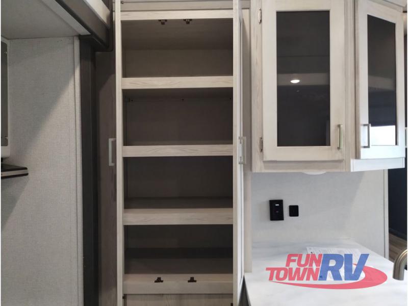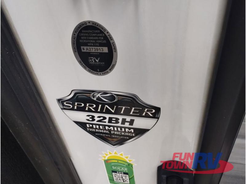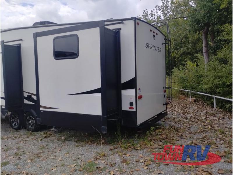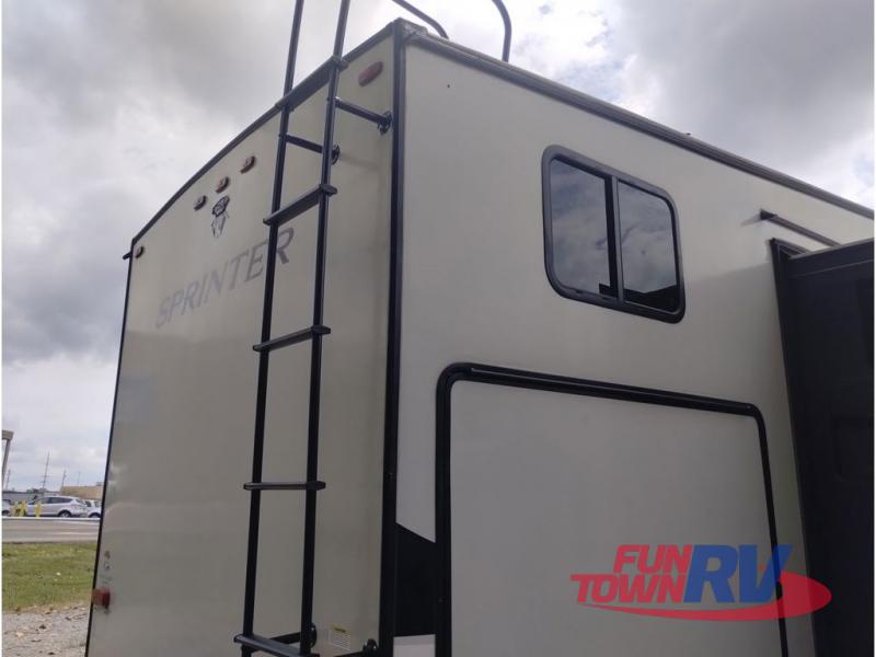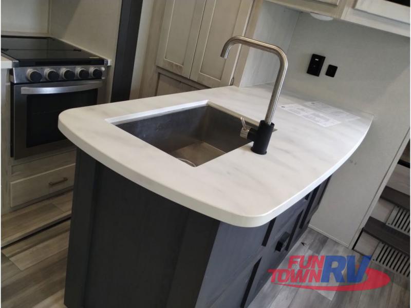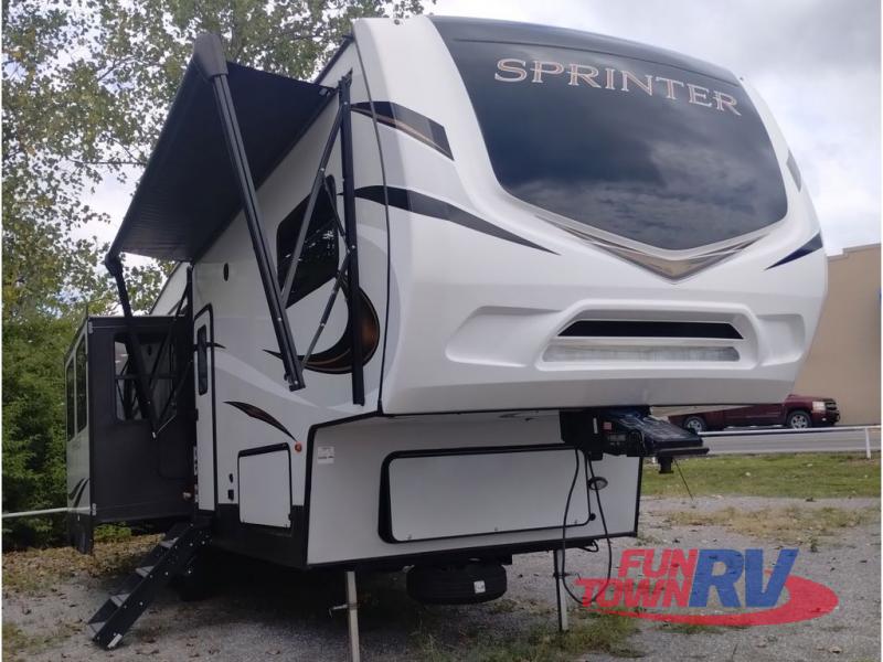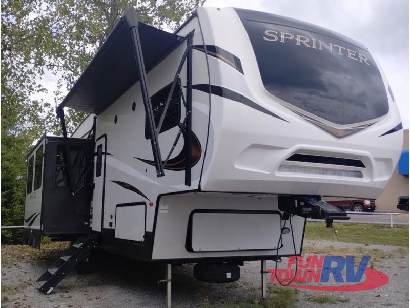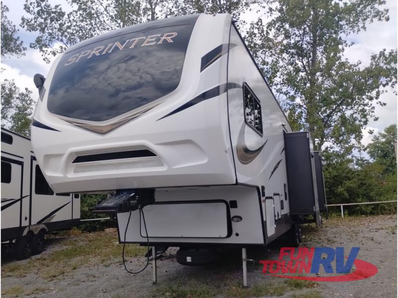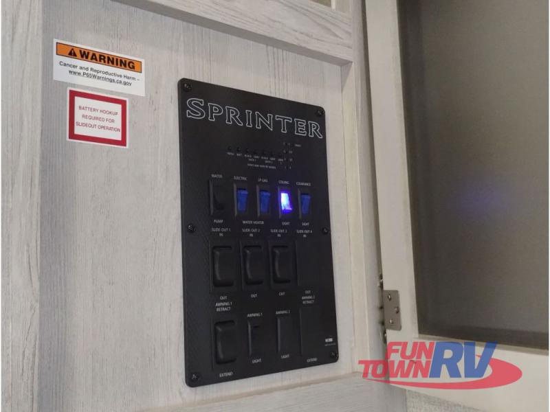 With any Sprinter fifth wheel by Keystone RV, you will have elements of a traditional RV lifestyle, Camping Made Easy features, and more living space, storage and towing stability in this longest-standing brand! The exterior includes a 100" wide-body frame with full width outriggers, MaxTurn technology with Road Armor suspension, Hitch Vision, an automotive-grade painted fiberglass front cap with KeyShield protection, plus the Thermal package and a heated and enclosed underbelly with astro-foil insulation for all-weather camping. There is a wireless remote control for slideouts, lights, awning and more, Thomas Payne theatre seating with USB, lights and massage, plus woven flooring that is highly durable marine-grade flooring for easy cleanup after a fun trip. Make your selection today!