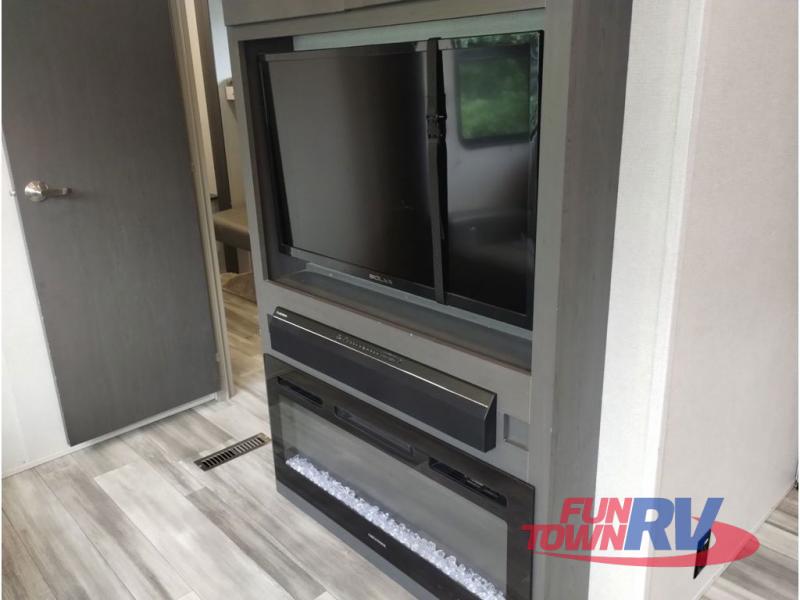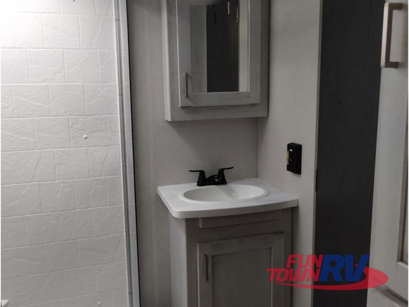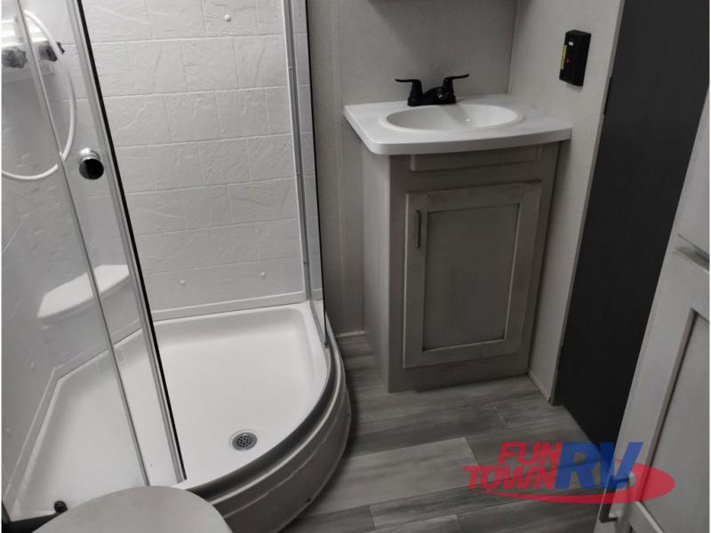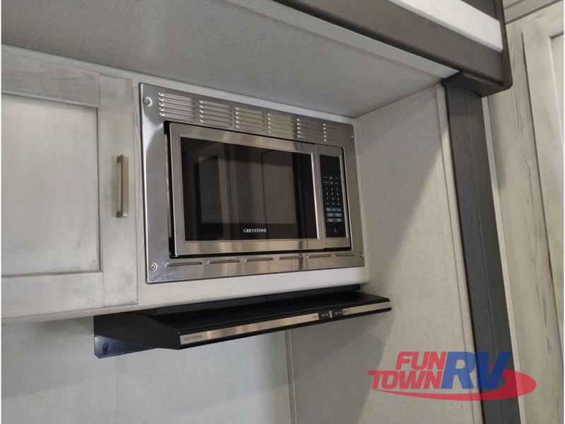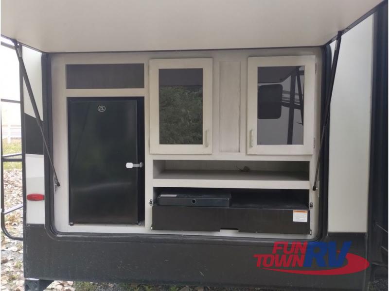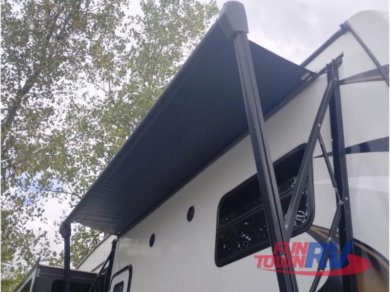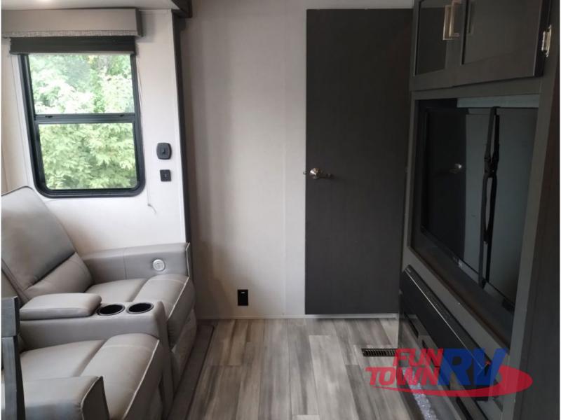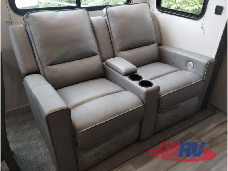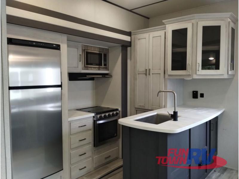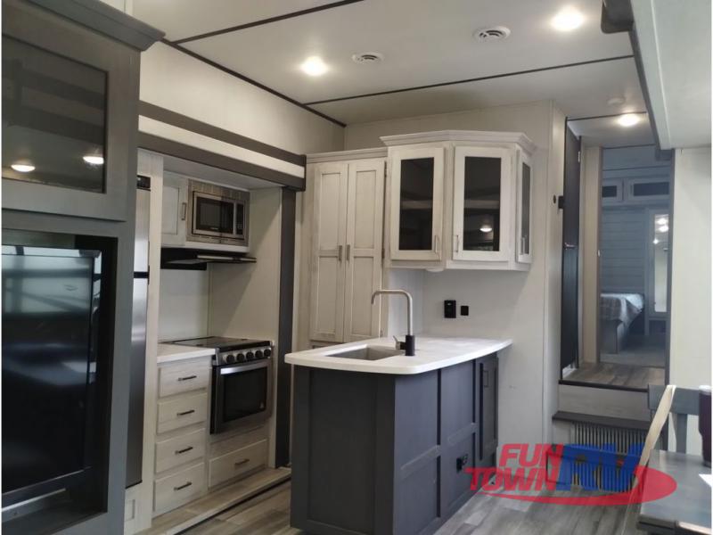 Explore new scenery with this fifth wheel at every campsite you have been wanting to visit! You can hike, fish or whatever you enjoy doing outdoors, and then relax and unwind inside with features that make you feel right at home. Beginning with the kids or your guests having their own privacy in the bunkhouse suite which includes a half bath, a slide out sleeper sofa with storage and a bunk above plus a second bunk. You will have a residential queen bed to sleep on in the front bedroom which also has two nightstands and outlets to keep your electronics charged, plus access to the full bathroom with a space savings radius shower. The kitchen and living area are spacious as well with two slides which include the three-burner gas range with glass top and 21" stainless steel oven, extra prep area, and a peninsula countertop with a single-basin stainless steel industrial sink to keep everything clean, plus the full reclining theatre seats with massage, lights and USB, and the booth dinette or choose the free standing option. And the exterior offers the cook an outdoor kitchen with a premium convenience center, plus you will enjoy the protection from the 15' electric awning, and the many more features inside and outside for convenience and comfort!
