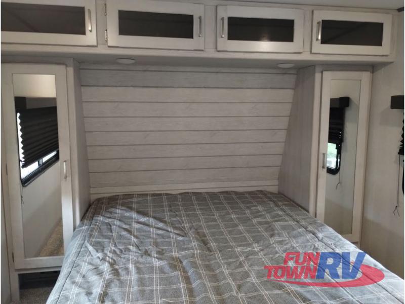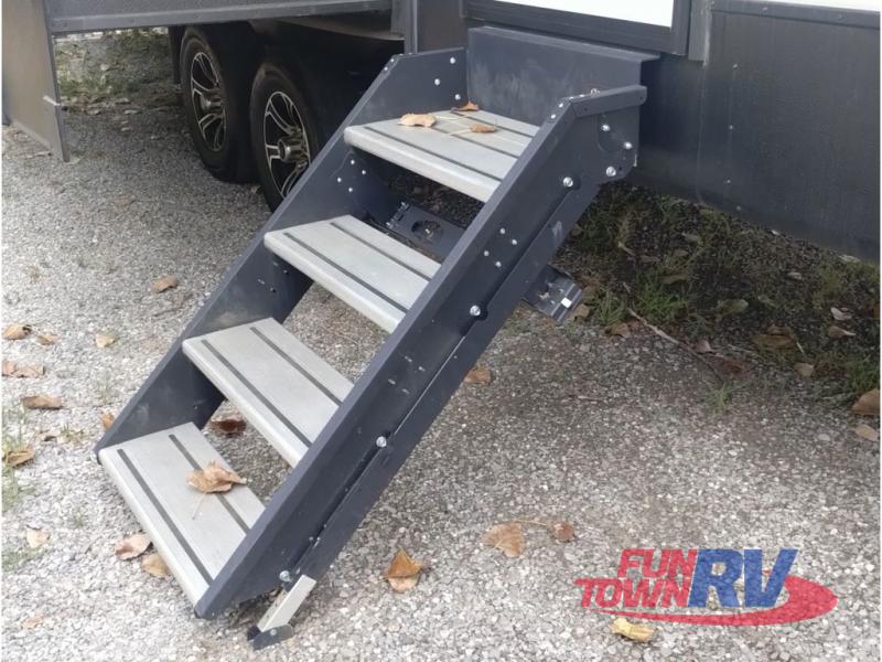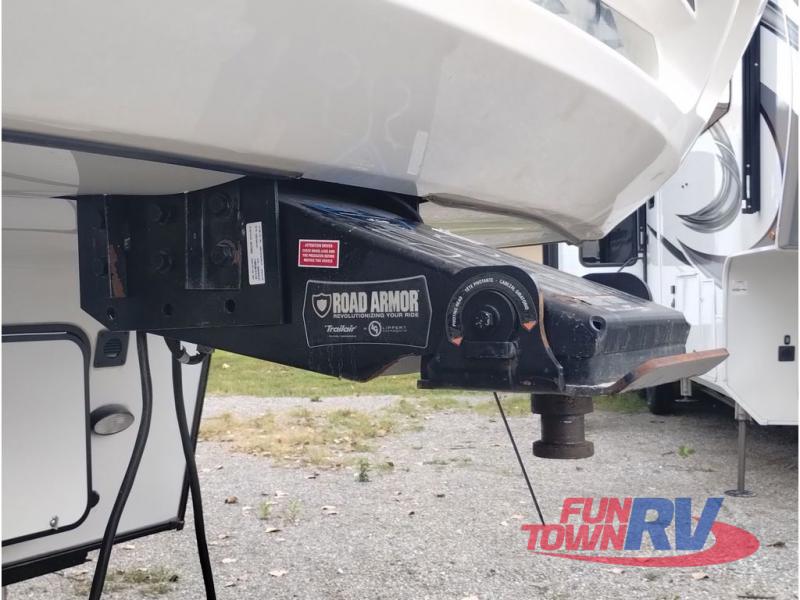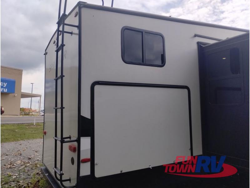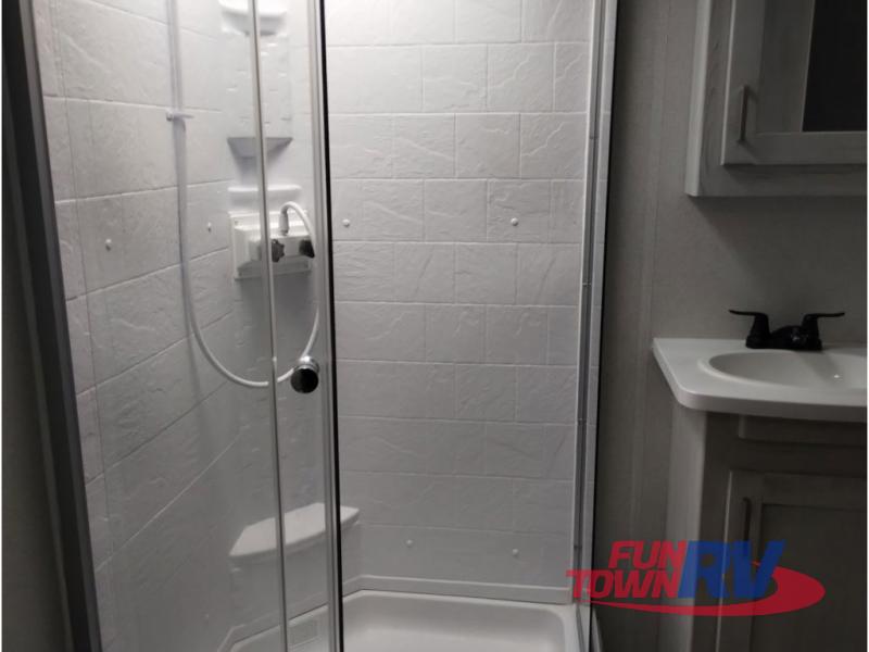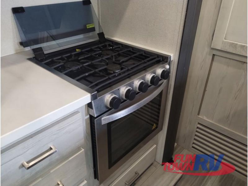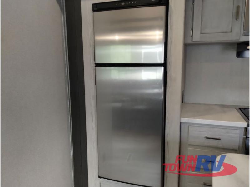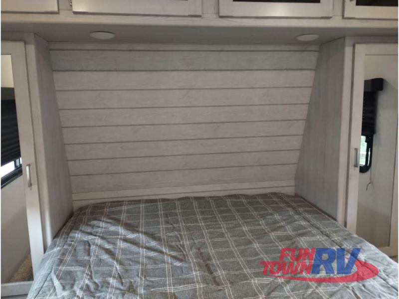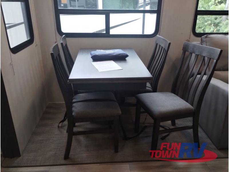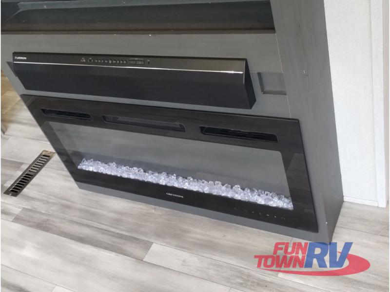Explore new scenery with this fifth wheel at every campsite you have been wanting to visit! You can hike, fish or whatever you enjoy doing outdoors, and then relax and unwind inside with features that make you feel right at home. Beginning with the kids or your guests having their own privacy in the bunkhouse suite which includes a half bath, a slide out sleeper sofa with storage and a bunk above plus a second bunk. You will have a residential queen bed to sleep on in the front bedroom which also has two nightstands and outlets to keep your electronics charged, plus access to the full bathroom with a space savings radius shower. The kitchen and living area are spacious as well with two slides which include the three-burner gas range with glass top and 21" stainless steel oven, extra prep area, and a peninsula countertop with a single-basin stainless steel industrial sink to keep everything clean, plus the full reclining theatre seats with massage, lights and USB, and the booth dinette or choose the free standing option. And the exterior offers the cook an outdoor kitchen with a premium convenience center, plus you will enjoy the protection from the 15' electric awning, and the many more features inside and outside for convenience and comfort!