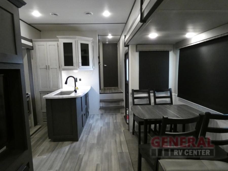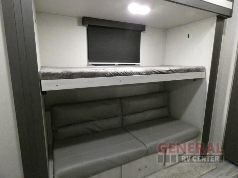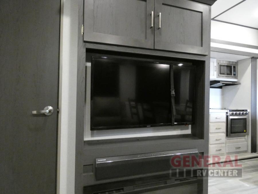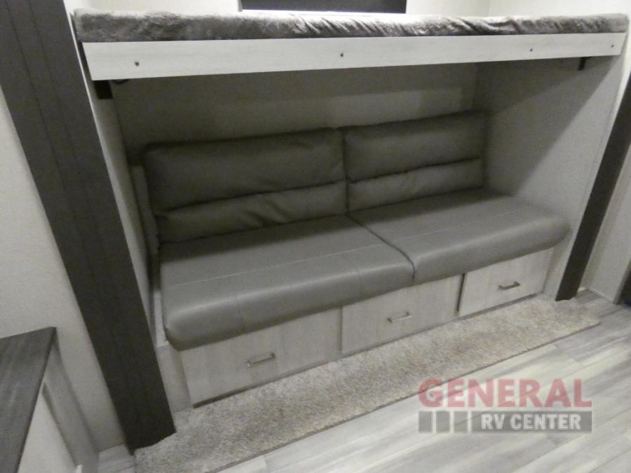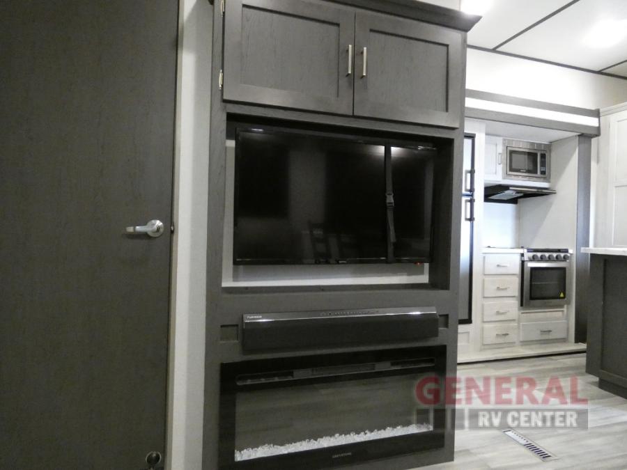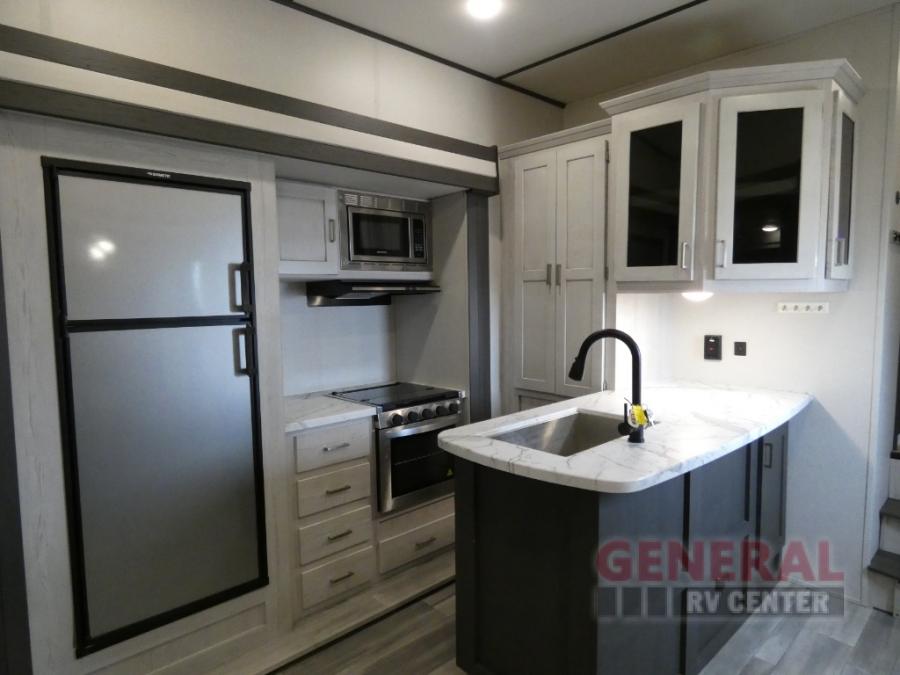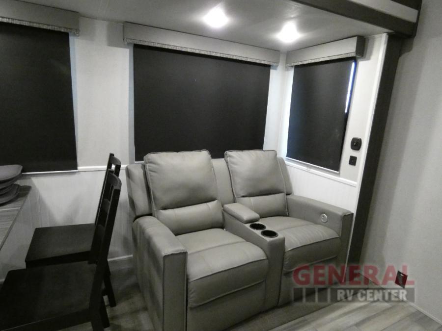 Explore new scenery with this fifth wheel at every campsite you have been wanting to visit! You can hike, fish or whatever you enjoy doing outdoors, and then relax and unwind inside with features that make you feel right at home. Beginning with the kids or your guests having their own privacy in the bunkhouse suite which includes a half bath, a slide out sleeper sofa with storage and a bunk above plus a second bunk. You will have a residential queen bed to sleep on in the front bedroom which also has two nightstands and outlets to keep your electronics charged, plus access to the full bathroom with a space savings radius shower. The kitchen and living area are spacious as well with two slides which include the three-burner gas range with glass top and 21" stainless steel oven, extra prep area, and a peninsula countertop with a single-basin stainless steel industrial sink to keep everything clean, plus the full reclining theatre seats with massage, lights and USB, and the free standing dinette. And the exterior offers the cook an outdoor kitchen with a premium convenience center, plus you will enjoy the protection from the 15' electric awning, and the many more features inside and outside for convenience and comfort!
