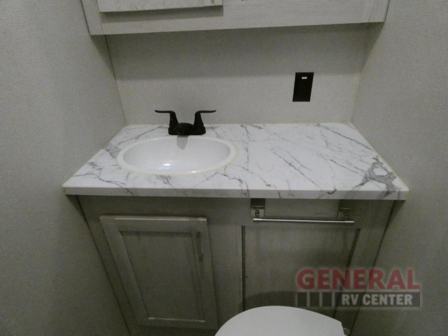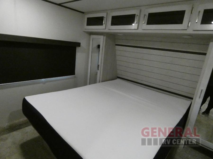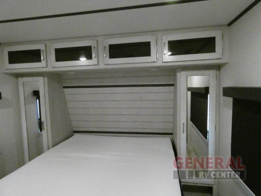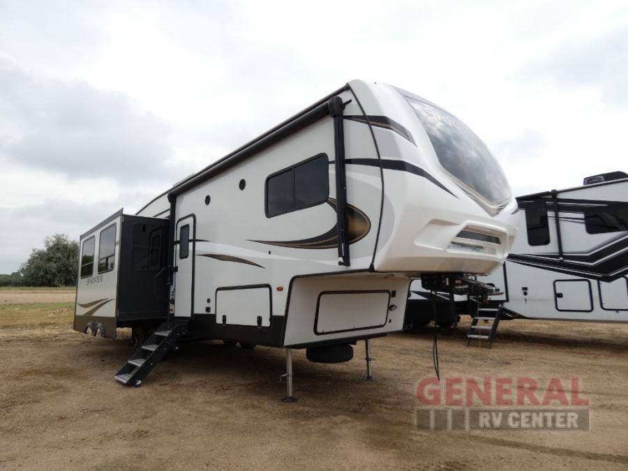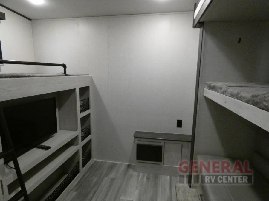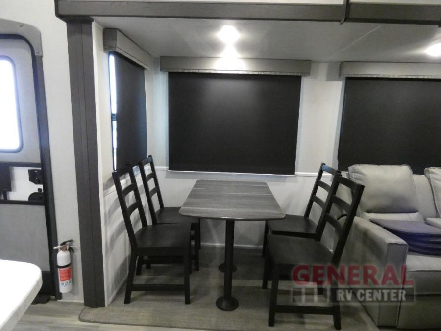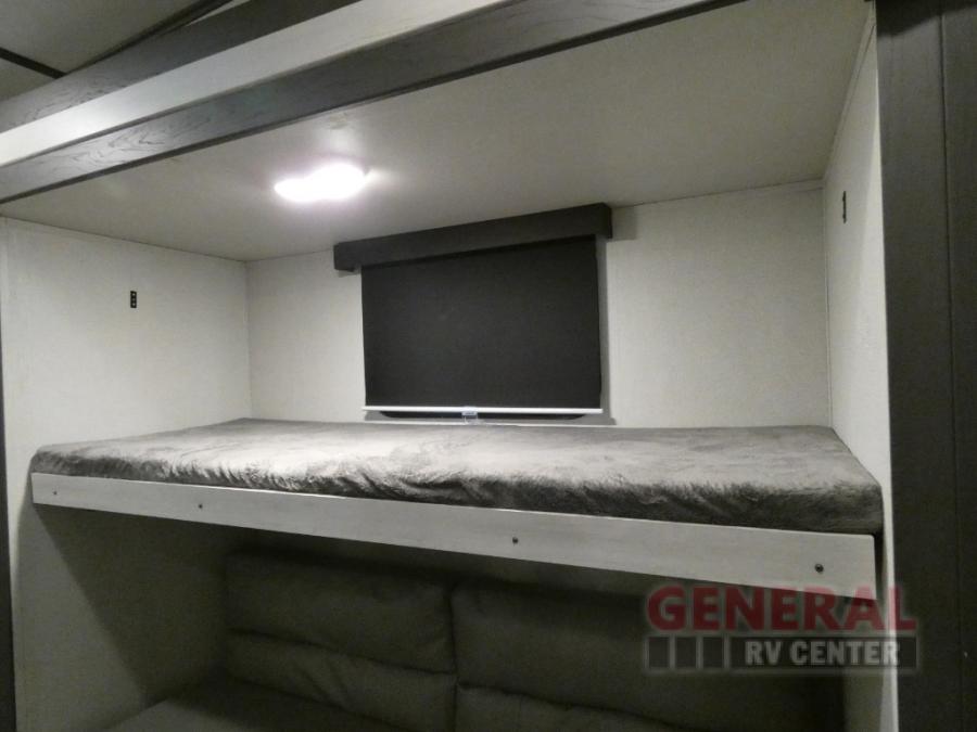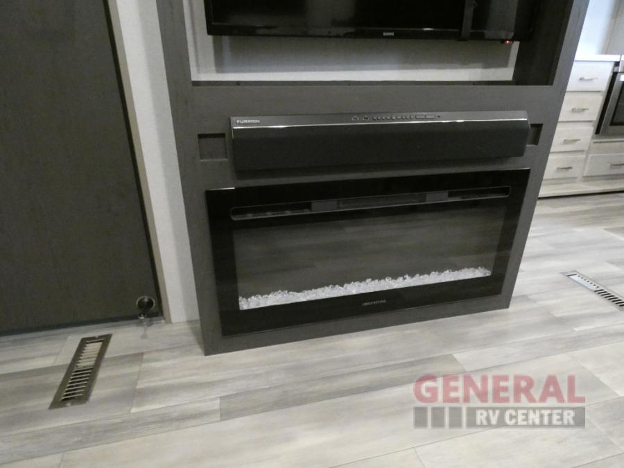 Explore new scenery with this fifth wheel at every campsite you have been wanting to visit! You can hike, fish or whatever you enjoy doing outdoors, and then relax and unwind inside with features that make you feel right at home. Beginning with the kids or your guests having their own privacy in the bunkhouse suite which includes a half bath, a slide out sleeper sofa with storage and a bunk above plus a second bunk. You will have a residential queen bed to sleep on in the front bedroom which also has two nightstands and outlets to keep your electronics charged, plus access to the full bathroom with a space savings radius shower. The kitchen and living area are spacious as well with two slides which include the three-burner gas range with glass top and 21" stainless steel oven, extra prep area, and a peninsula countertop with a single-basin stainless steel industrial sink to keep everything clean, plus the full reclining theatre seats with massage, lights and USB, and the free standing dinette. And the exterior offers the cook an outdoor kitchen with a premium convenience center, plus you will enjoy the protection from the 15' electric awning, and the many more features inside and outside for convenience and comfort!