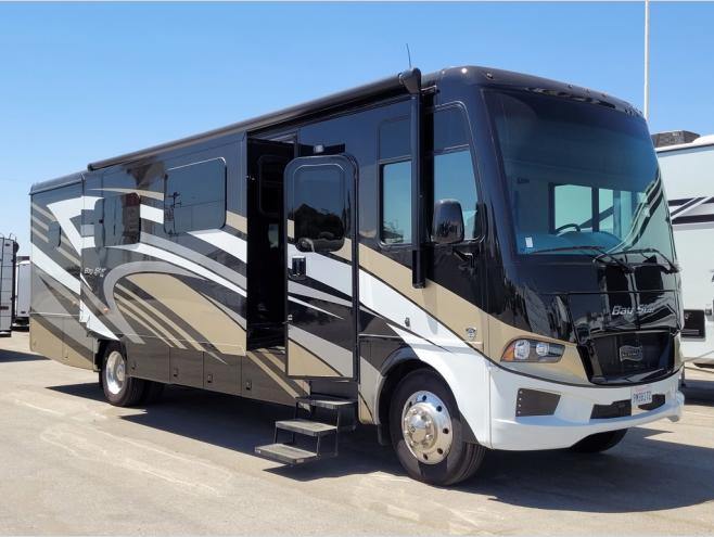Each Bay Star Class A gas motorhome by Newmar delivers a smooth ride thanks to the standard electronic stability control, along with the 7.3-liter V8 engine with 450 HP and 468 lb./ft. of torque and heavy duty sway bars. The exterior is sure to turn heads with its full-paint Masterpiece Finish, and you'll have three interior decor choices and three wood choices to truly make the coach your own. Each model includes newly styled Williamsburg furniture, luxurious vinyl tile flooring, polished solid surface countertops in the kitchen, plus many more comforts. Head outside to find lit basement storage, a 5.5kW Onan generator with remote switch, and smart level hydraulic leveling jacks with a Bluetooth compatible touch pad for set up easy as 1-2-3! You can further customize your coach with the many options that are offered, such as the optional exterior entertainment center, the optional fireplace in the living room, and the optional Whirlpool refrigerator to name a few!
