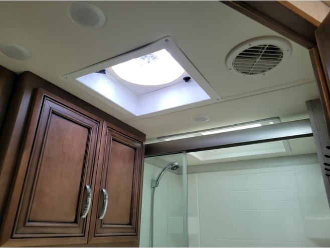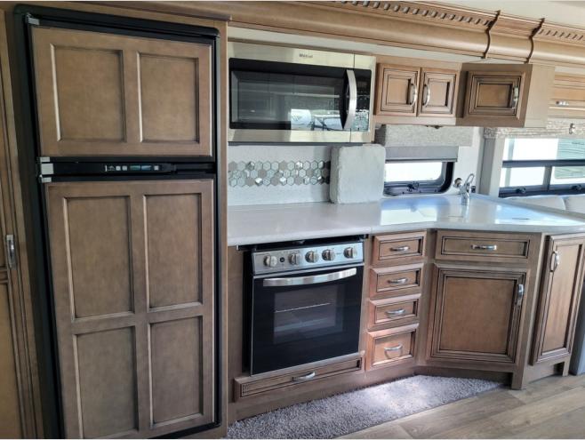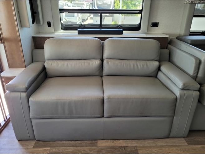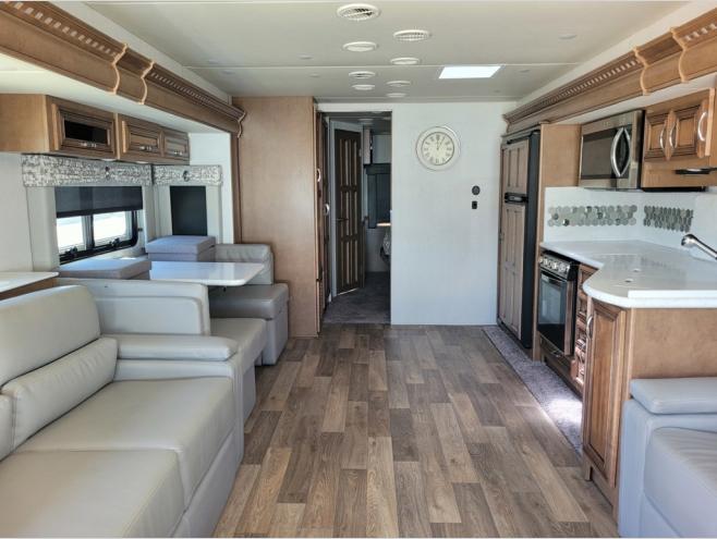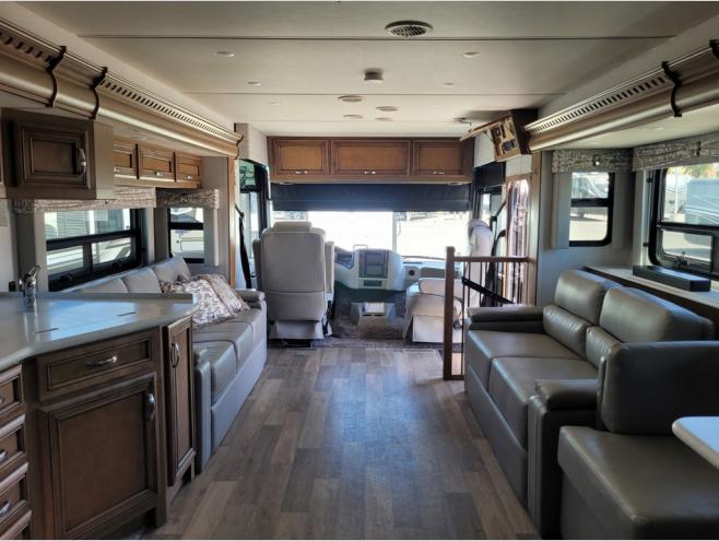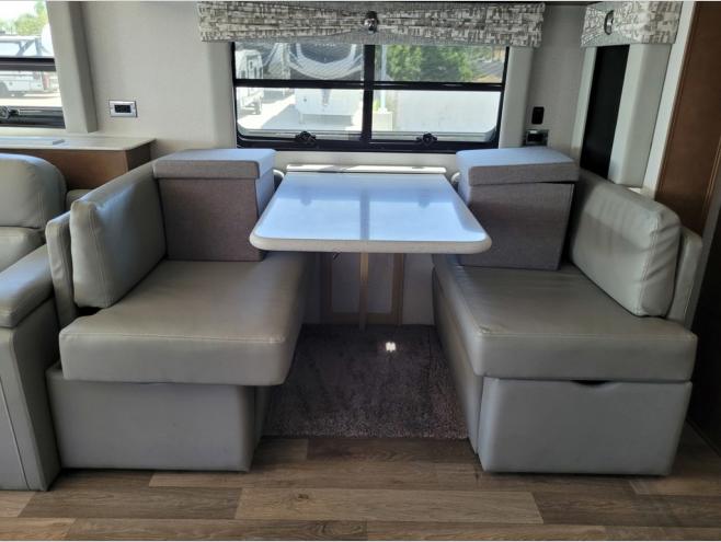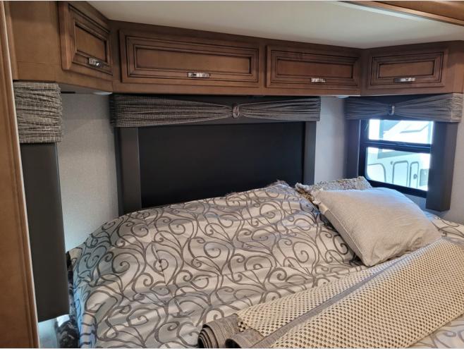 This motorhome with dual opposing slides in the main living area will provide your crew with tons of space to relax. You'll also find a slide out in the private bedroom suite, along with a king bed, a Samsung LED TV, and a shelf to store books or jewelry. There is a comfort lounge sofa, a booth dinette, and a tri-fold sofa in the main living area that will be perfect for guests, and the Samsung TV on power lift will allow you to enjoy movie night. In the morning, prepare breakfast on the recessed three burner cooktop before heading out for the day, and the full bath will allow you to clean up after a day outdoors!