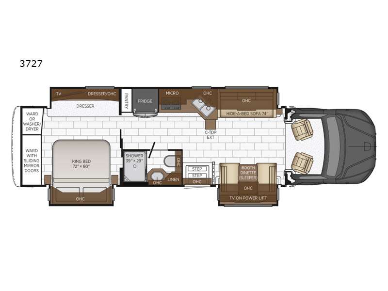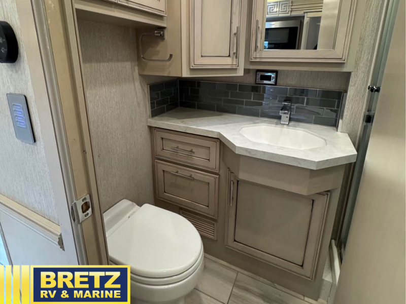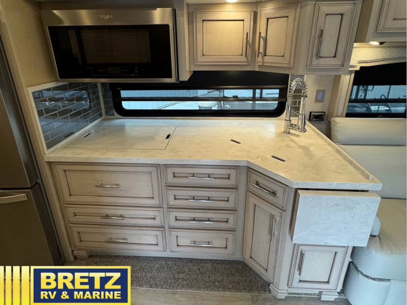 It won't be long before you've got the whole summer scheduled with trips in this Super Star Super C diesel motorhome! The living area is quite comfortable with its booth dinette and 74" hide-a-bed sofa, and while you're relaxing on the furniture you'll be right next to the kitchen so that you can converse with the chef. The countertop extension in the kitchen provides you with more space to chop veggies without taking up space in the walkway when not in use, and the 19.7-cubic foot refrigerator is certainly going to make it easy to bring all of your milk, yogurt, and juice. Across from the king bed in the bedroom is a large dresser that holds a TV, and if you add the optional washer/dryer to the bedroom wardrobe space, you can do laundry on the weekends.