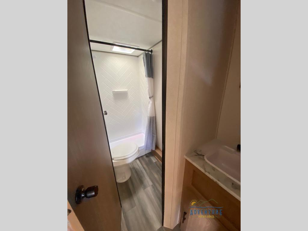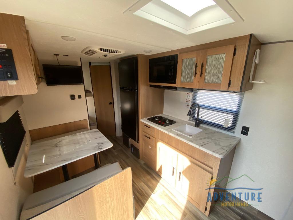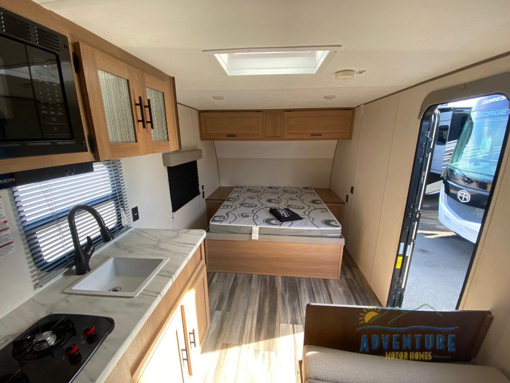 Bring along those board games and soccer balls for the kids with convenient space in the oversized pass-through storage. The power awning on this trailer gives you a covered outdoor living area to enjoy, just grab your camping chairs. The kitchen comes with a pantry to store your dry goods and a beautiful skylight that gives natural lighting as you cook for your family and friends. You will also have your own walk-around queen bed up front to quickly fall asleep on, and there is a wardrobe on each side allowing you to keep your items nearby. And you know the kids or your guests will appreciate having double-size bunks next to the full bathroom.