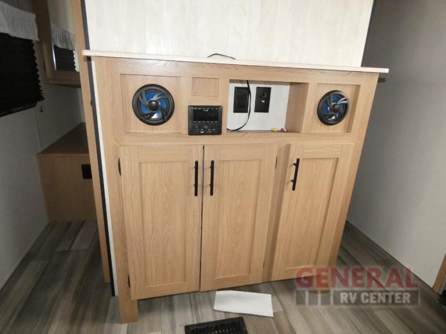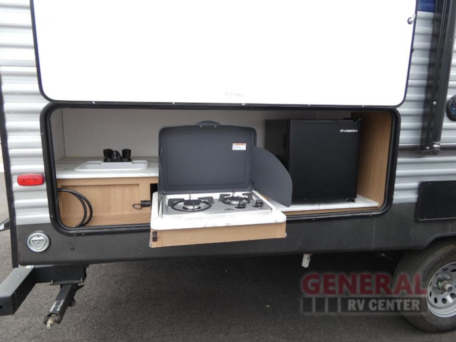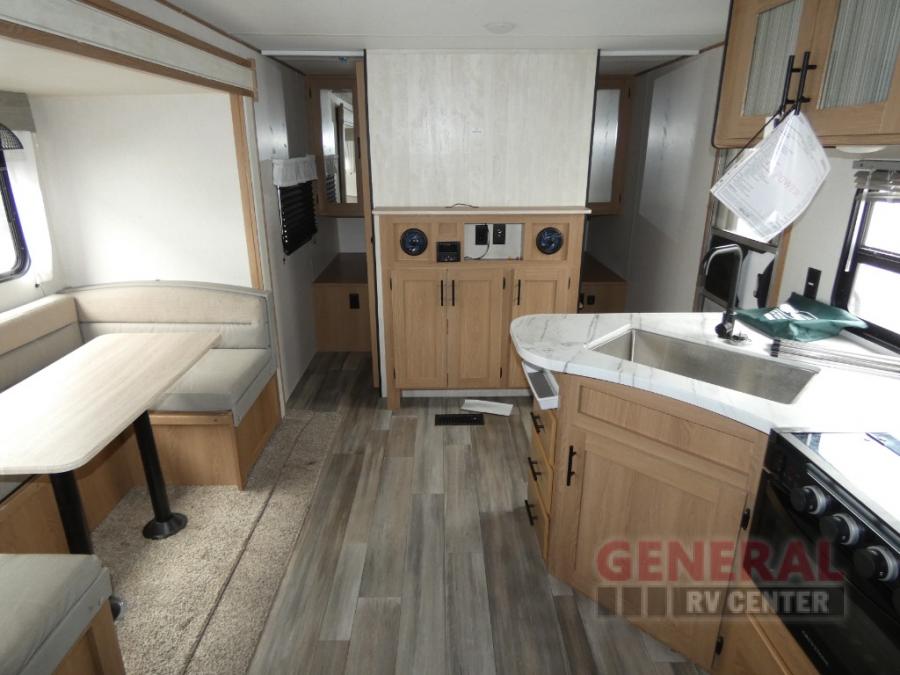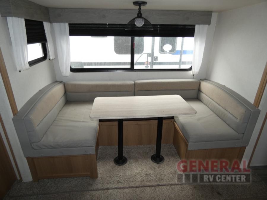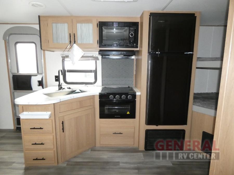 Gather the crew, load up and head out to enjoy a long-weekend at the state park or your main RV park that you like to meet up with friends. This trailer offers sleeping accommodations for eight because of the double-size bunks, the U-shaped dinette, and the queen bed. There is a rear corner full bathroom with a shower curtain on a curved track providing more elbow room. You will find full kitchen amenities inside, as well as an outdoor kitchen where you can watch the kids play while making dinner. The single slide provides more living space in the interior, as well as extra sleeping space on the U-shaped dinette.