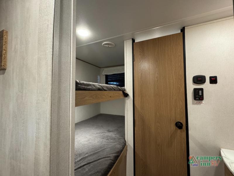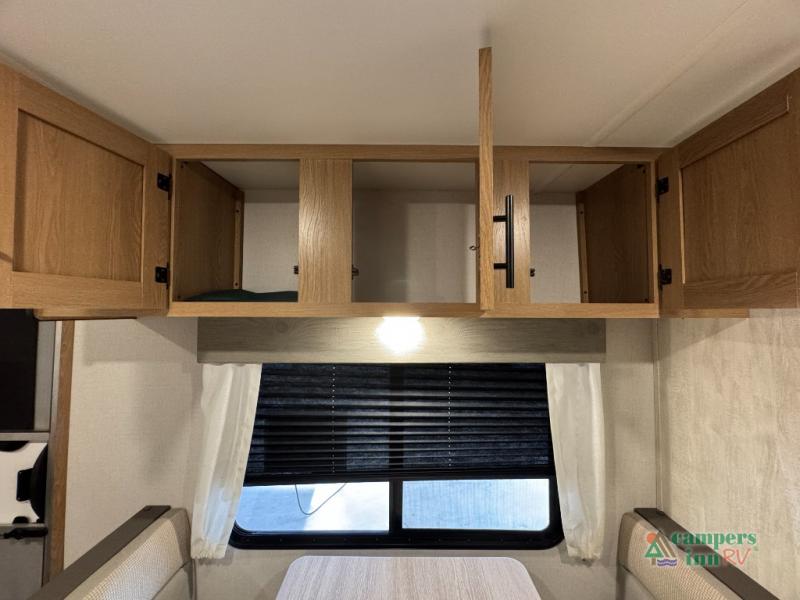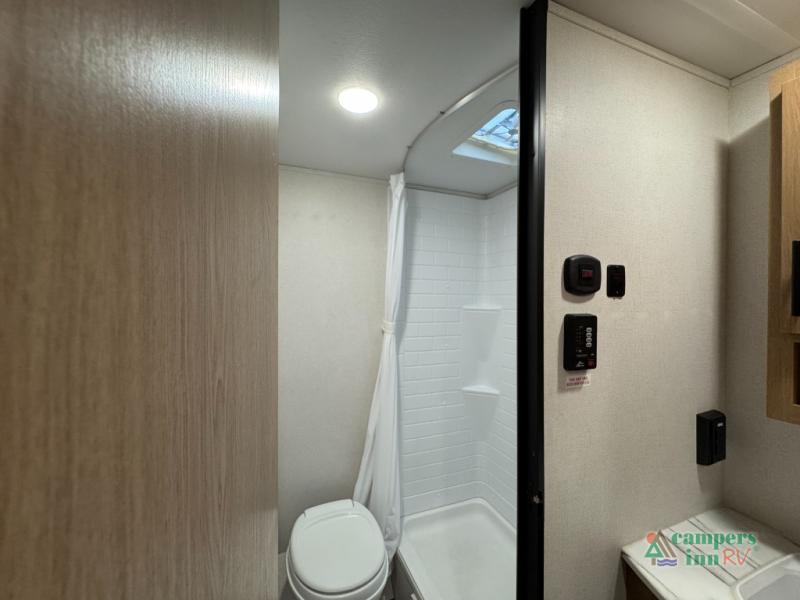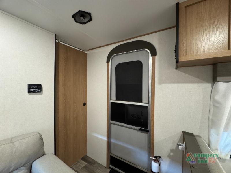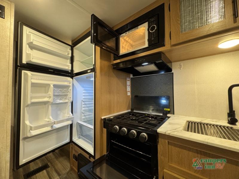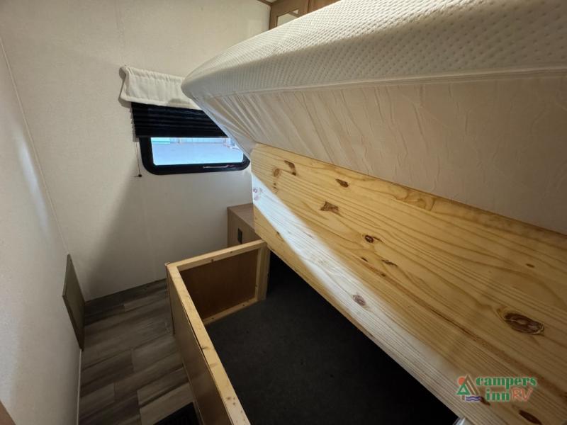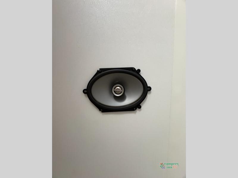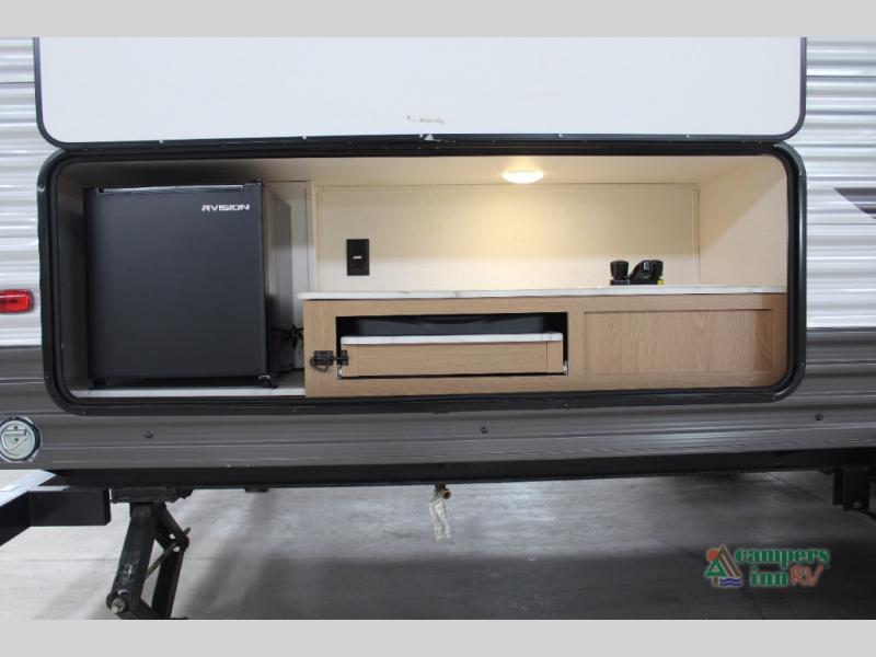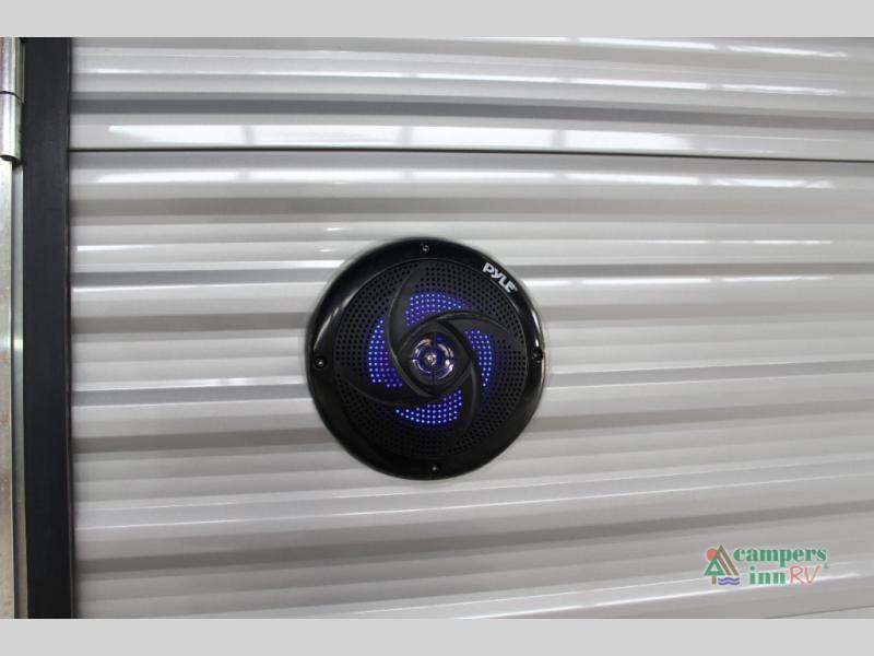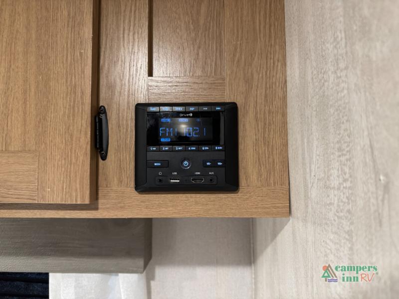 The cook is going to enjoy having choices for every meal, whether to use the full kitchen amenities inside or the outdoor kitchen while visiting with others relaxing under the 13' power awning. With the inclusion of a walk-around queen bed in the front bedroom, plus the sofa and booth dinette in the combined kitchen and living area, and the double-size bunks next to the bathroom sink and private toilet and toilet room, there is plenty of room to sleep eight or nine people each night. And the power awnings plus outdoor speakers give you an additional living area for everyone.
