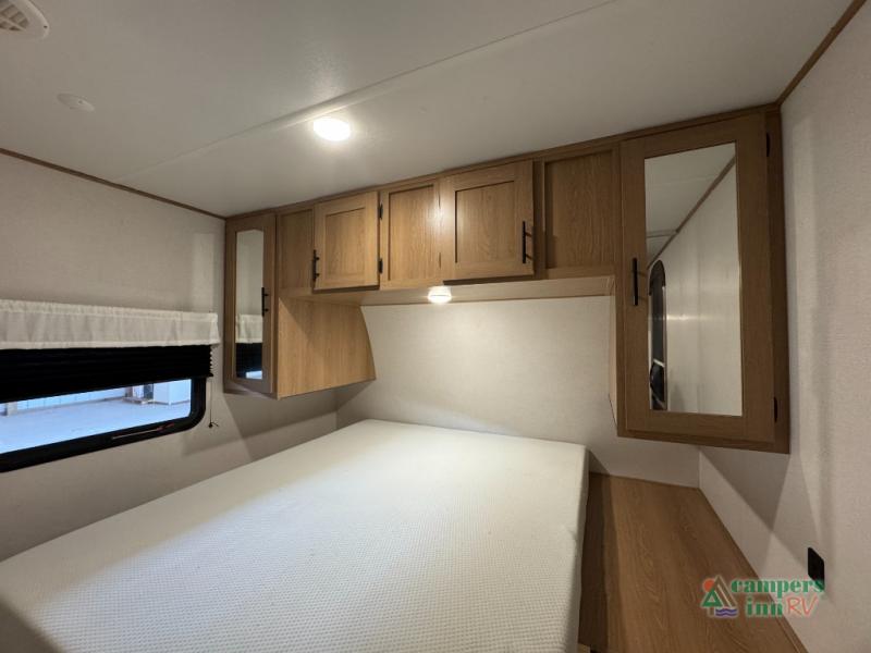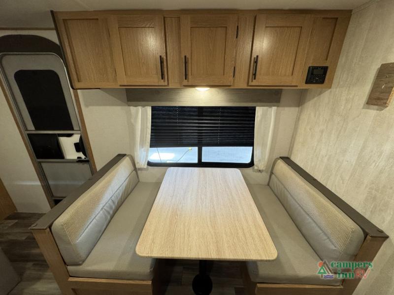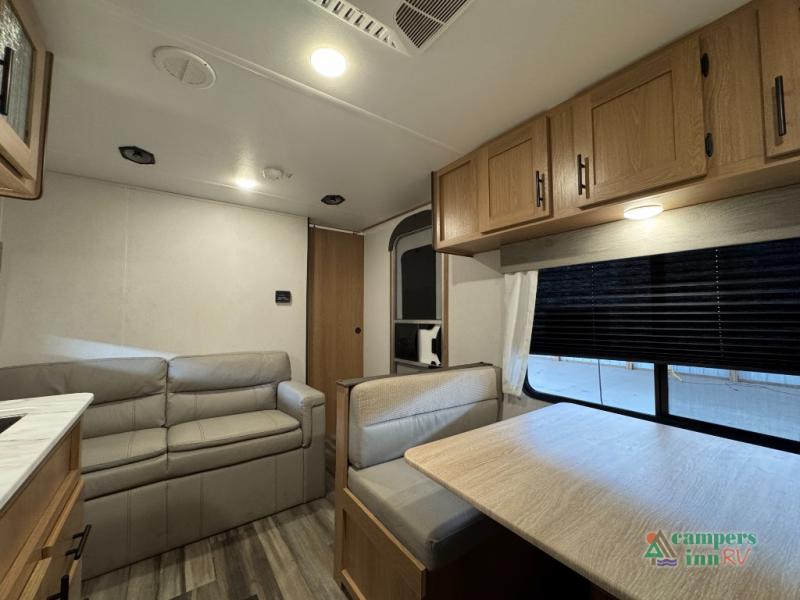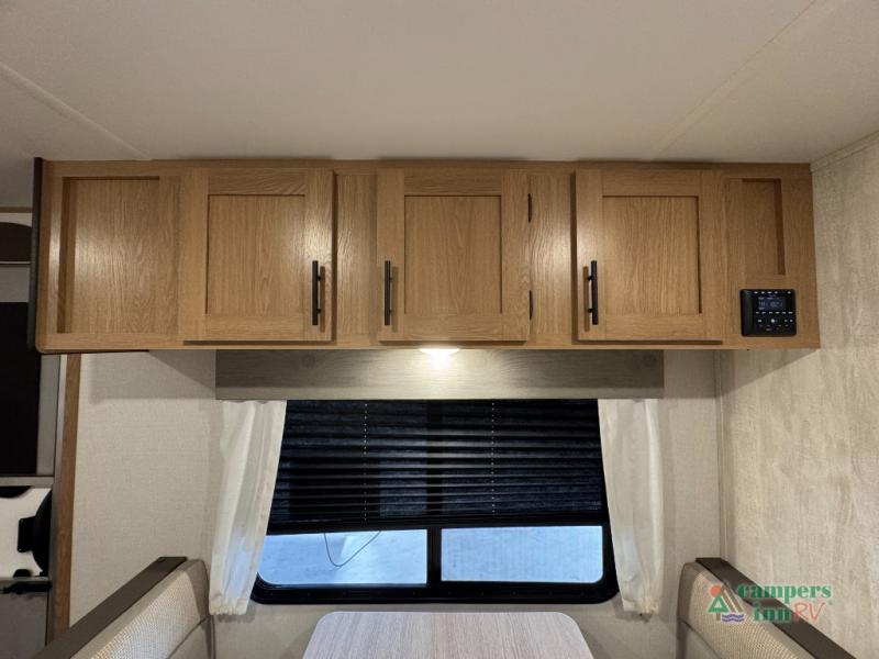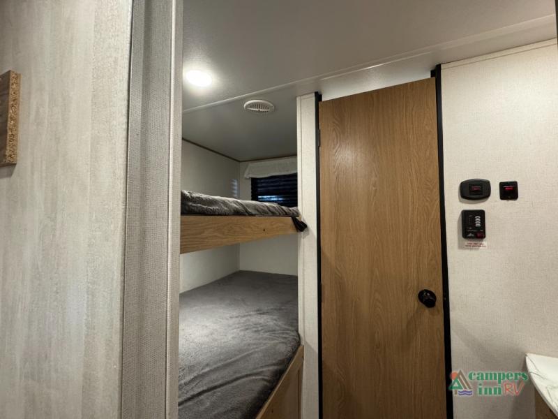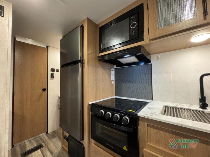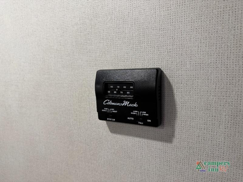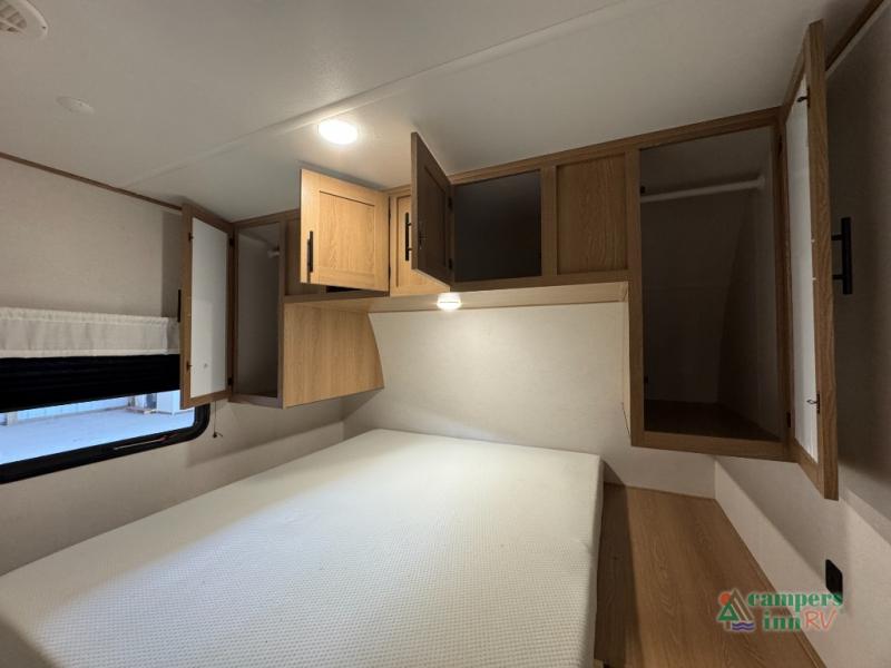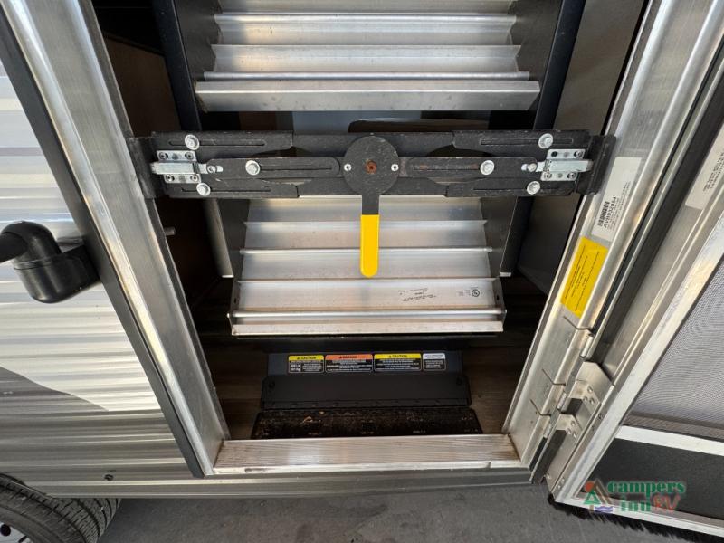 The cook is going to enjoy having choices for every meal, whether to use the full kitchen amenities inside or the outdoor kitchen while visiting with others relaxing under the 13' power awning. With the inclusion of a walk-around queen bed in the front bedroom, plus the sofa and booth dinette in the combined kitchen and living area, and the double-size bunks next to the bathroom sink and private toilet and toilet room, there is plenty of room to sleep eight or nine people each night. And the power awnings plus outdoor speakers give you an additional living area for everyone.
