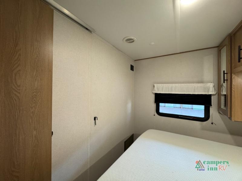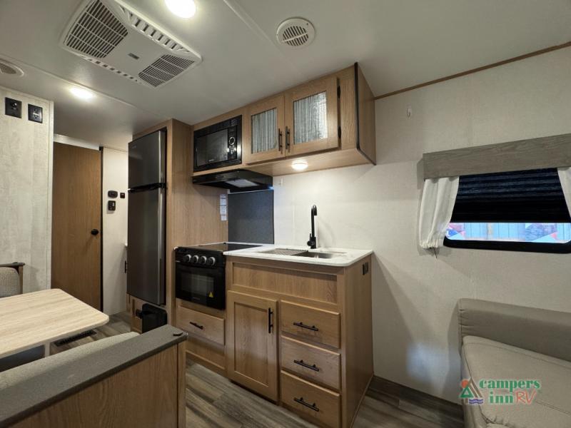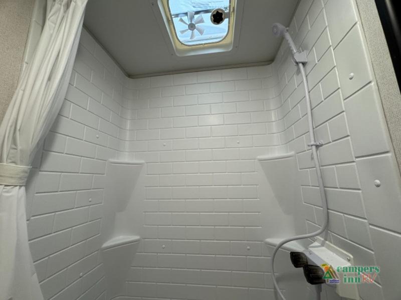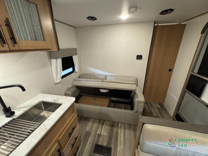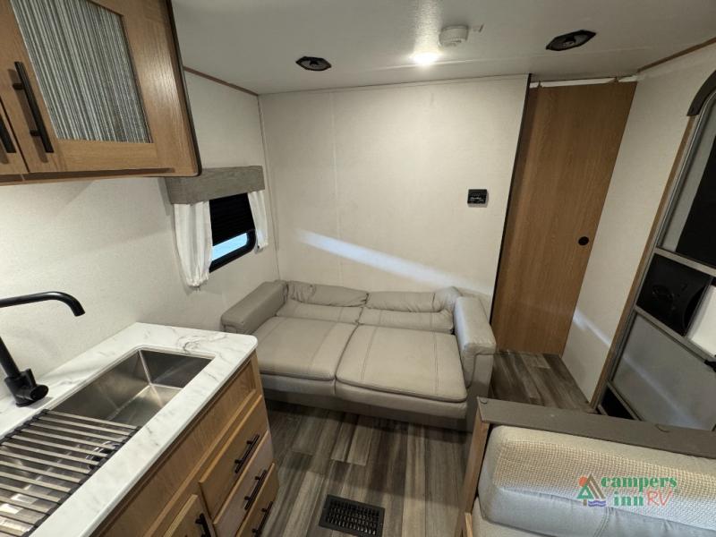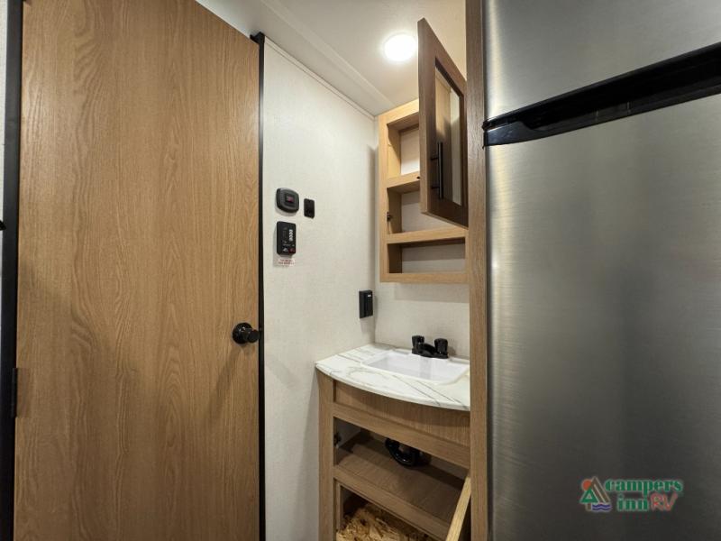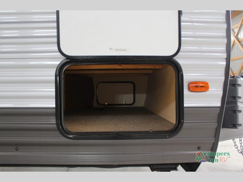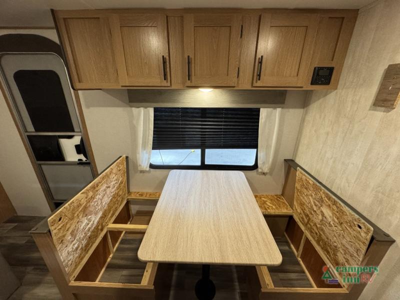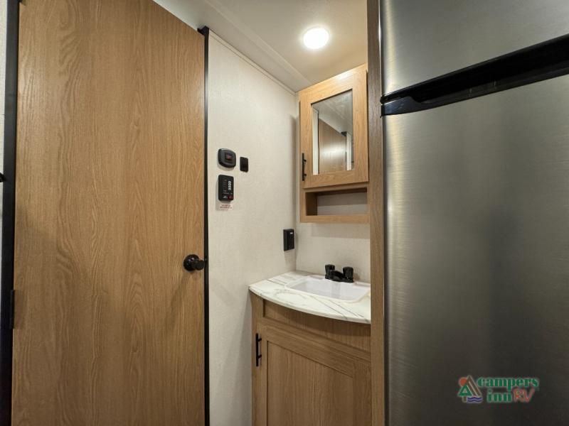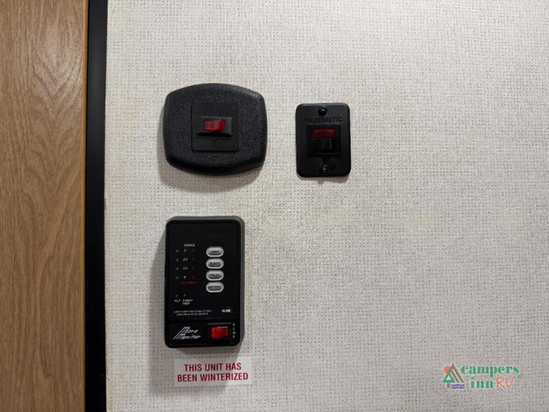 The cook is going to enjoy having choices for every meal, whether to use the full kitchen amenities inside or the outdoor kitchen while visiting with others relaxing under the 13' power awning. With the inclusion of a walk-around queen bed in the front bedroom, plus the sofa and booth dinette in the combined kitchen and living area, and the double-size bunks next to the bathroom sink and private toilet and toilet room, there is plenty of room to sleep eight or nine people each night. And the power awnings plus outdoor speakers give you an additional living area for everyone.