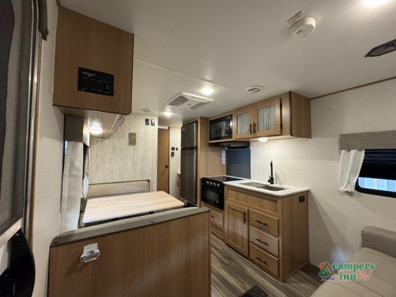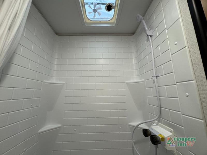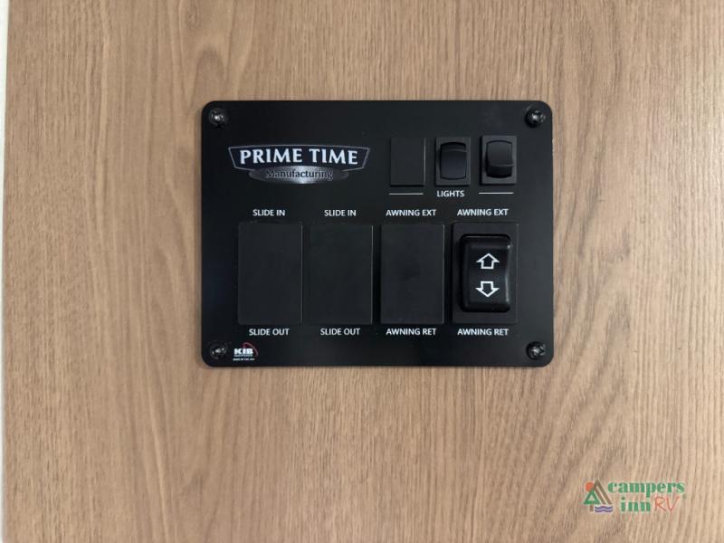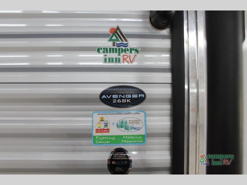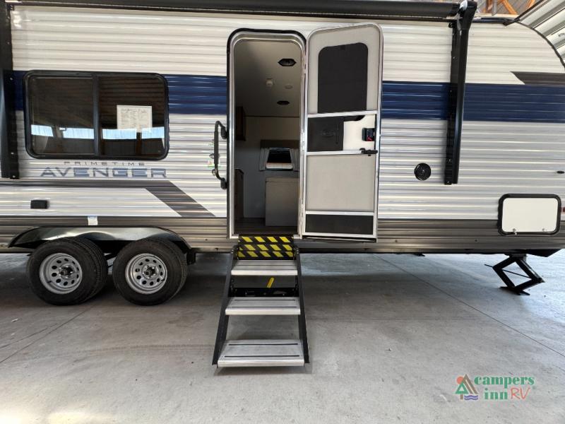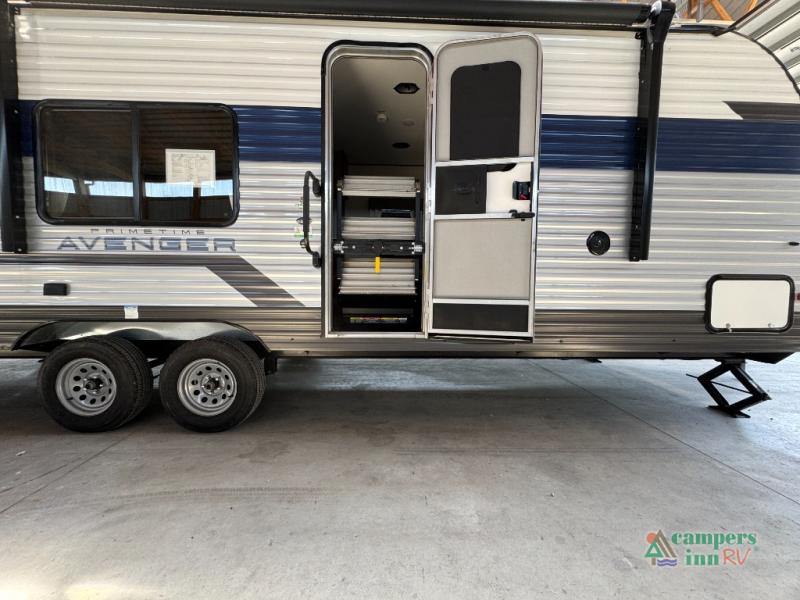 With any Avenger or Avenger LE travel trailer by Prime Time, the exterior includes an aerodynamic radius front profile, a diamond plate front rock guard for protection on the road, a power tongue jack for easy setup, and four stabilizer jacks. There is an aluminum exterior skin, a walk-on roof with decking, and an Extreme Weather package plus enclosed underbelly. The interior offers a 13,500 BTU air conditioner for the perfect climate inside, in-floor ducted heat, a systems monitor panel, and a Bluetooth entertainment system plus more depending on the travel trailer you choose to begin your outdoor adventure with.