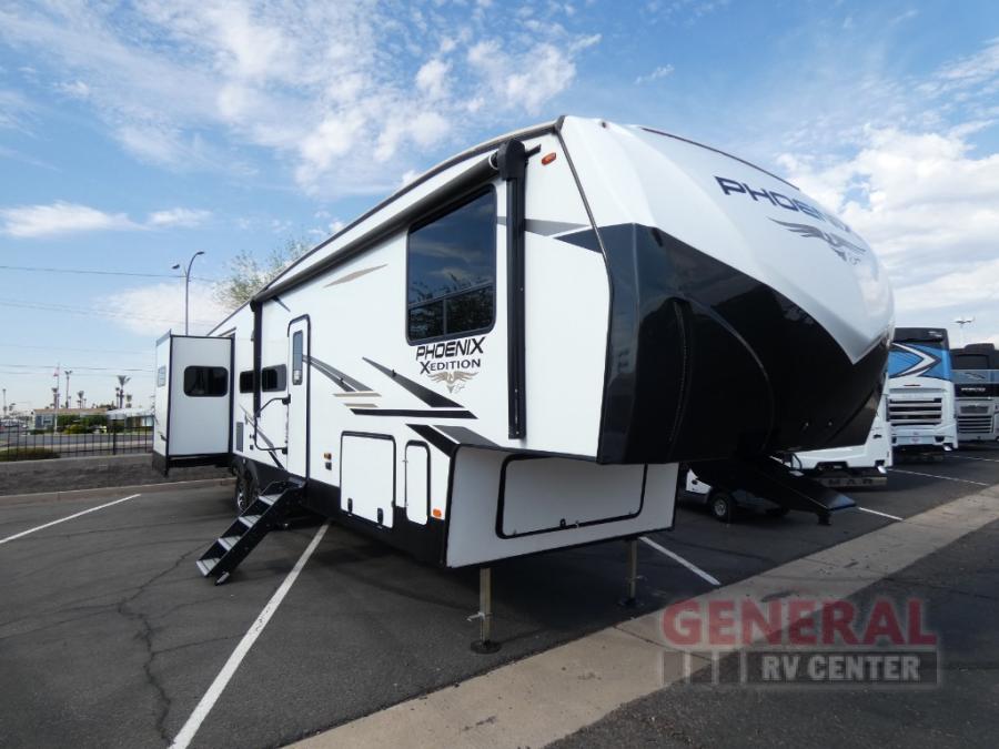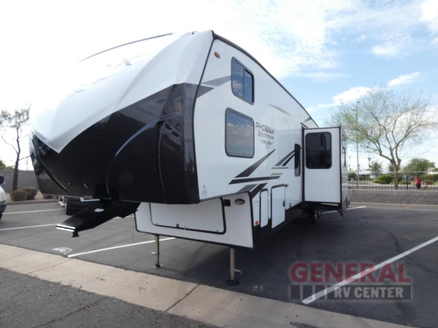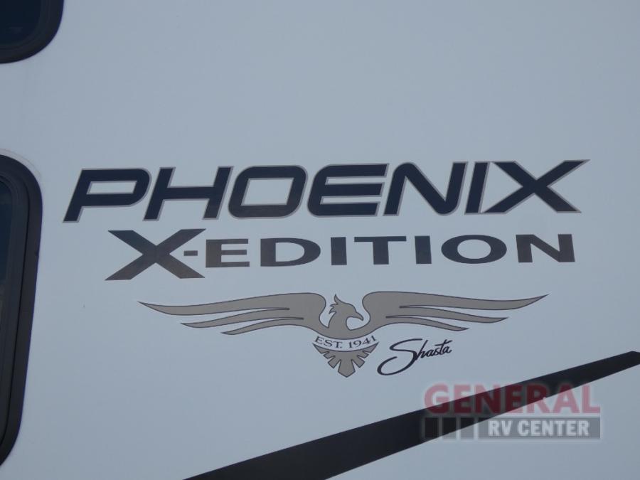 With any Phoenix X-Edition fifth wheel by Shasta RVs, the interior offers modern features and style from the modern entertainment center prepped for a 50" TV, the coordinating decorative slide out fascia, the decorative, modern window box valances/lambrequins, the motion sensor light in the bathroom, and the durable and seamless Thermofoil, granite/marble style counters that are heat resistant. The stand out construction features include residential 5" truss rafters, full walk-on roof decking, vacuum bonded and aluminum framed sidewalls with rot proof AZDEL composite sidewall panels, a six-layer, bonded and aluminum framed main floor structure, and Weather Shield+ that offers cold and hot testing, space age reflective technology, a ducted furnace to an enclosed, insulated and heated underbelly and more so you can camp during any season. Never give up luxury and high-end features when you camp, choose a Phoenix X-Edition!