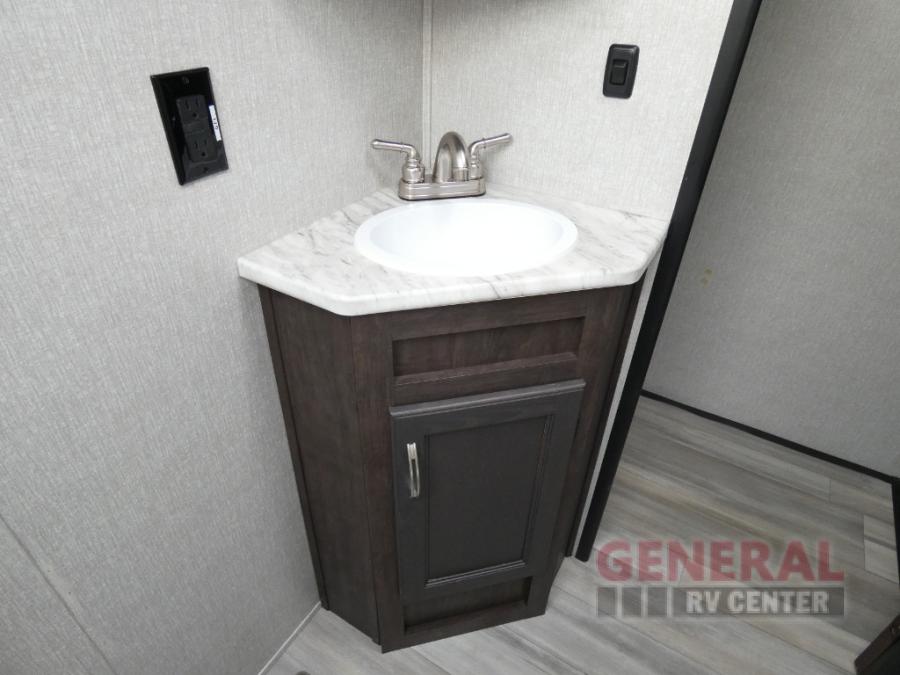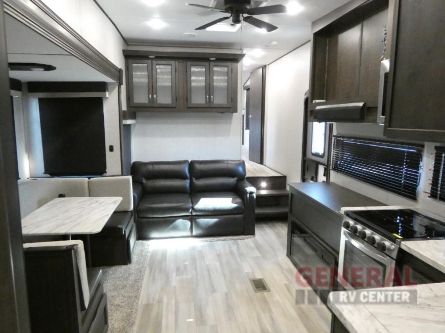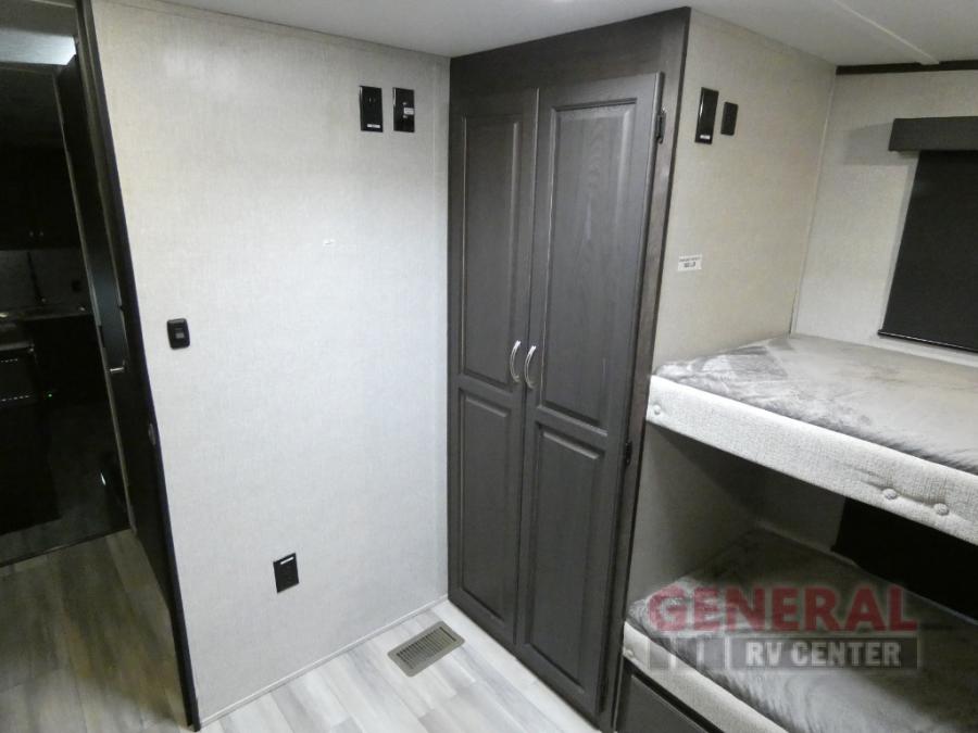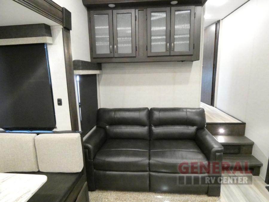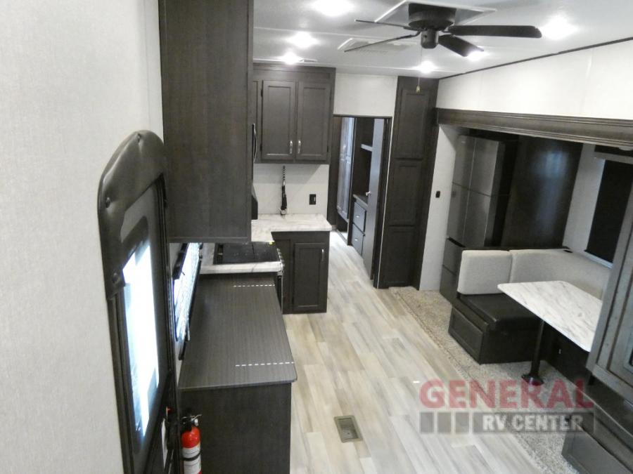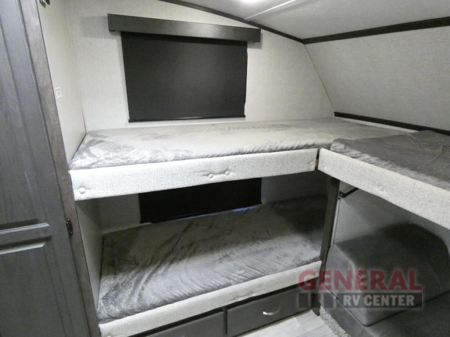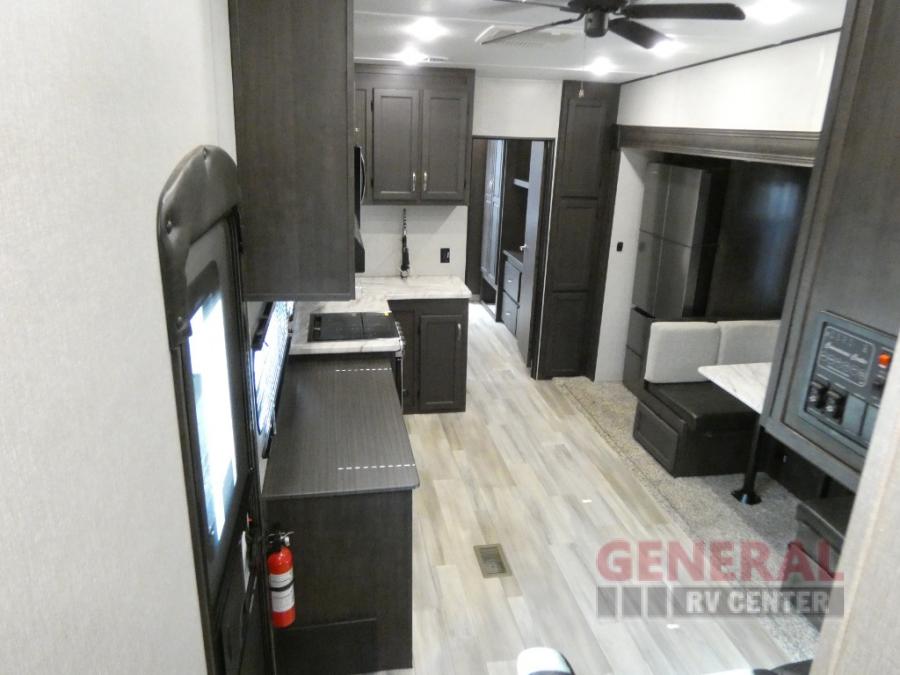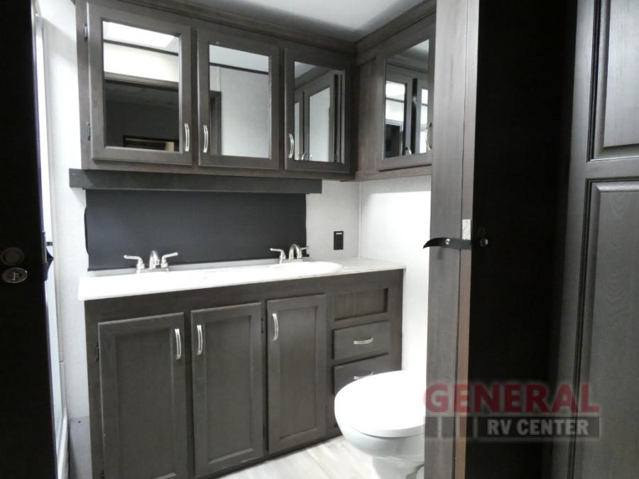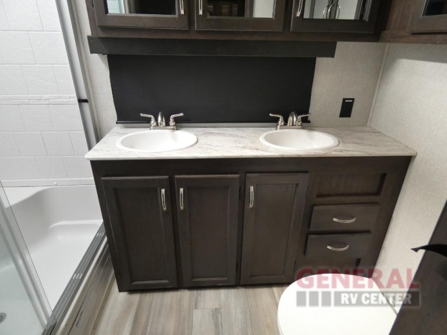 Comfort, convenience and lots of amenities are found in this fifth wheel! So when you are ready to escape to luxury with new scenery, hitch up and head out. The master suite offers a queen bed slide, clothing storage, and a rear full bathroom complete with a shower including a seat and glass sliding doors, plus two sinks to easily get ready in the morning. The kids or your friends will have their own space up front in the bunkhouse that offers three bunk beds, a hide-a-bed cube sofa to relax and even sleep on, plus a wardrobe. The second full bathroom is in the hallway between the bunkhouse and the main living and kitchen area.