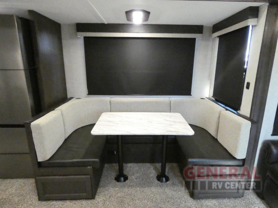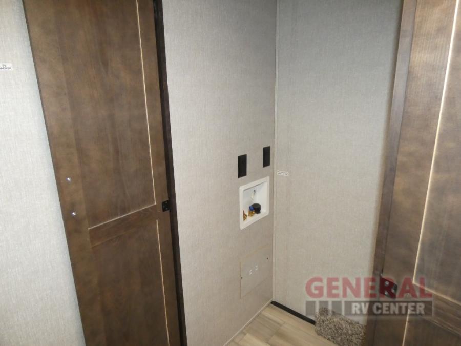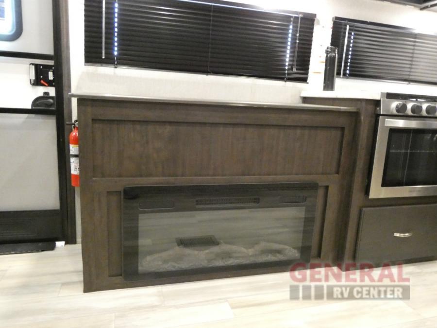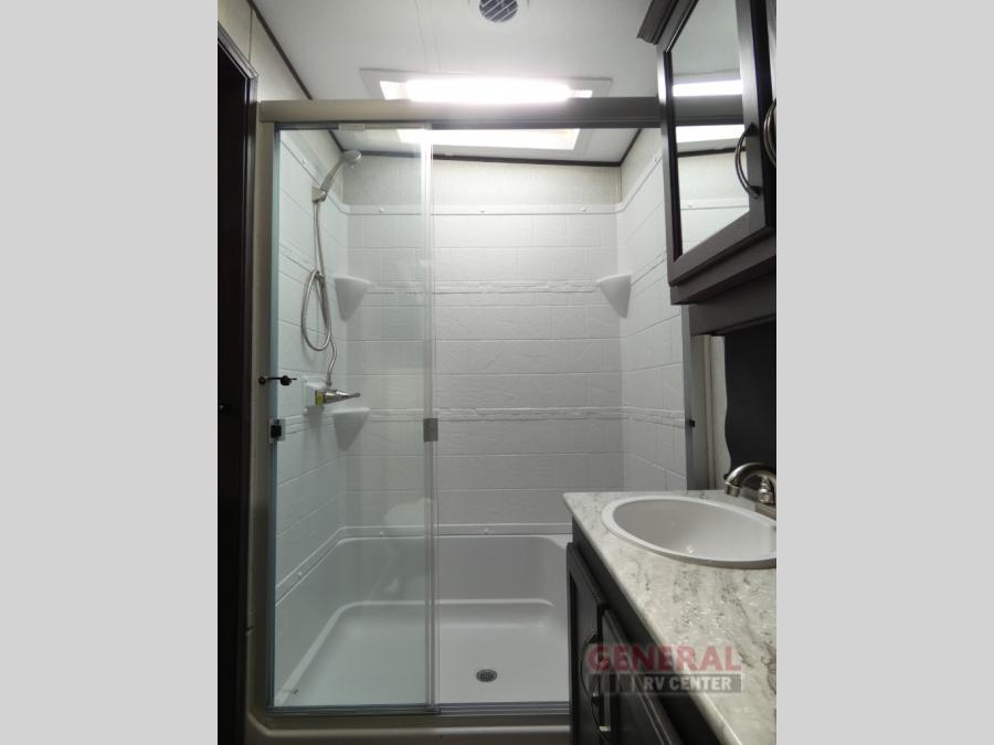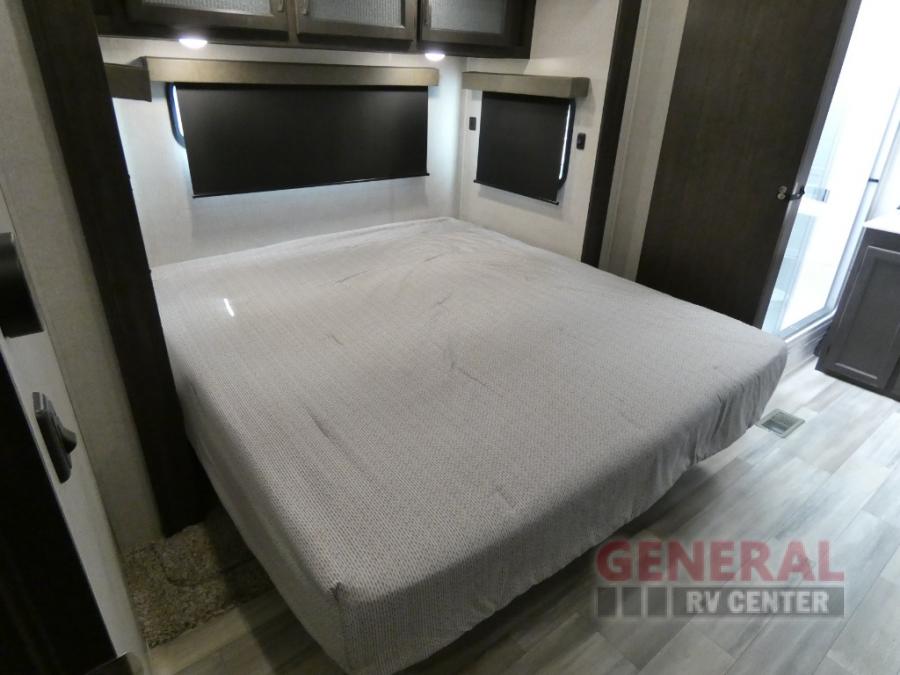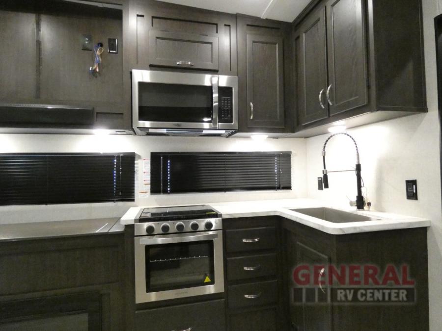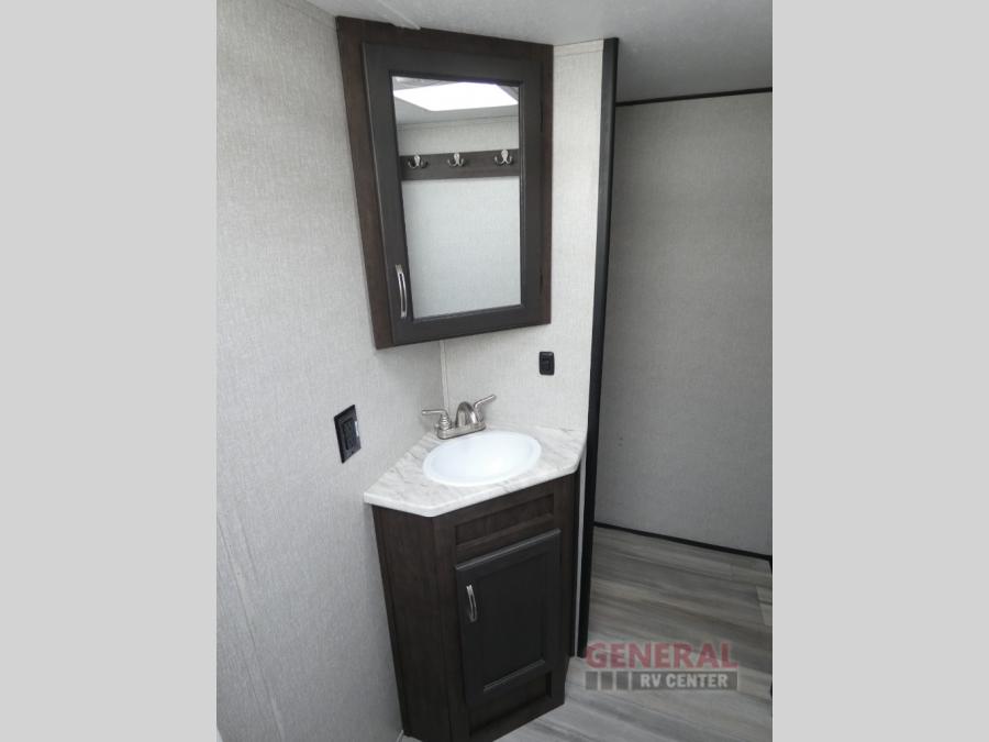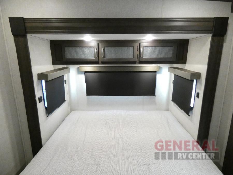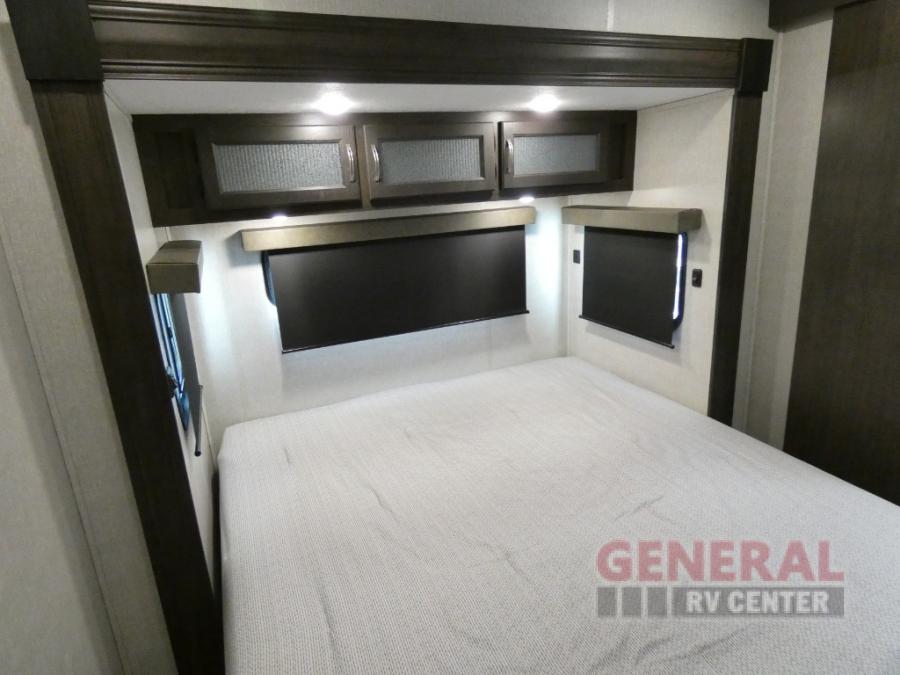 Comfort, convenience and lots of amenities are found in this fifth wheel! So when you are ready to escape to luxury with new scenery, hitch up and head out. The master suite offers a queen bed slide, clothing storage, and a rear full bathroom complete with a shower including a seat and glass sliding doors, plus two sinks to easily get ready in the morning. The kids or your friends will have their own space up front in the bunkhouse that offers three bunk beds, a hide-a-bed cube sofa to relax and even sleep on, plus a wardrobe. The second full bathroom is in the hallway between the bunkhouse and the main living and kitchen area.