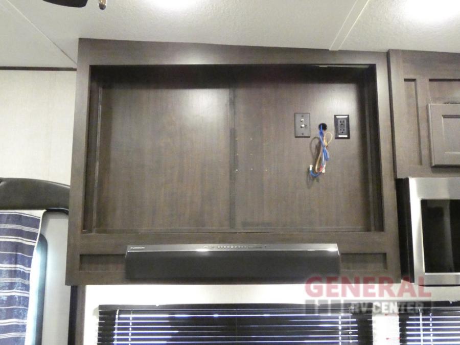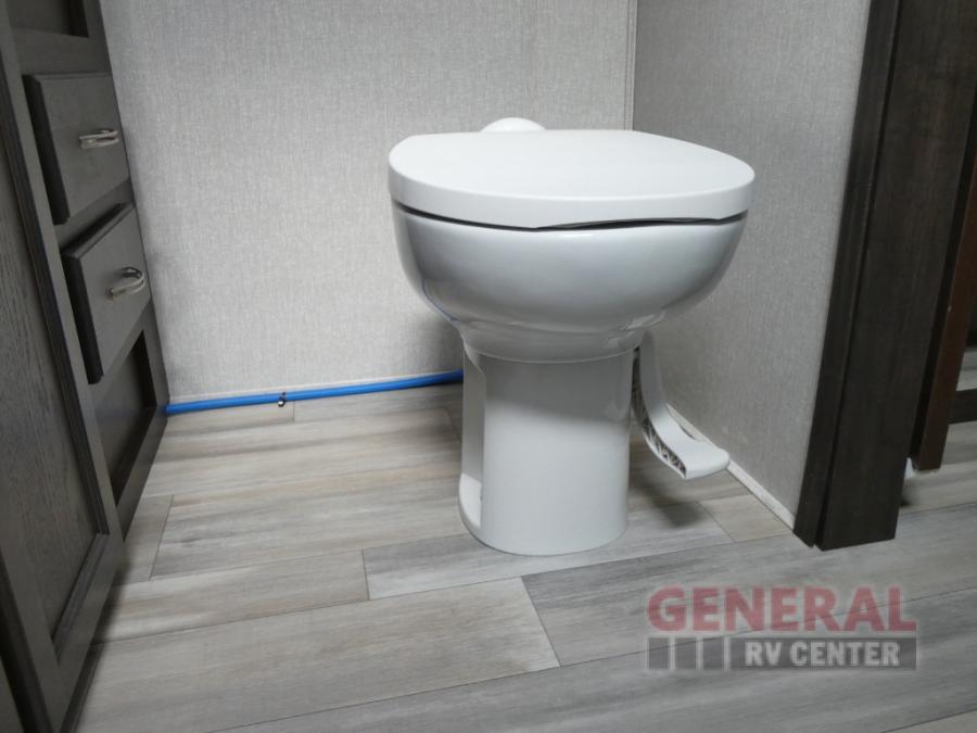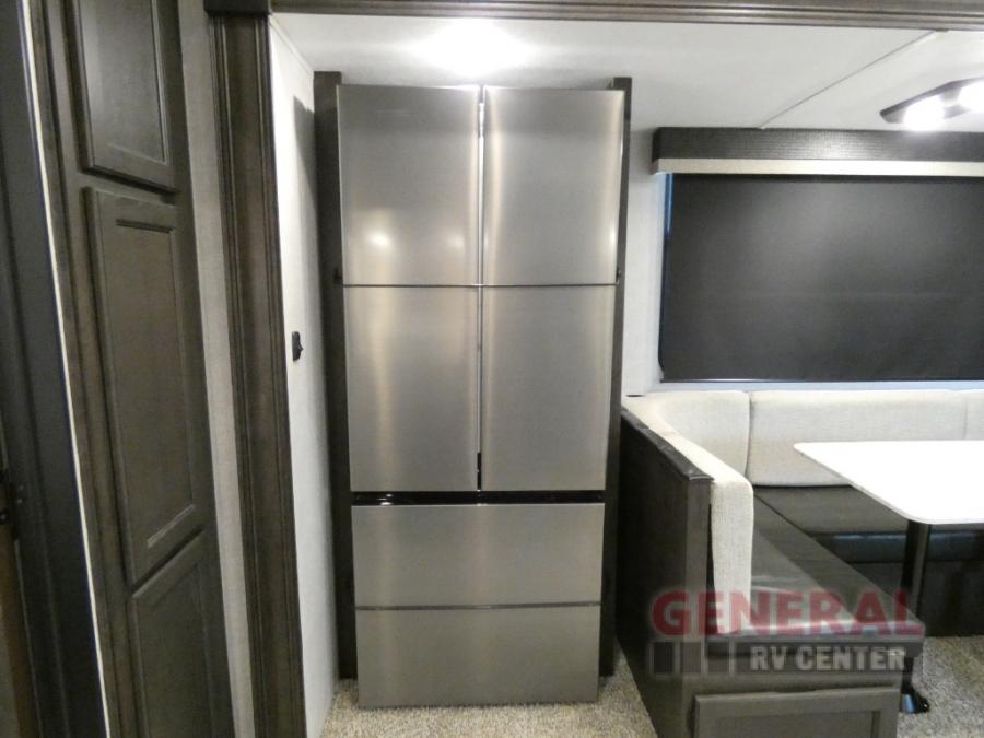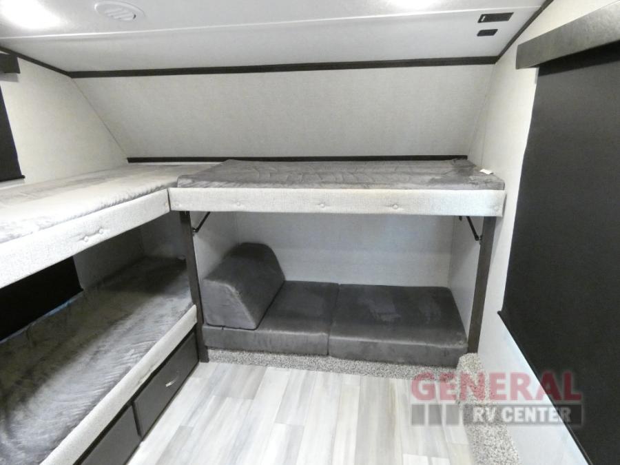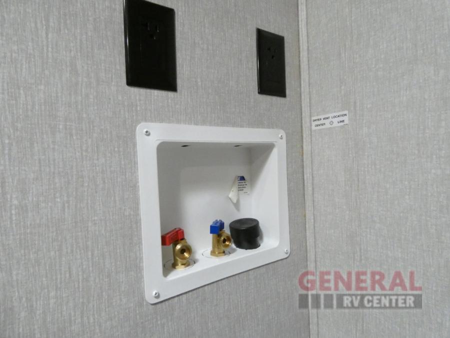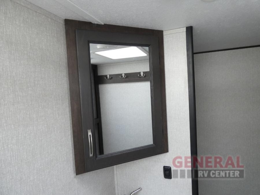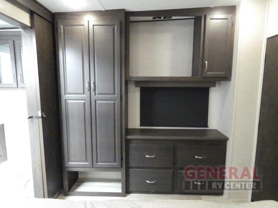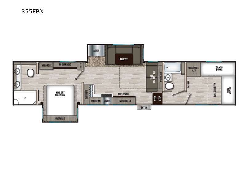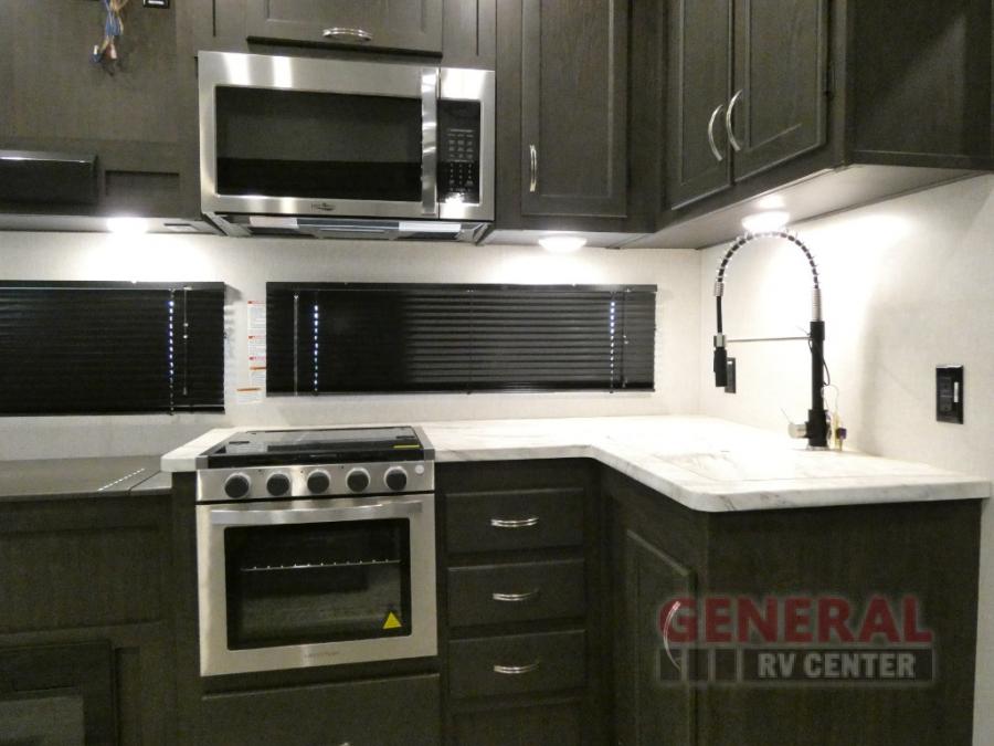 Comfort, convenience and lots of amenities are found in this fifth wheel! So when you are ready to escape to luxury with new scenery, hitch up and head out. The master suite offers a queen bed slide, clothing storage, and a rear full bathroom complete with a shower including a seat and glass sliding doors, plus two sinks to easily get ready in the morning. The kids or your friends will have their own space up front in the bunkhouse that offers three bunk beds, a hide-a-bed cube sofa to relax and even sleep on, plus a wardrobe. The second full bathroom is in the hallway between the bunkhouse and the main living and kitchen area.