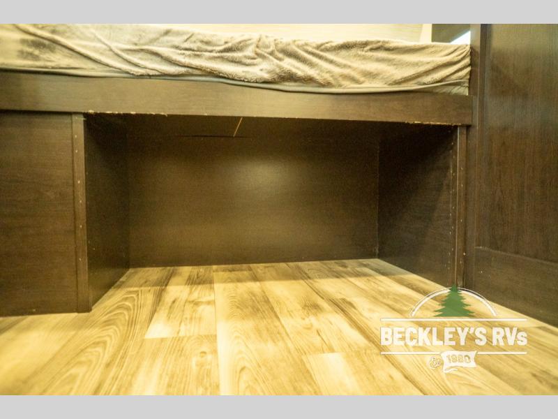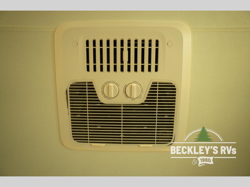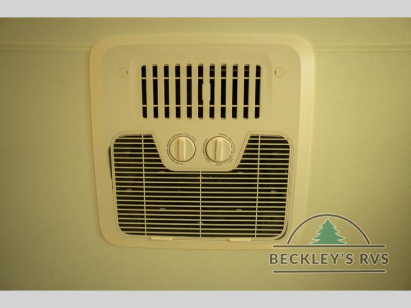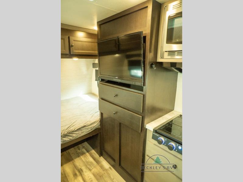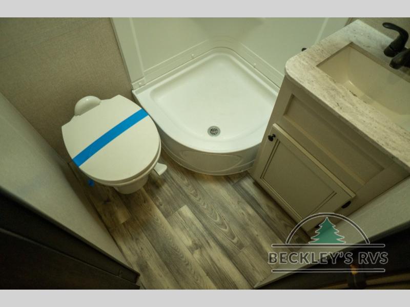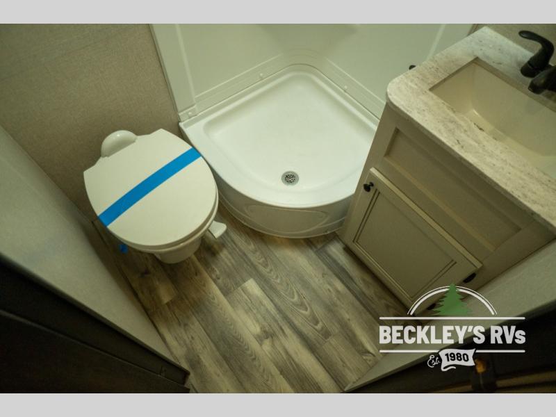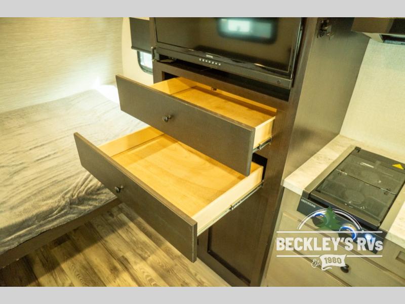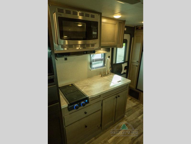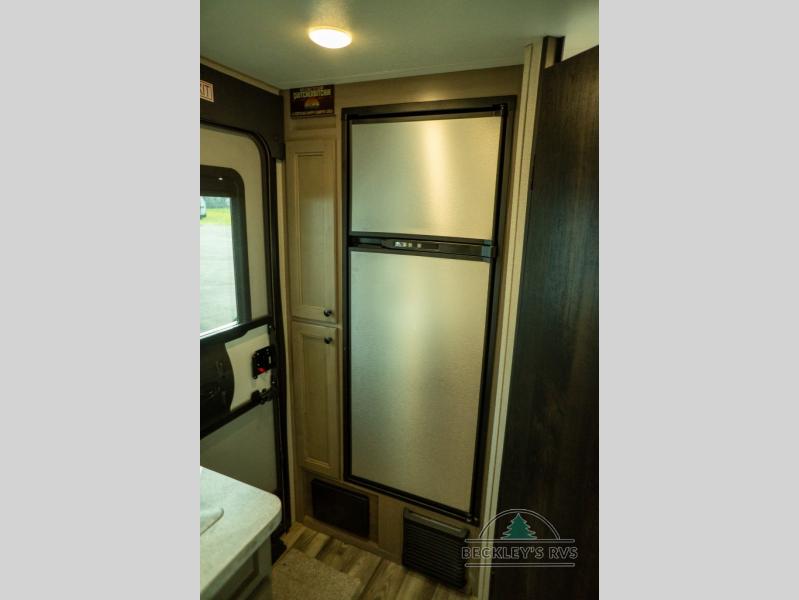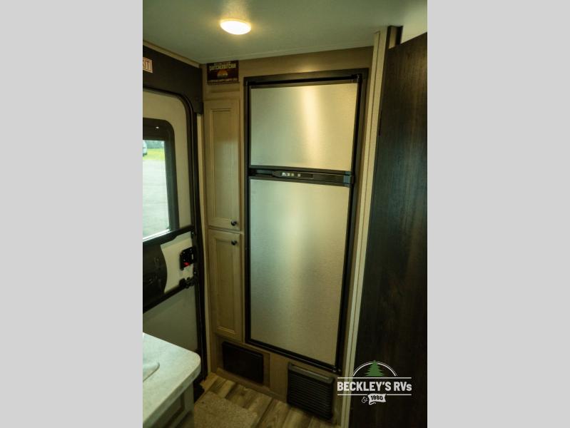 This Super Lite Maxx travel trailer has all of the essentials in an easy-to-tow package! Your interior is outfitted with residential vinyl flooring and hardwood cabinetry, and there are no floor heat registers which makes it very accommodating for kids and pets. The full bathroom has a radius shower which is essential to have if you want to get away in seclusion, and the skylight and roof vent keep the bathroom fresh. The two-burner recessed range and convection microwave will help you keep your belly full, and you can keep the 8-cubic foot refrigerator full of special goodies and healthy foods. You will also find a pantry directly to the left of the entry door.