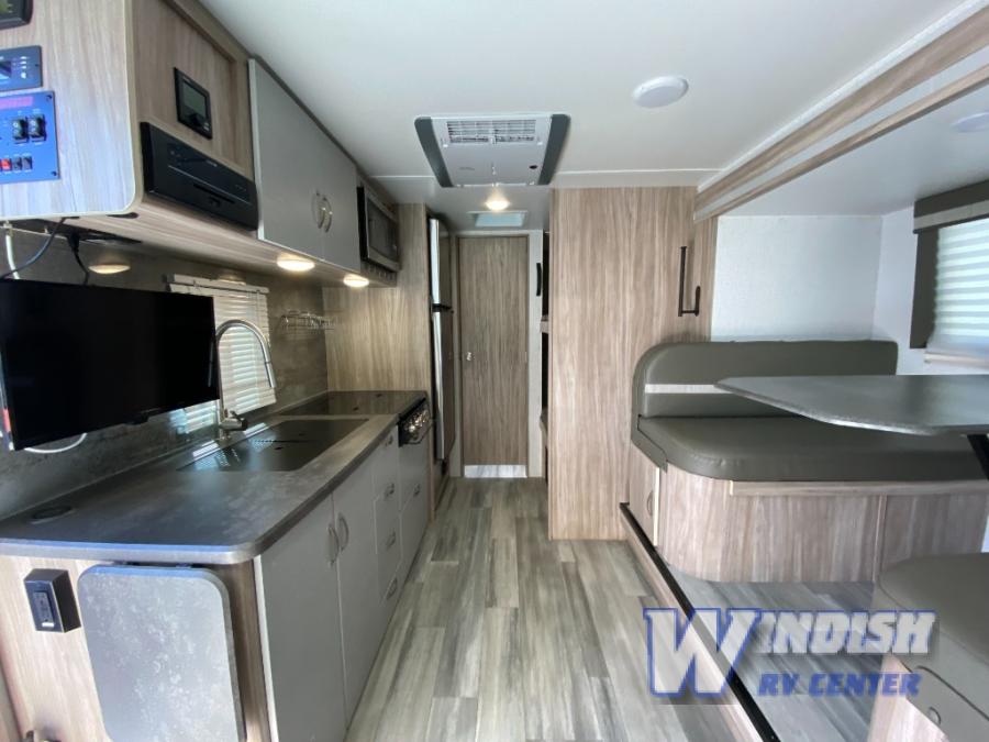 Join the crew of happy campers who are getting away in this Micro Minnie FLX travel trailer! You will be able to store your favorite belongings in the exterior Pack-N-Play storage, and you can also fill up the 10.3-cubic foot refrigerator with fresh produce. The kitchen includes a recessed three-burner cooktop with backlit knobs and glass cover as well as a convection microwave, so you'll never go hungry. There is even a flip-up countertop in the kitchen too, and it can be used when you need more space to prep meals. The front 54" x 74" bed can be sectioned off from the rest of the trailer by drawing the divider curtain, and you can switch out the booth dinette for the optional EZ Glide sofa sleeper with hutch and table if you prefer that configuration.