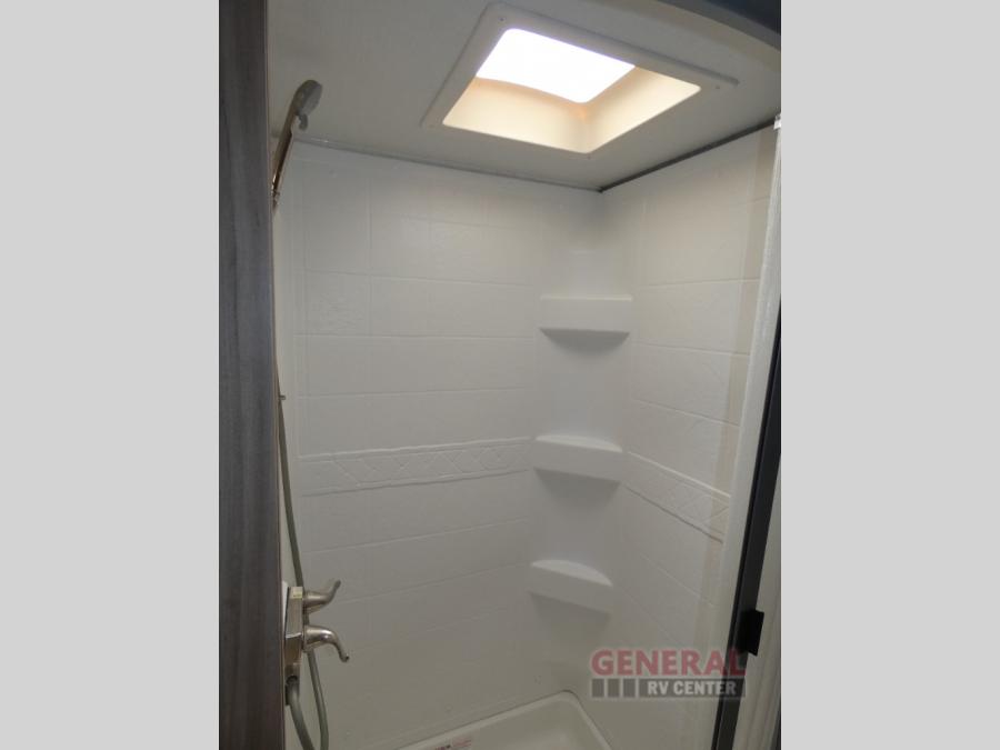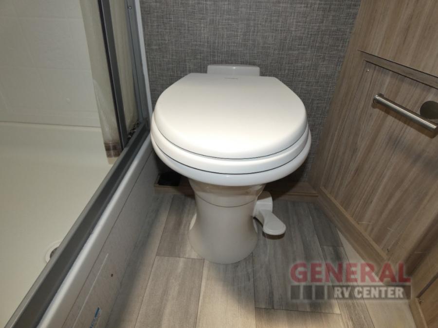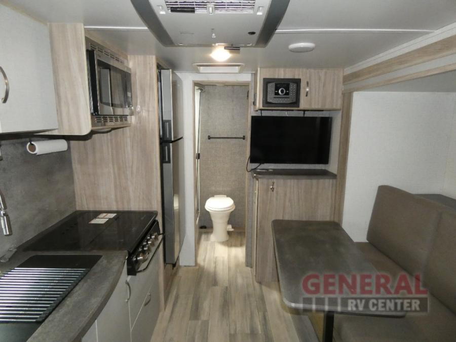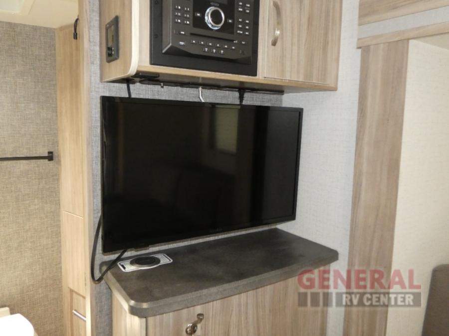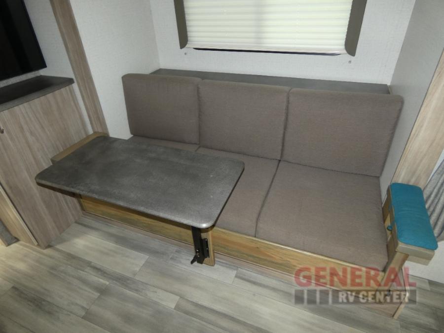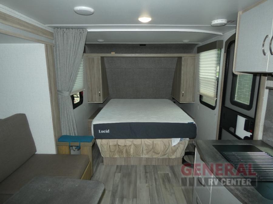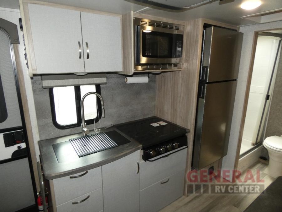 Comfort and convenience are at the heart of this Micro Minnie FLX travel trailer! There is a front bedroom area with an RV queen bed, wardrobe, and nightstand when you draw the privacy curtain, and the rear bathroom has an Aqua View Showermiser system that provides hot water almost instantly while reducing water use. The kitchen comes with a 10.3-cubic foot refrigerator that can hold your favorite foods, and the flip-up countertop adds more prep space without taking up precious living space. You will also be grateful to find an LED TV to watch when the rain just won't stop.