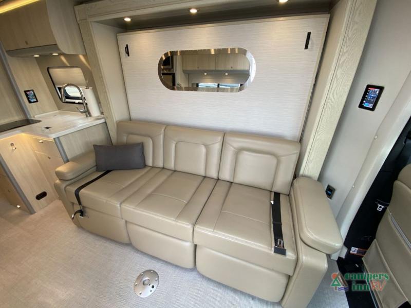 Get ready to explore, unwind and "glamp" where ever you decide! This coach brings you everything you will need, plus much much more! The power slide offers a Murphy suite that retracts and fits seamlessly with the luxury automotive body style. With a touch of a button on the multiplex control panel, you will have more floor space to relax on the reclining sofa that includes two seatbelts or pull down the Murphy bed at night. There is more seating on the captain's chairs that swivel around to face the interior, and there are two tables that adjust to different heights for your needs. The kitchen provides a two-burner gas stove and large stainless steel Kohler sink and faucet, and there is a convection microwave, a slide-out pantry and a refrigerator with a freezer a few steps away.