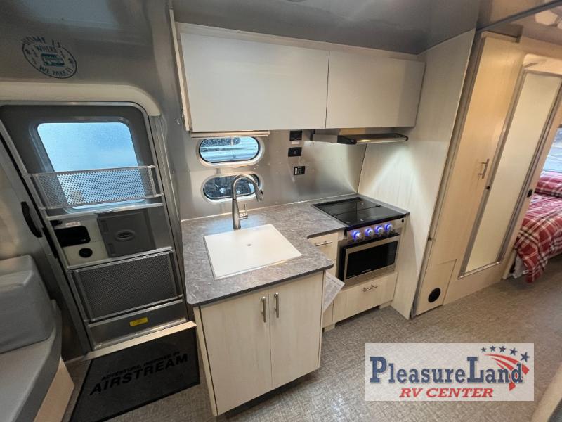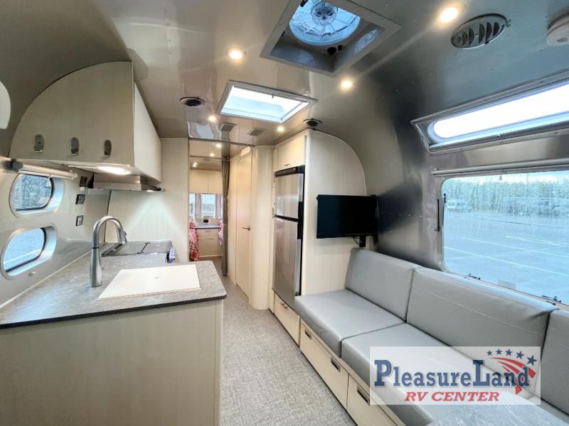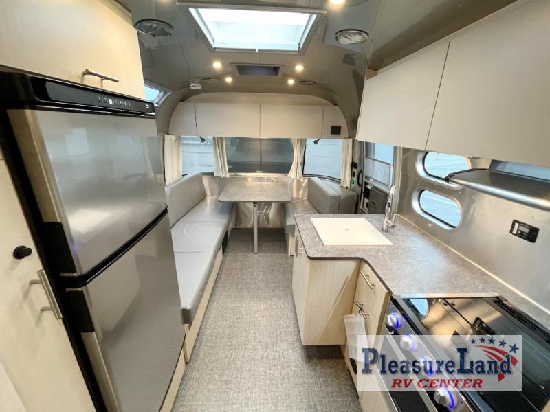 With each Flying Cloud travel trailer by Airstream, there are two axles, and each is built for ease of towing, plus there is a rear-view camera to make reversing and parking easier, and stainless steel front stone guards to protect the lower segments from road debris. The iconic Airstream design is created outside and inside by the semi-monocoque aluminum superstructure, the temperature reducing one-piece white aluminum roof, the panoramic front windows, and the stylish aluminum wheels. The interior will have you feeling right at home with handcrafted cabinetry, plenty of storage and counter space, sleek roller blinds and blackout curtains, plus residential style faucets!