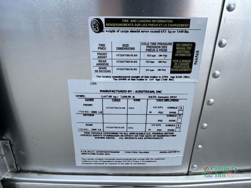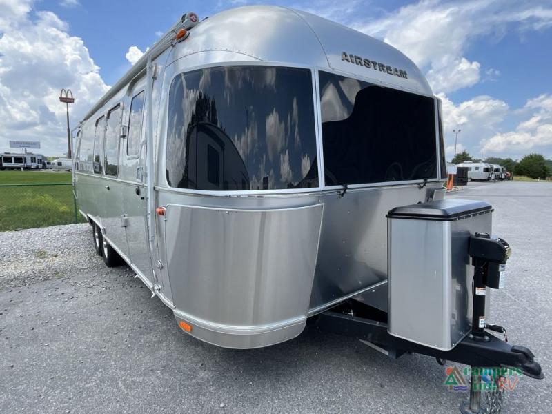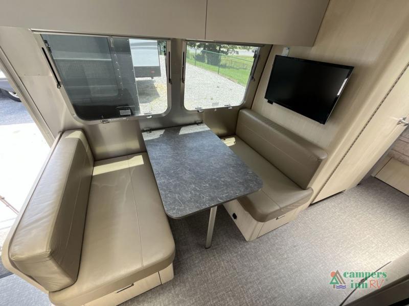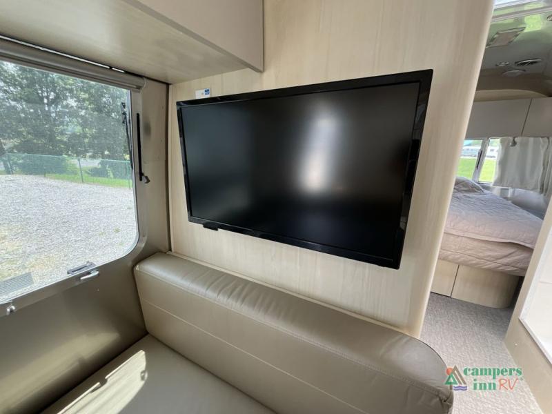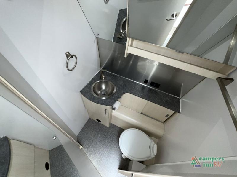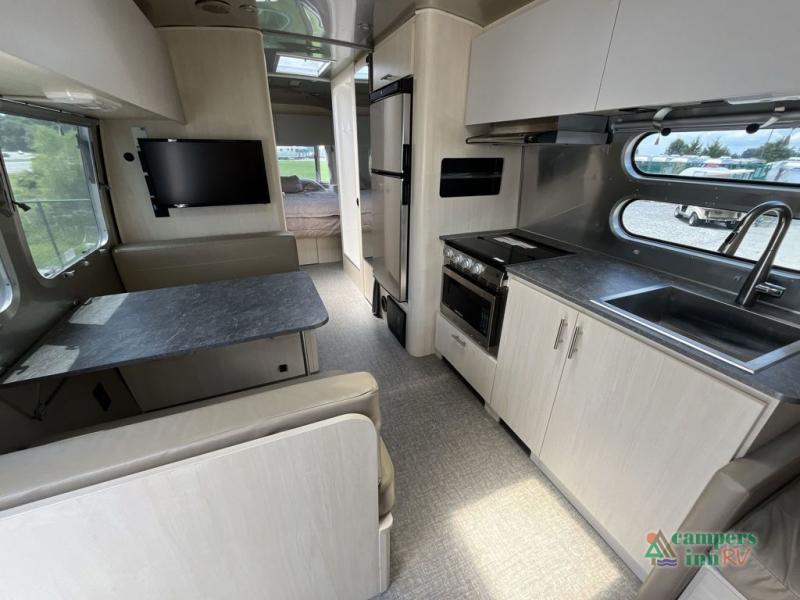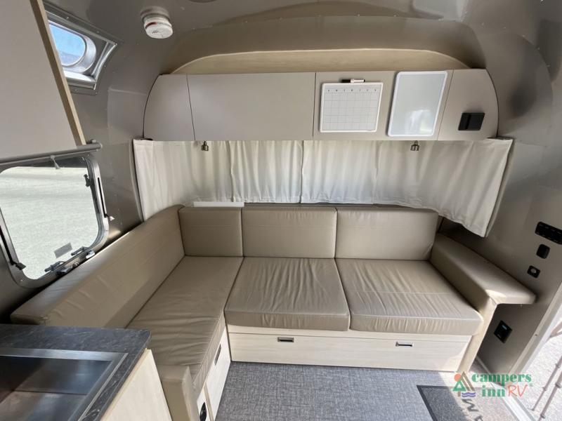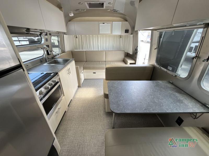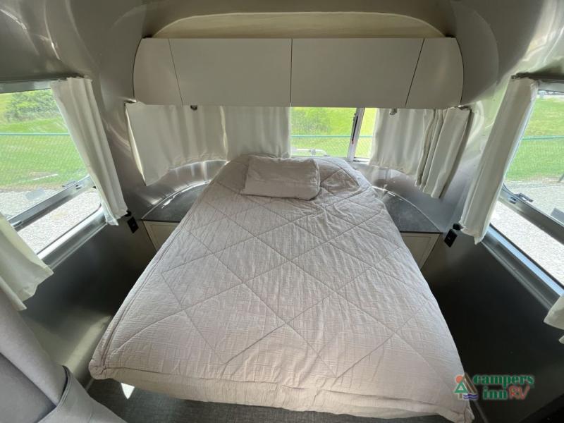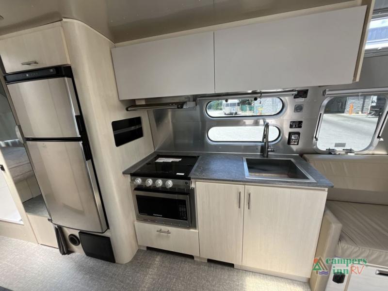 With each Flying Cloud travel trailer by Airstream, there are two axles, and each is built for ease of towing, plus there is a rear-view camera to make reversing and parking easier, and stainless steel front stone guards to protect the lower segments from road debris. The iconic Airstream design is created outside and inside by the semi-monocoque aluminum superstructure, the temperature reducing one-piece white aluminum roof, the panoramic front windows, and the stylish aluminum wheels. The interior will have you feeling right at home with handcrafted cabinetry, plenty of storage and counter space, sleek roller blinds and blackout curtains, plus residential style faucets!