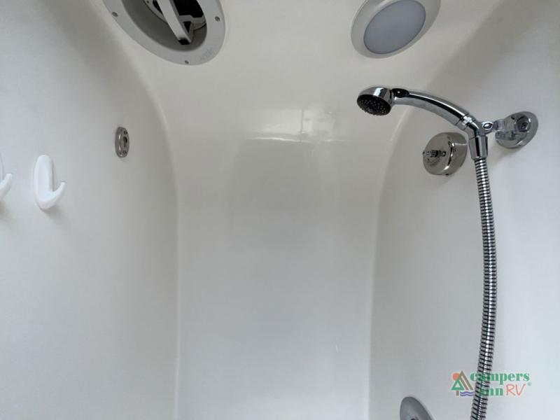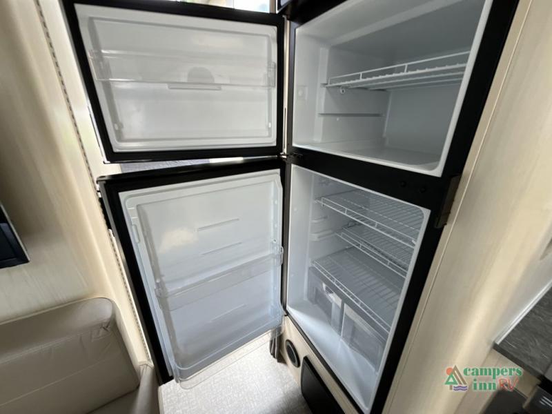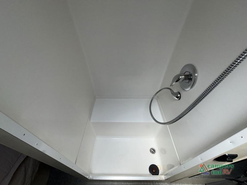 Travel with your family and friends to see new places and experience how comfortable camping can be in this trailer! Whether you are dining at the booth dinette that seats four or relaxing up front on the L-shaped sofa, you can visit while watching the TV or talking with the cook in the galley kitchen. The split bathroom offers a toilet and vanity along one side and a shower with its own door on the other next to a closet for hanging clothes. The rear bedroom with an RV queen bed offers privacy and two sides with closets, and more windows for great views of your surroundings.
