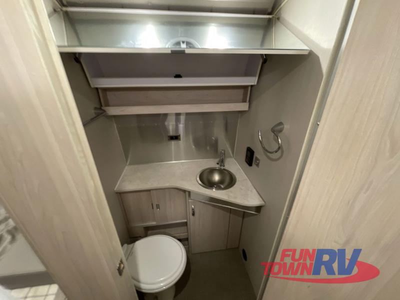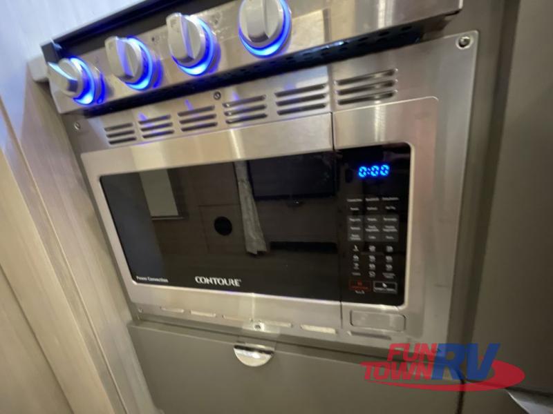 Enjoy a home away from home with this travel trailer! The L-shaped lounge provides a comfortable place to enjoy a meal, play a card game, and even transform into an extra sleeping space for a guest or two smaller guests. The ultra-modern kitchen has a stainless steel three burner cooktop, a Baraldi vent, a 6.8 cu. ft. refrigerator, and a deep stainless steel Moen sink to make clean up easier. The bright white DuPont Corian countertops help light bounce off of the aluminum walls making for a brighter atmosphere and they also have built-in multifunctional storage bins that are flush with the surface behind the sink. Up front there is a queen bed with an AdaptaFlex memory foam mattress for you to enjoy a good night's rest or watch a movie with the LED TV. The separated bathroom allows one person to freshen up in the shower with a seat while another uses the private toilet and vanity!
