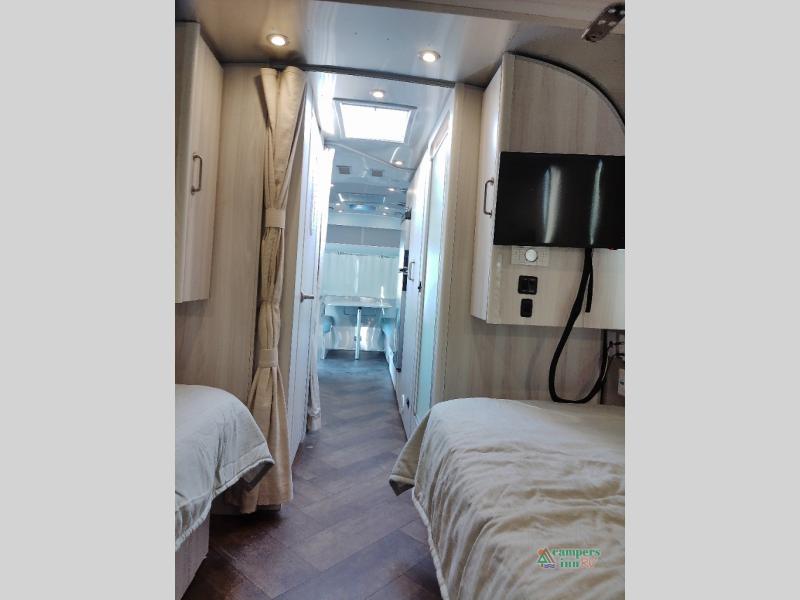If you want a model just like 27FB, but you would prefer to have two twin-size beds in place of the one RV queen bed, then you must check out this International travel trailer! This trailer has a front bedroom with two twin beds for your convenience, and the kitchen has a three-burner cooktop, stainless steel sink, 8 cu. ft. refrigerator, and microwave so that you can create new and exciting dishes each time you are away. This trailer also has excellent storage space with the overhead storage lockers, the wardrobe with hanging bar, the under-bed storage, and the exterior storage compartment. You can also find great entertainment as you spend your time in this trailer because the two LED HDTVs will allow you to watch a movie on the Blu-Ray DVD player.