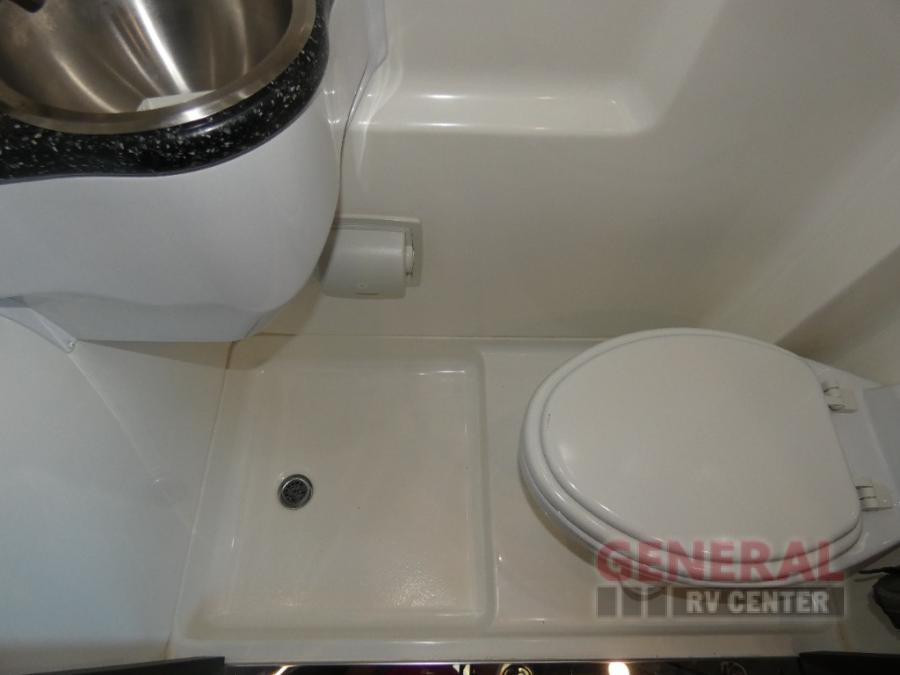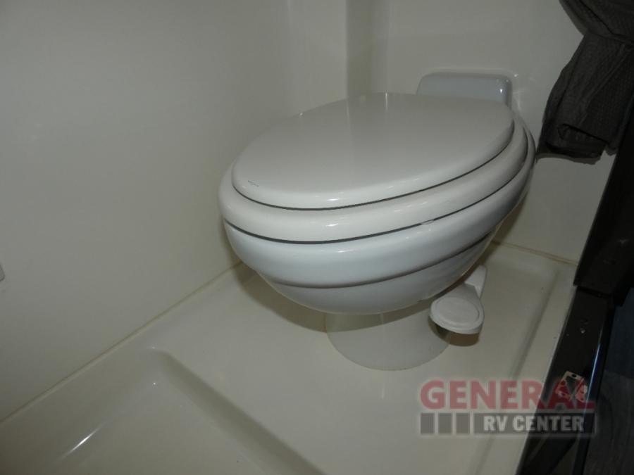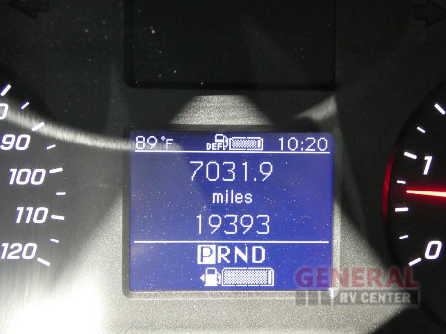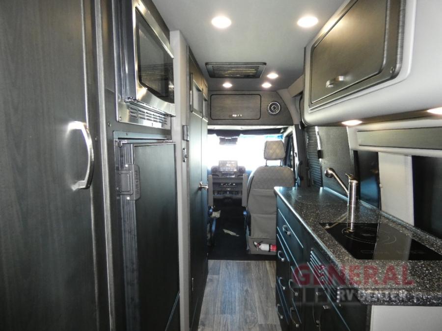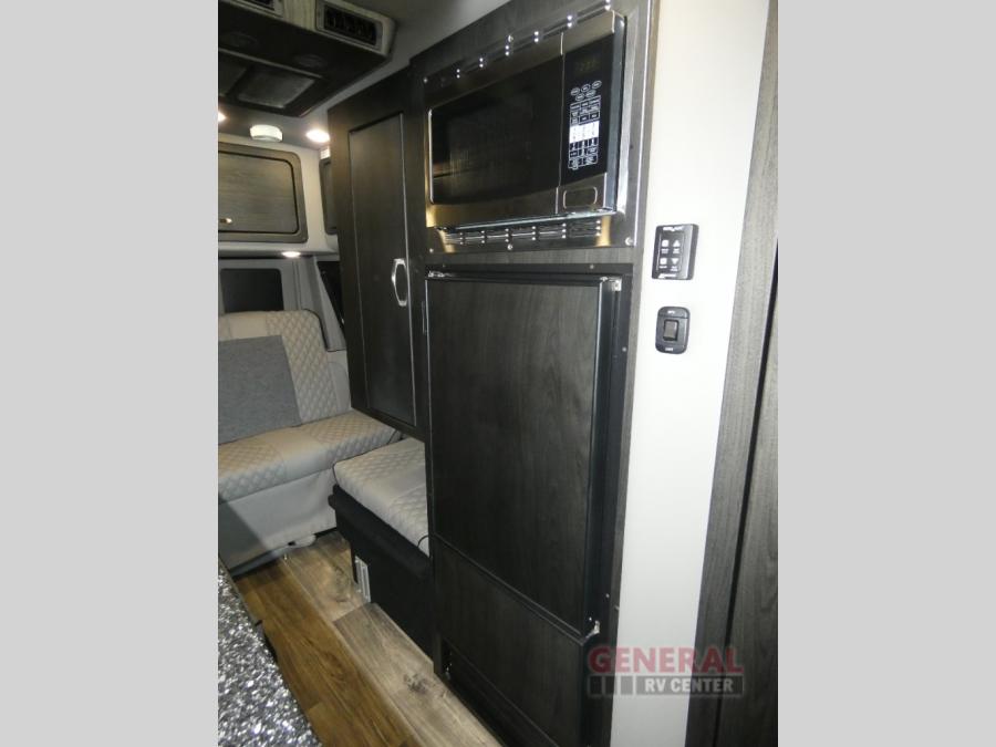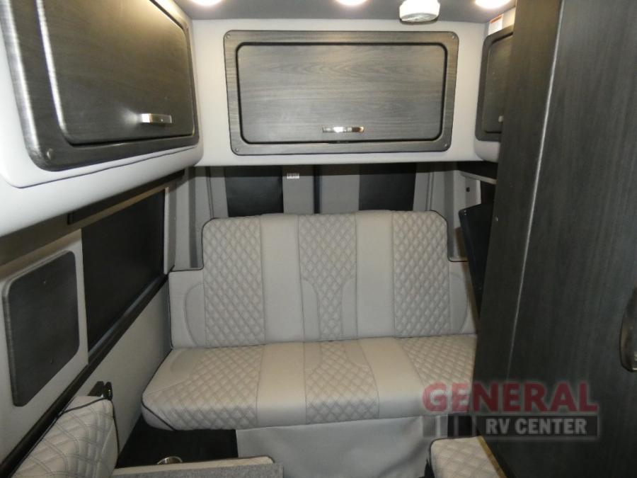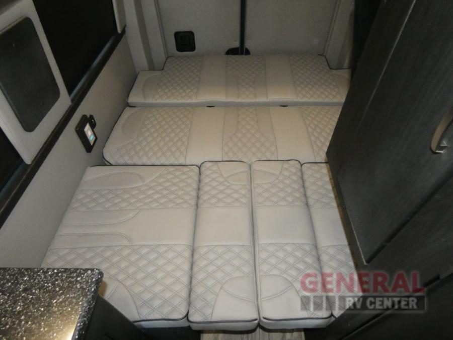 You can use the rear power folding sofa bed to comfortably relax in this American Patriot Class B diesel motorhome. There are two sets of seats with seat belts located next to the sofa for additional travel space as you cruise down the highway, and the rear HDTV can be enjoyed from this area. The Lagun removable table sits in front of the extra seats, so this space can also be used as a dining location. You'll also have a second dining location if you move the table up front to the table pedestal mount next to the cab seats. Meals will be easy to make when you utilize the great appliances found in the kitchen, like the stainless steel microwave, refrigerator, and solid-surface countertops. You can also keep lots of belongings stored away in the overhead cabinets.