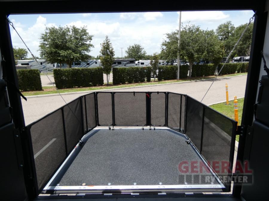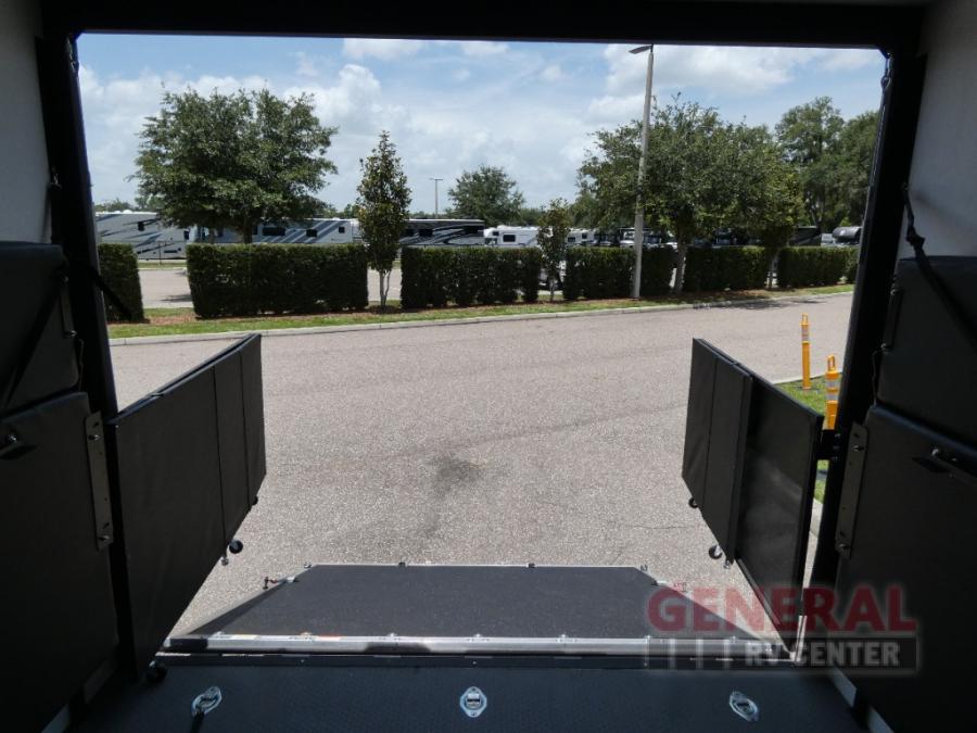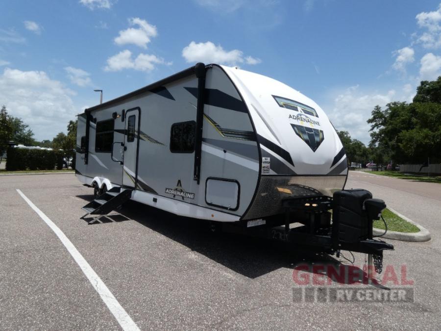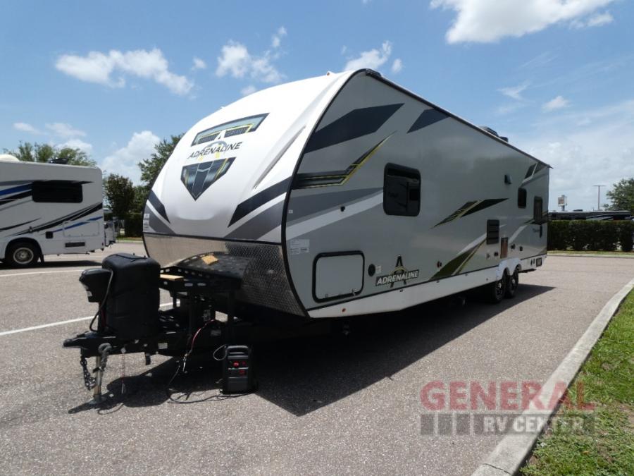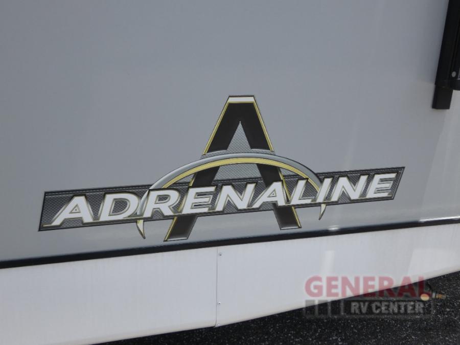 With any Adrenaline toy hauler travel trailer by Coachmen, the required Exterior Value package includes a one-piece Tufllex PVC roof membrane, a fiberglass front cap with rock guard to help against road debris, heavy duty Dexter axles with Nev-R-Adjust brakes and E-Z Lube, and aluminum wheels. Some exterior standards include a heated and enclosed underbelly, a patio ready ramp door with cables for an outdoor above ground space to enjoy, a power tongue jack for easy setup, and an outside spray port to clean off your toys. The interior standards include HD rubberized oil/gas/moisture resistant flooring in the garage area, shaker style cabinets and doors, a rear detachable screen, and USB charging ports in multiple locations for your electronics to mention a few.