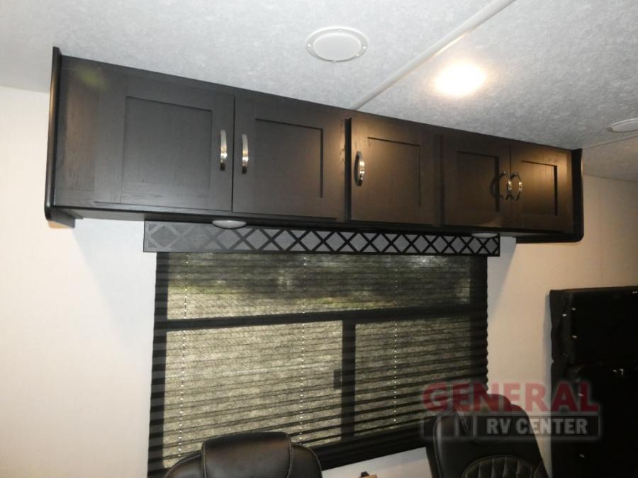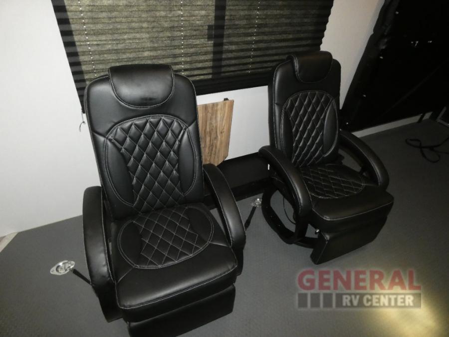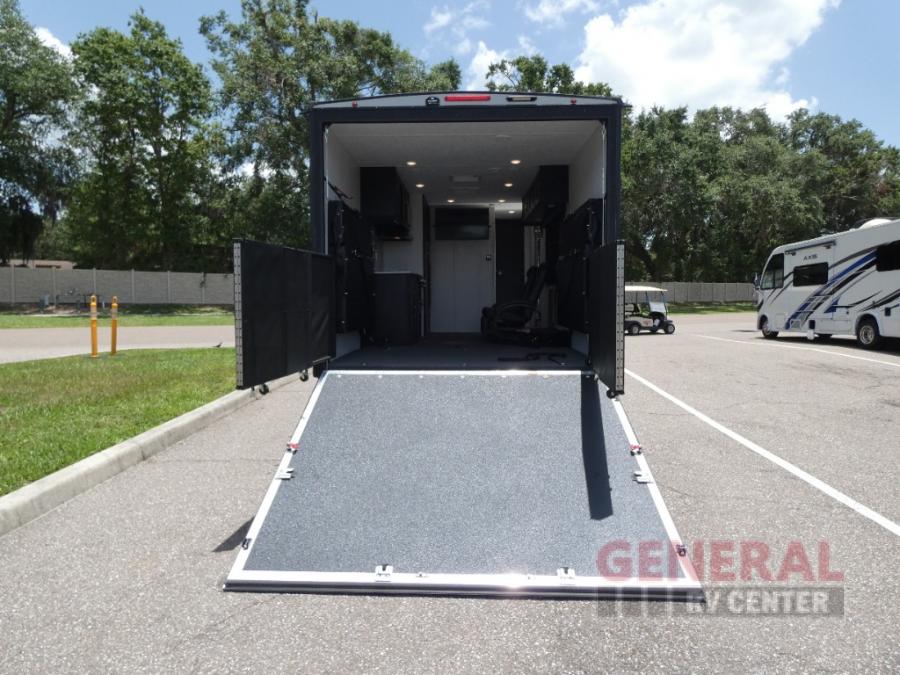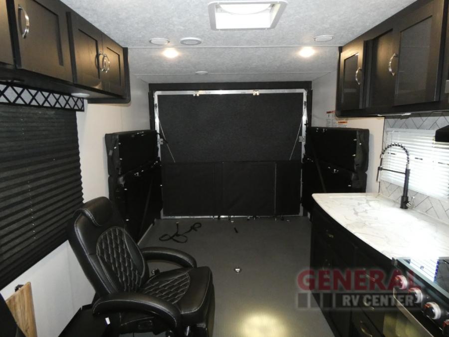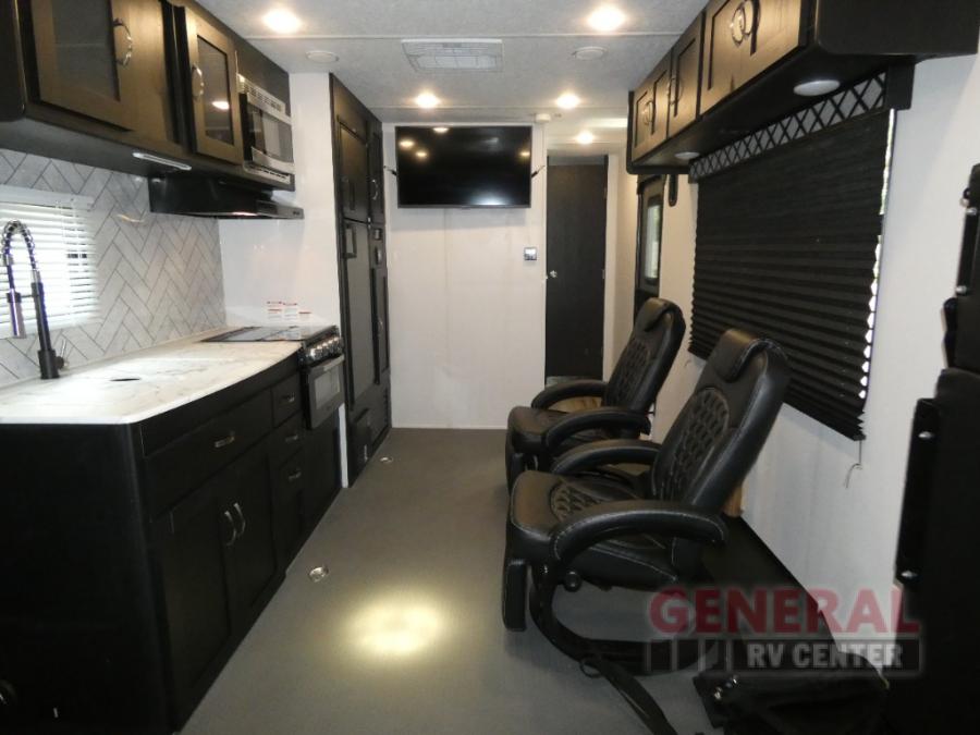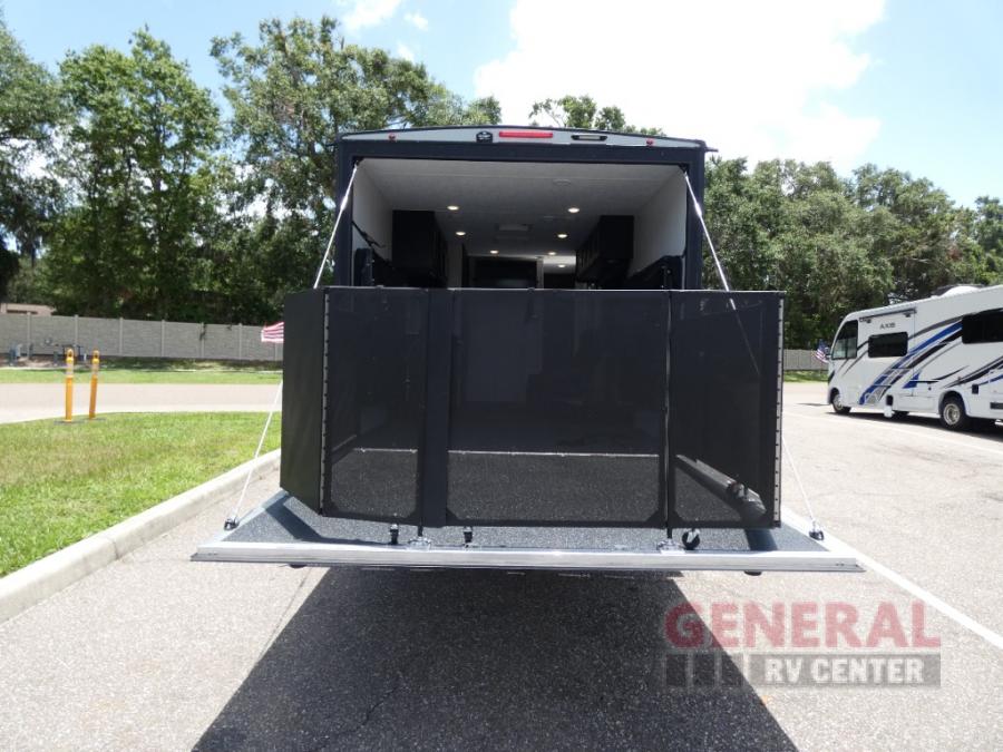With any Adrenaline toy hauler travel trailer by Coachmen, the required Exterior Value package includes a one-piece Tufllex PVC roof membrane, a fiberglass front cap with rock guard to help against road debris, heavy duty Dexter axles with Nev-R-Adjust brakes and E-Z Lube, and aluminum wheels. Some exterior standards include a heated and enclosed underbelly, a patio ready ramp door with cables for an outdoor above ground space to enjoy, a power tongue jack for easy setup, and an outside spray port to clean off your toys. The interior standards include HD rubberized oil/gas/moisture resistant flooring in the garage area, shaker style cabinets and doors, a rear detachable screen, and USB charging ports in multiple locations for your electronics to mention a few.