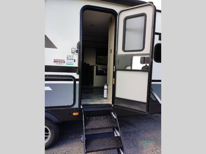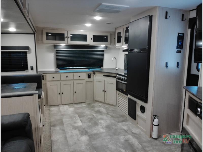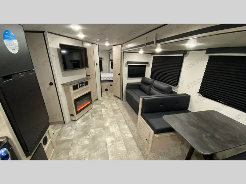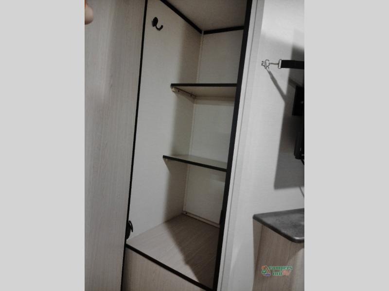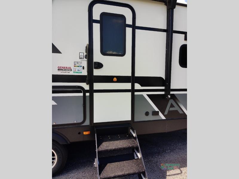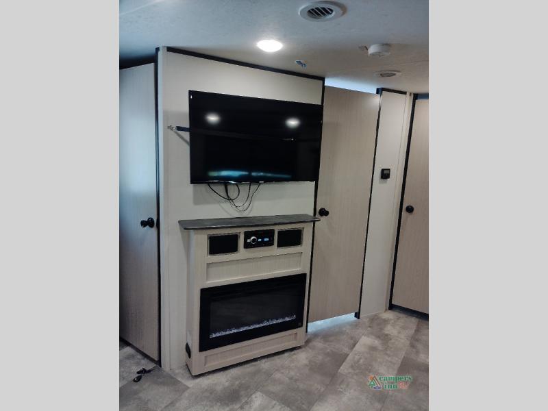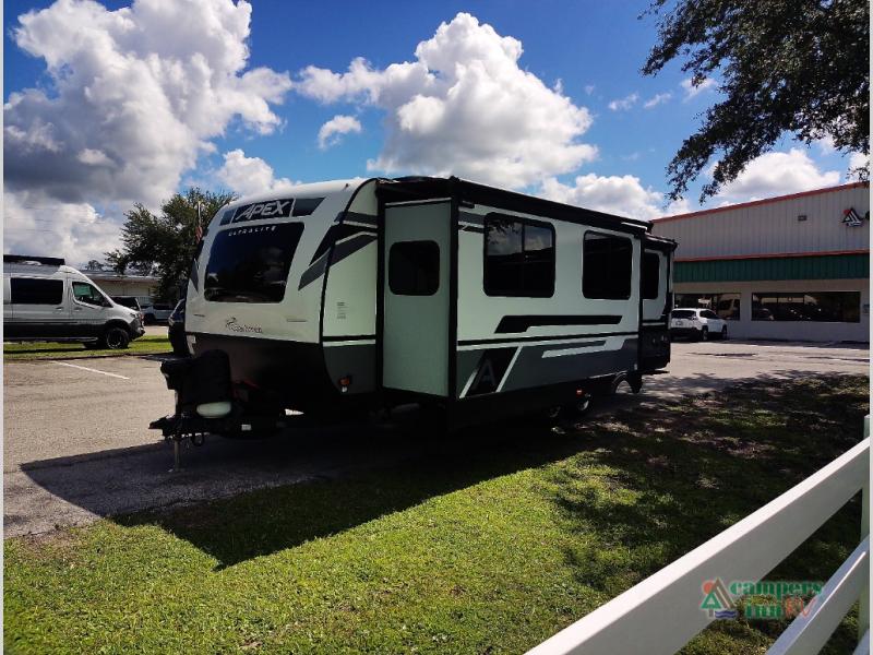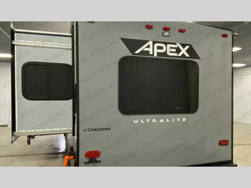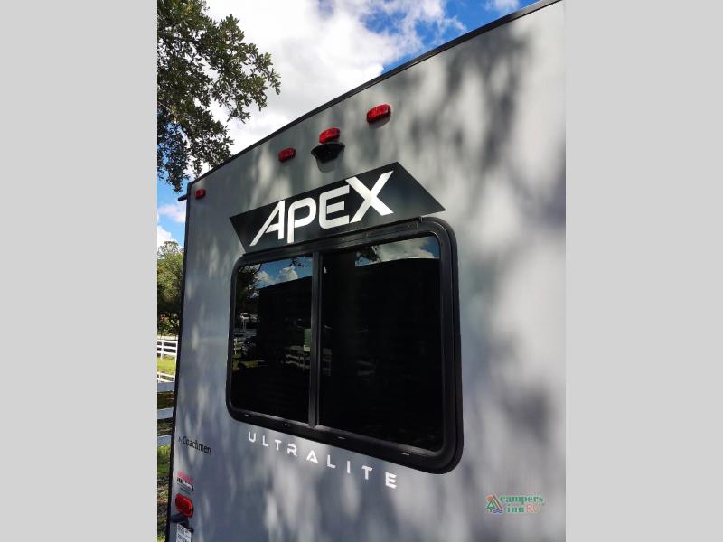Enjoy each adventure camping in this Apex Ultra-Lite unit featuring dual entry doors. There is sleeping for up to six with the convertible dinette and sofa, plus a queen bed slide in the rear private bedroom that includes super storage beneath. This bedroom also features a large wardrobe near the private bedroom entry door. The front kitchen has everything you need to prepare hearty camp meals easily thanks to the large counter space for prepping. A booth dinette and sofa slide offer seating for everyone and all will easily be able to view the entertainment center with TV and cozy fireplace from either one. A large pantry is conveniently located just inside the main front most entry door where you can quickly grab a snack for outside, or load up groceries once you shop for your trip.