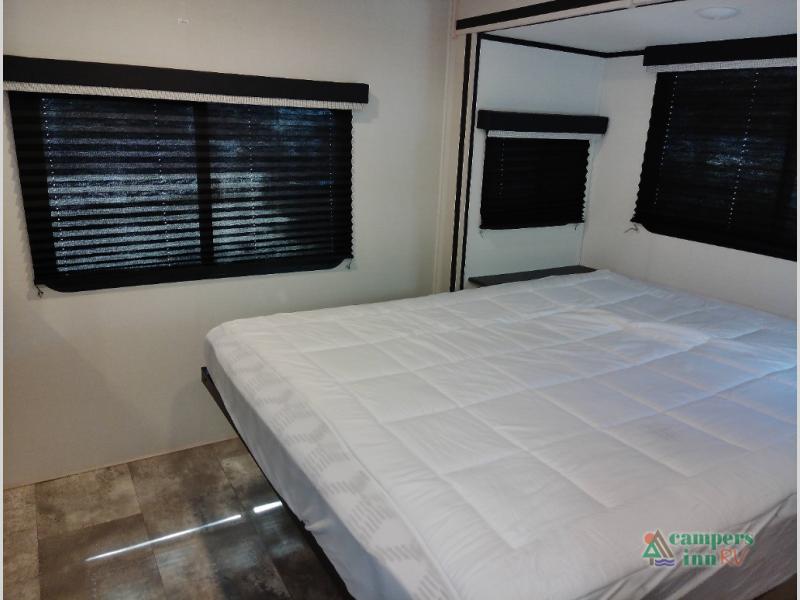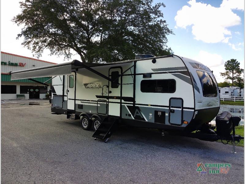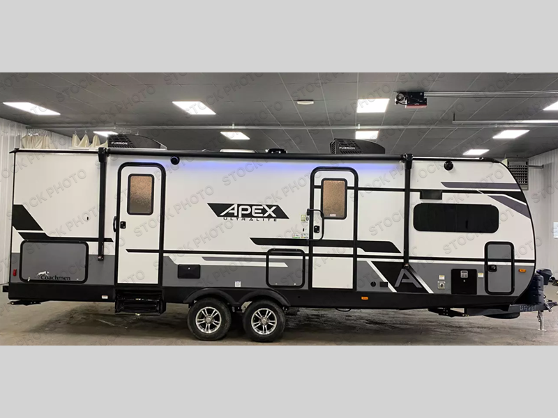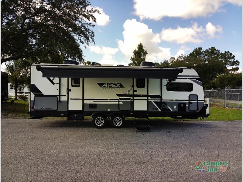 Lightweight living and camping is found with the Apex Ultra-Lite travel trailers by Coachmen. These eco-friendly units are made to last thanks to the Azdel composite sidewalls, the laminated aluminum floor, and the vacuum-bonded laminated crowned roof. Lippert axles and nitrogen filled radial tires make towing easier than ever, plus there is a friction hinge entrance door, a 100-watt solar panel with a 10 Amp control charger, and slam latch baggage door catches for easy unloading. Some of the interior comforts you'll fall in love with are the one-piece seamless edge countertops, the hard valances with night shades throughout, the matte black hardware, and the residential comforter. The Apex Ultra-Lite trailers also include USB ports, a digital TV antenna with cable hook-ups and Wi-Fi capability, and an AM/FM stereo with Bluetooth to ensure you'll never be bored on rainy camp days!