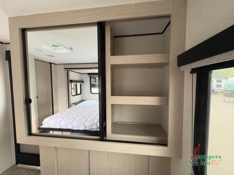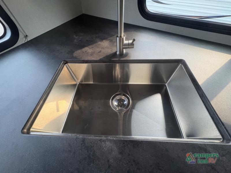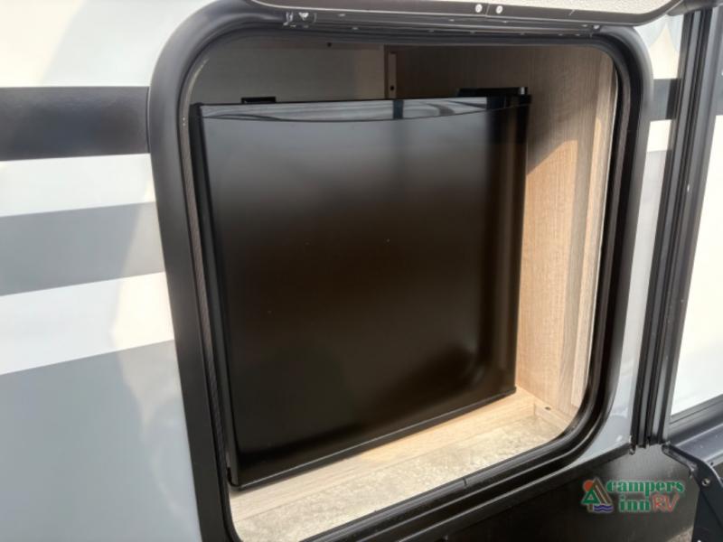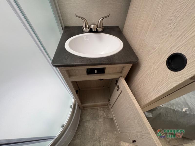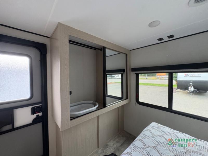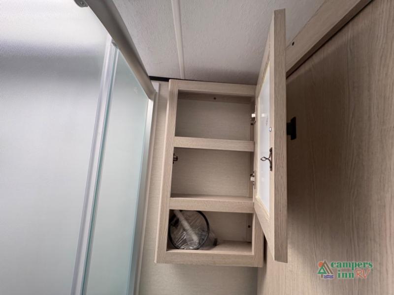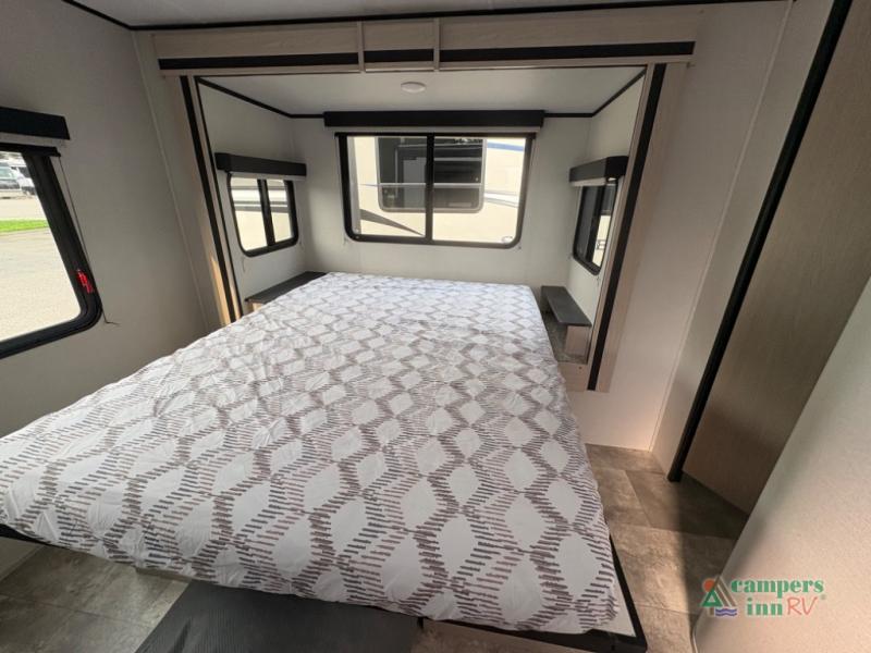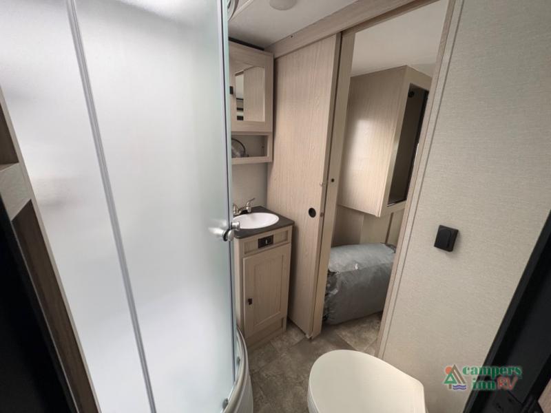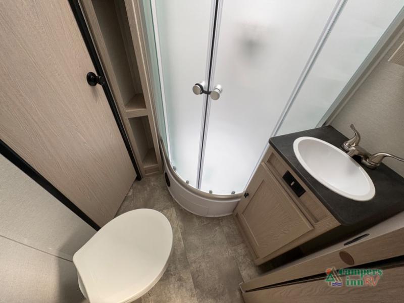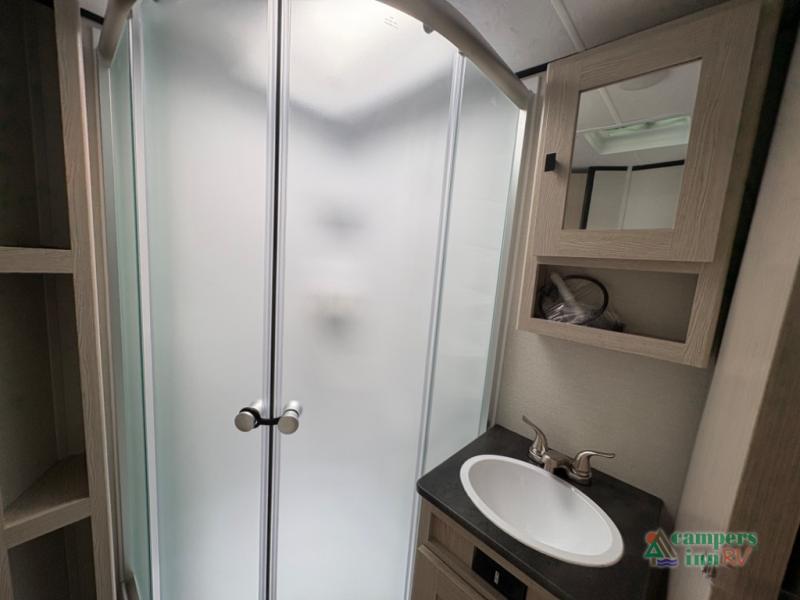 When it’s time to unwind, the private rear bedroom with a walk-around queen bed and plenty of wardrobe storage creates a cozy retreat. A full bathroom with a glass shower, vanity, and linen space adds residential-style convenience. With its lightweight build and Azdel composite construction, this model is durable, easy to tow, and designed to last.