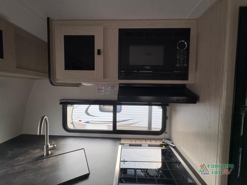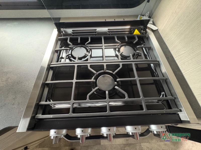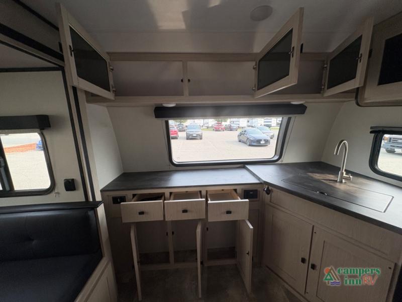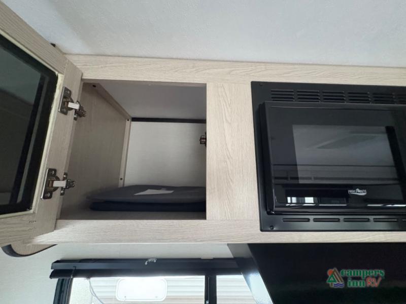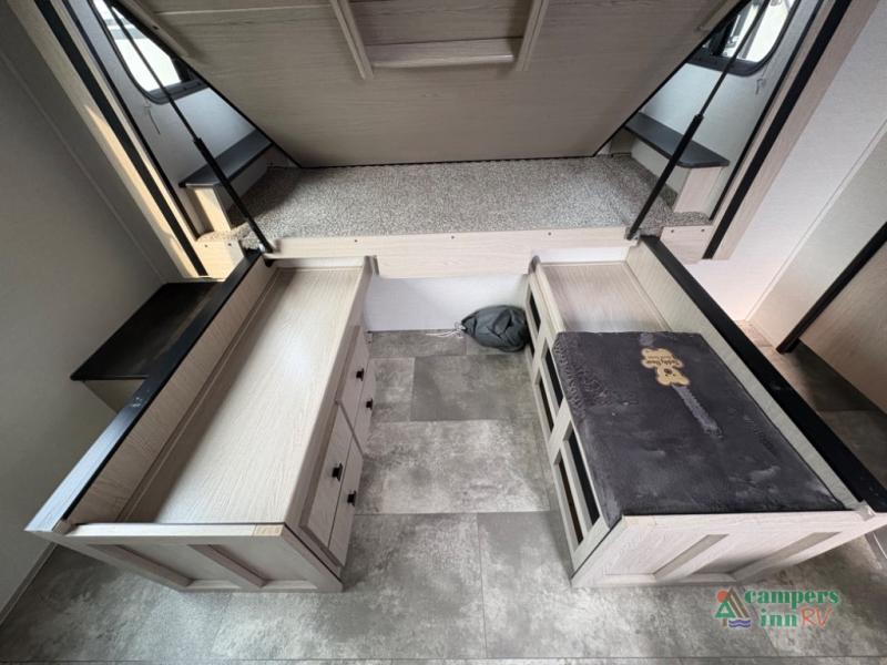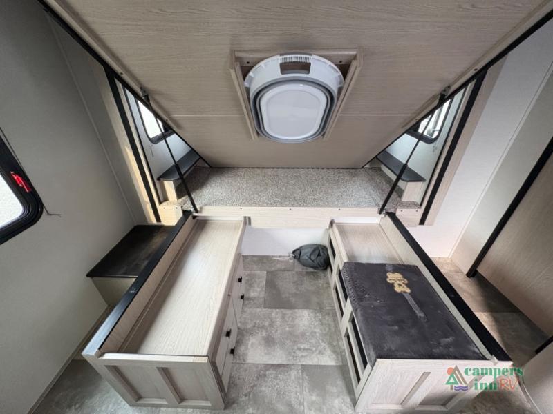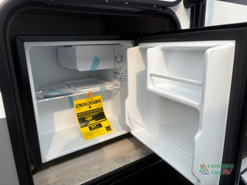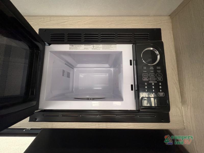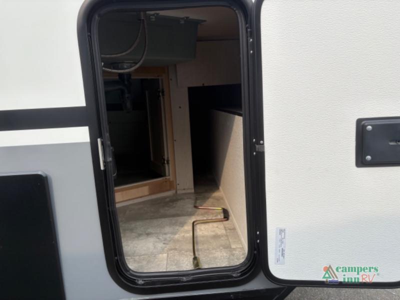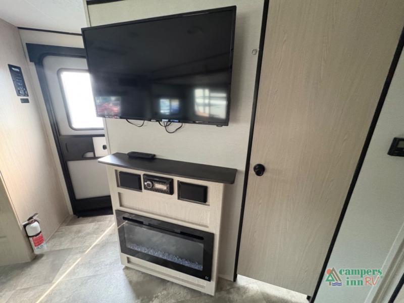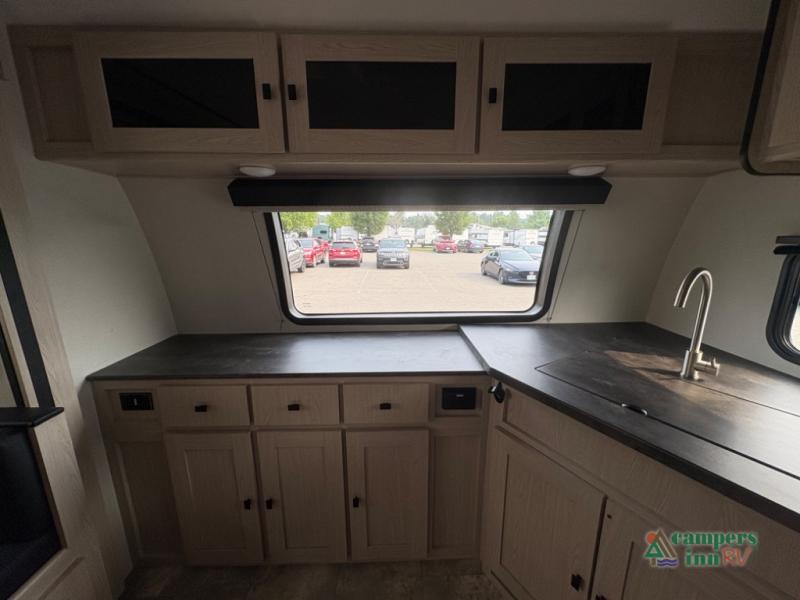 When it’s time to unwind, the private rear bedroom with a walk-around queen bed and plenty of wardrobe storage creates a cozy retreat. A full bathroom with a glass shower, vanity, and linen space adds residential-style convenience. With its lightweight build and Azdel composite construction, this model is durable, easy to tow, and designed to last.