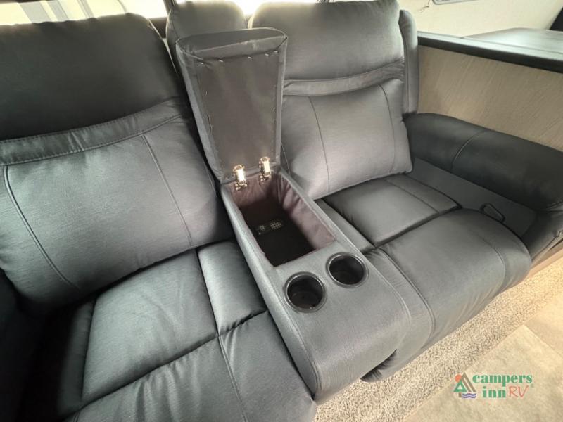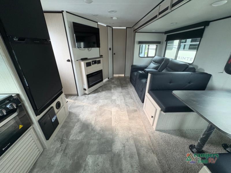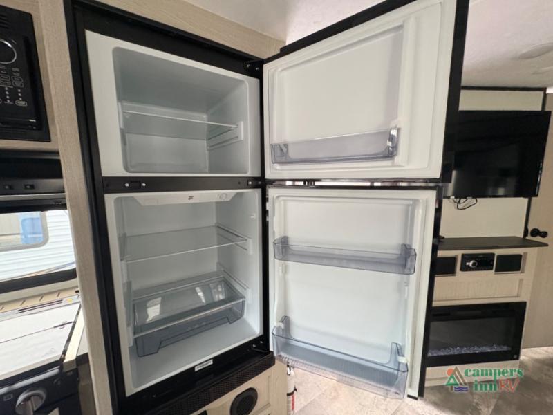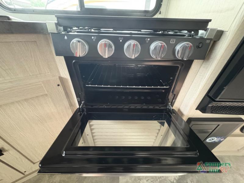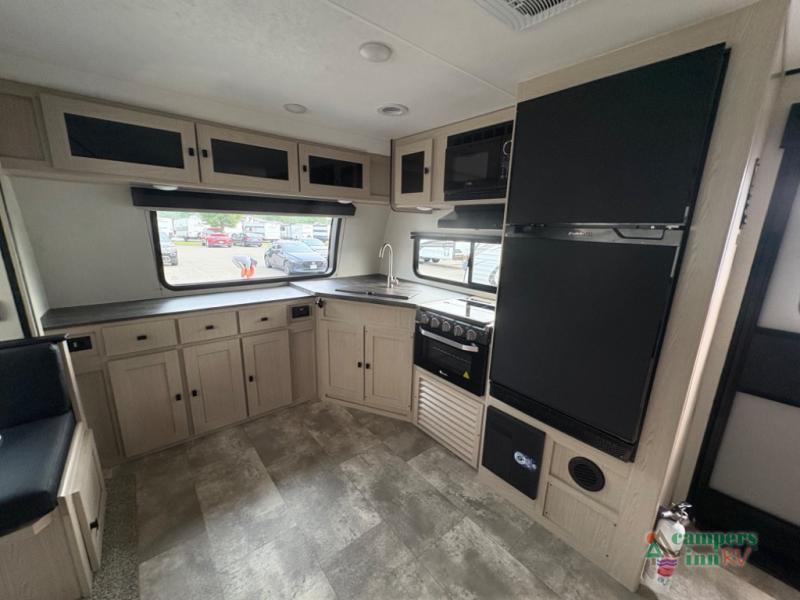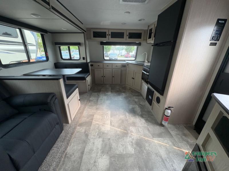 One of the standout features of the Apex Ultra-Lite 243FKS is its front kitchen layout. The spacious design includes ample counter space, a three-burner cooktop, oven, microwave, refrigerator, and storage, making it easy to prepare meals just the way you like while on the road. The open-concept living area offers a large slide-out with theater seating or sofa options, a booth dinette, and an entertainment center, ensuring comfort and relaxation after a day of exploring.
