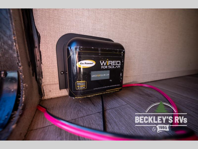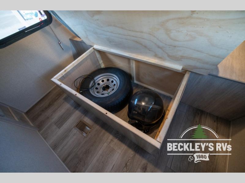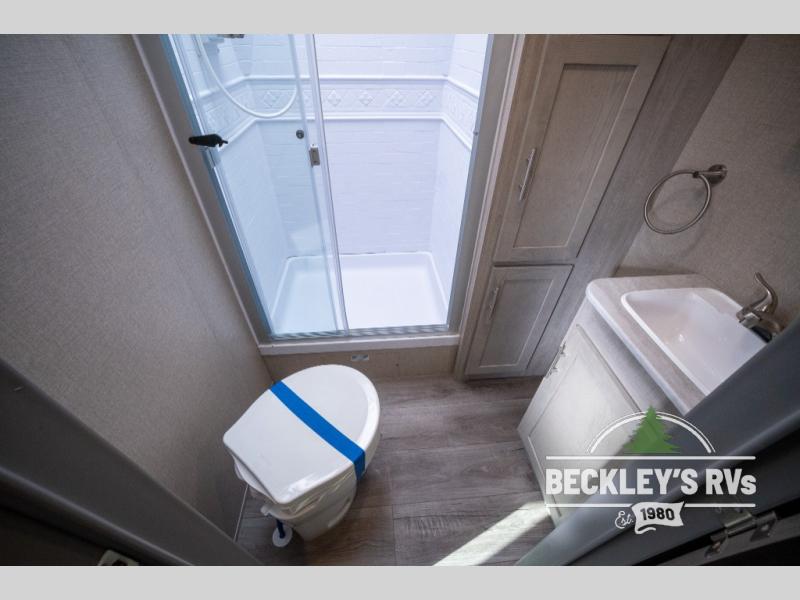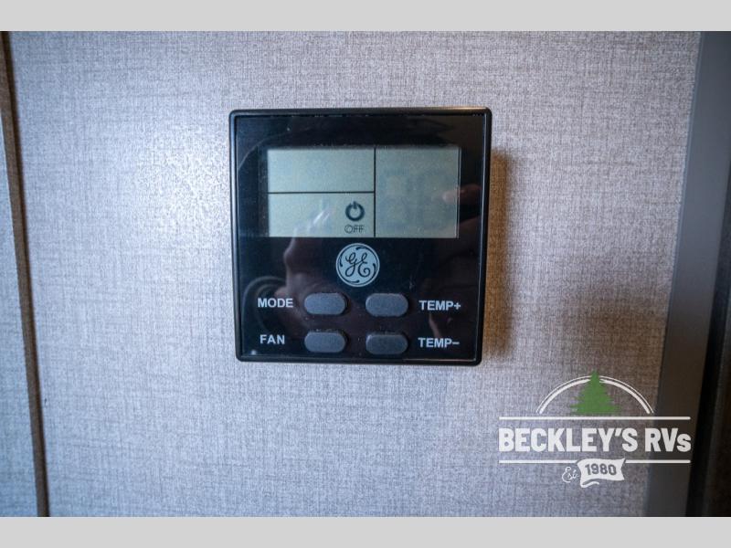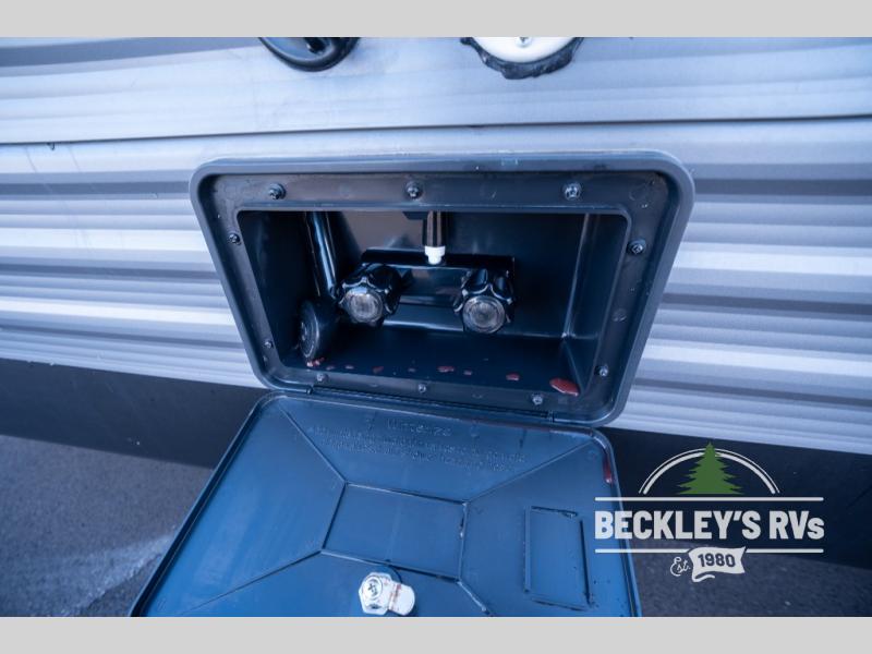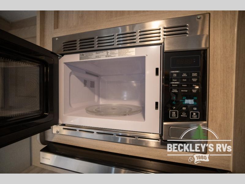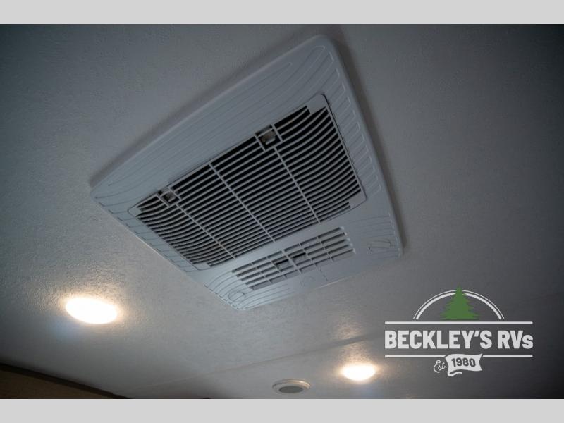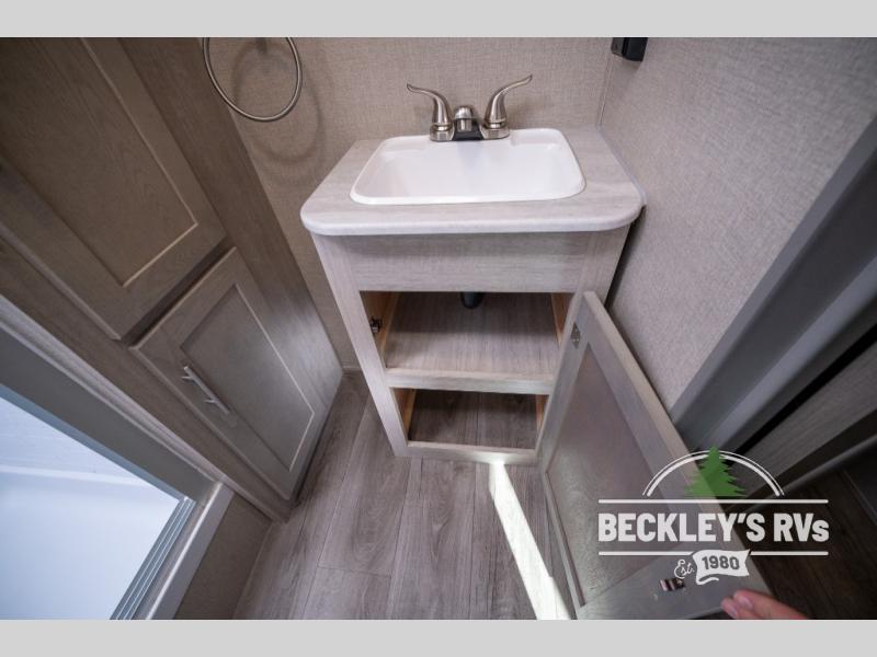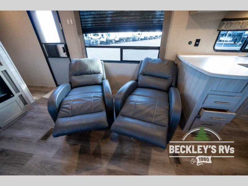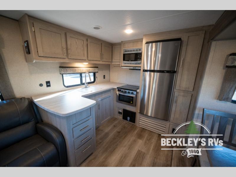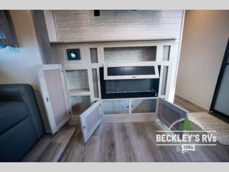 Whether you camp to relax indoors or play outdoors, this trailer offers interior comforts for a couple or a family of four! From the spacious rear kitchen thanks to the large slide out that includes a booth dinette and sofa. Yet you might like to choose the free standing dinette option in place of the booth dinette. The U-shaped counter offers plenty of space to dry dishes and prep meals. There is a 10 cu. ft. refrigerator and pantry for food storage, and everyone can enjoy the entertainment center with a fireplace option below while cooking, cleaning, dining and relaxing. And the recliner lounges will probably be popular seats. At night head to the front bedroom to sleep on the walk-around king bed after stopping off at the full bathroom to get cleaned up.