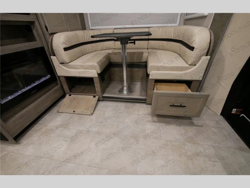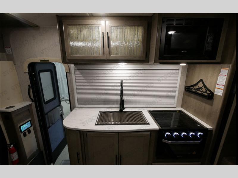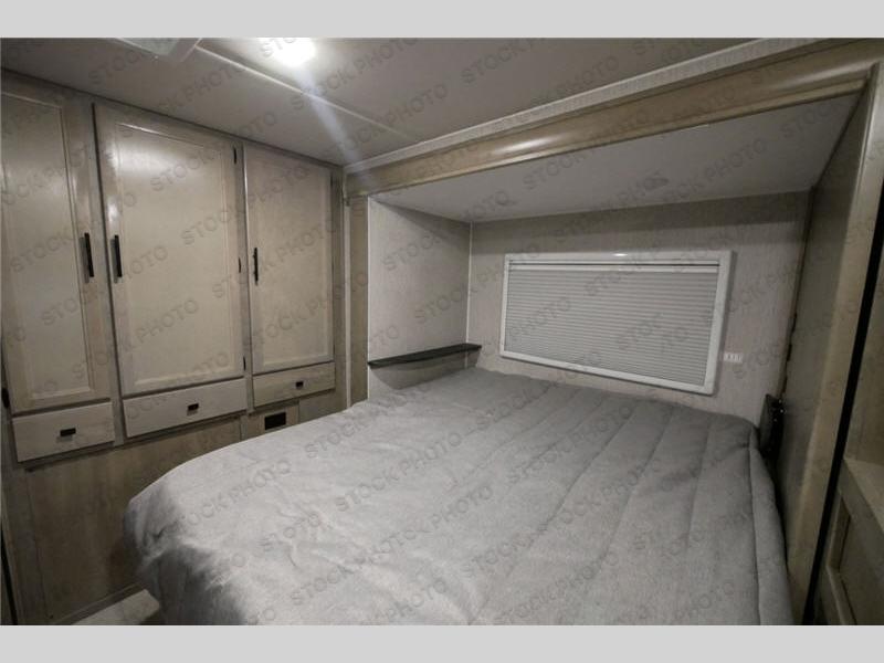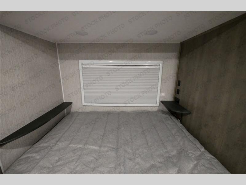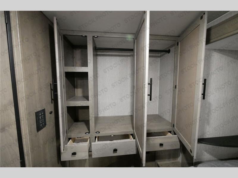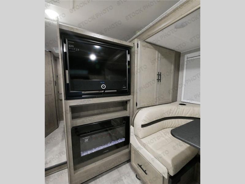 After enjoying the ride, you will love the destination while you relax inside at the U-shaped dinette or choose the optional recliners, and the entertainment center with TV and fireplace slide within the slide, plus pantry will make a cozy place to dine and play games. The front 45" x 80" cab over bunk provides sleeping or storage space, and the full galley kitchen allows you to make warm meals and store leftovers. You will also have overhead cabinets to stow away your dishes and dry goods. There is a queen bed, a nightstand, and a large back wall wardrobe and linen storage, plus a full bathroom in the rear corner of this coach to be able to sleep comfortably and get refreshed each day wherever you are.