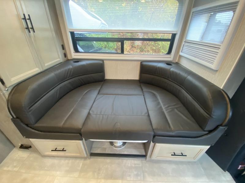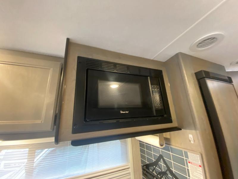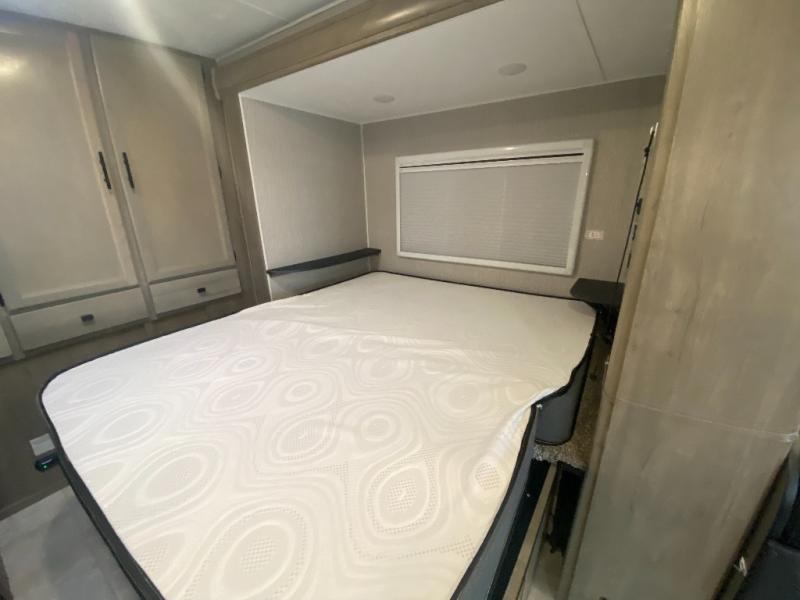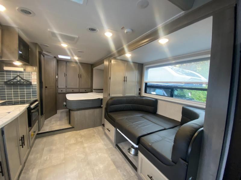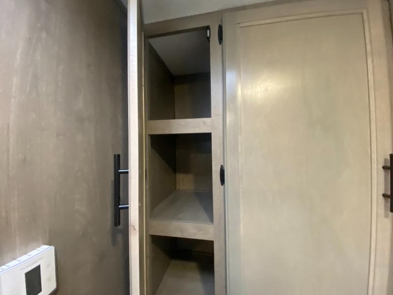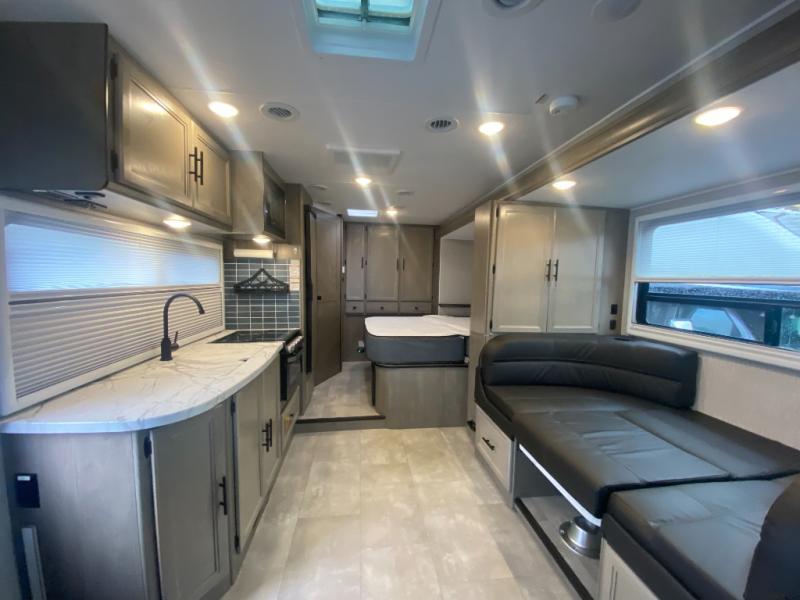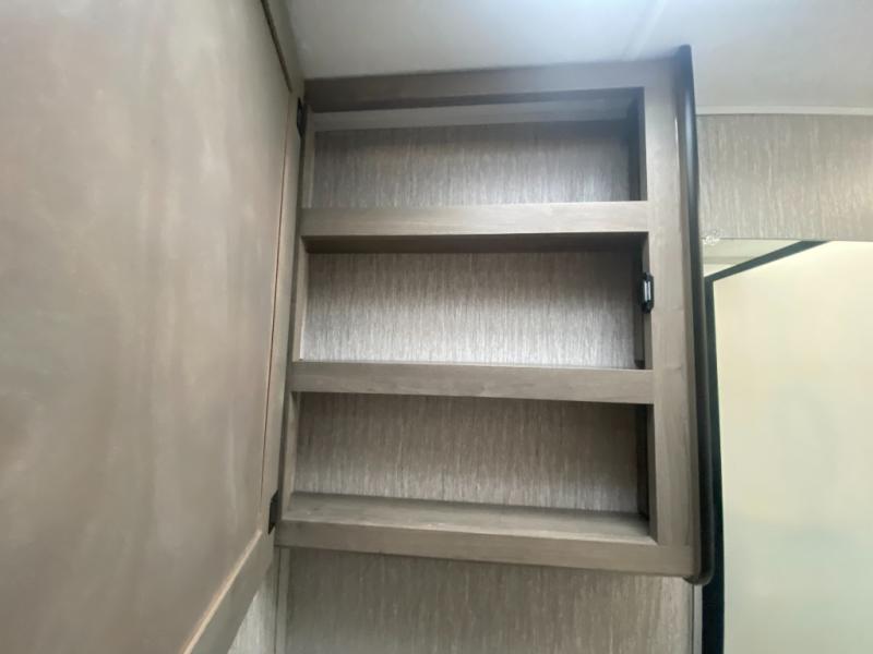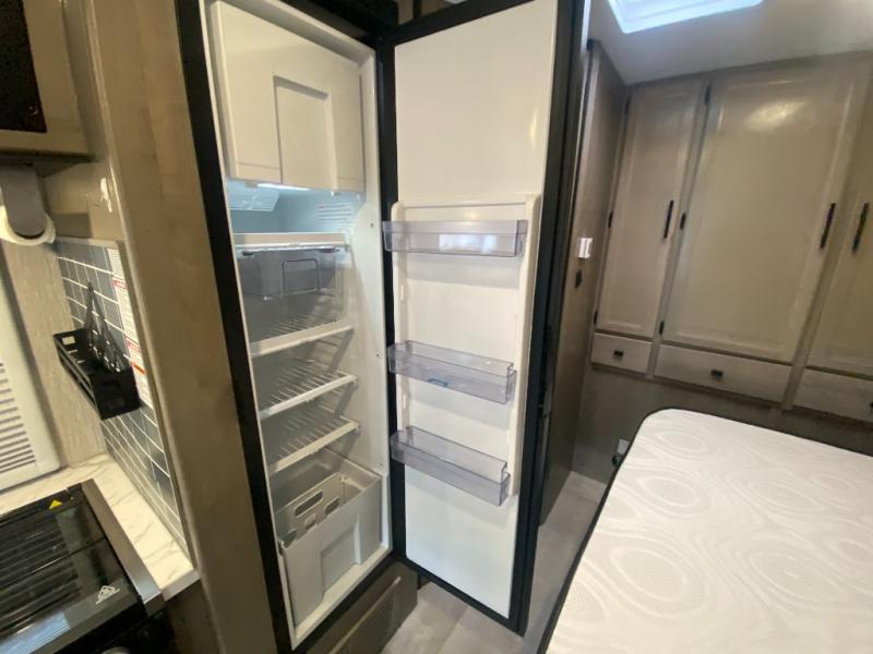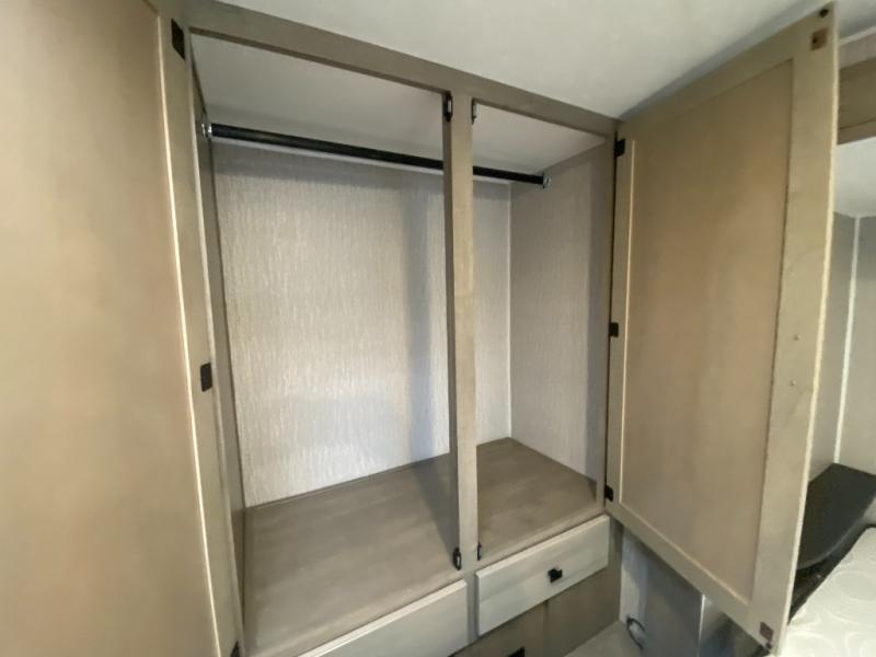 After enjoying the ride, you will love the destination while you relax inside at the U-shaped dinette or choose the optional recliners, and the entertainment center with TV and fireplace slide within the slide, plus pantry will make a cozy place to dine and play games. The front 45" x 80" cab over bunk provides sleeping or storage space, and the full galley kitchen allows you to make warm meals and store leftovers. You will also have overhead cabinets to stow away your dishes and dry goods. There is a queen bed, a nightstand, and a large back wall wardrobe and linen storage, plus a full bathroom in the rear corner of this coach to be able to sleep comfortably and get refreshed each day wherever you are.