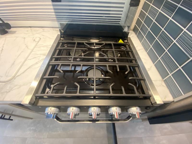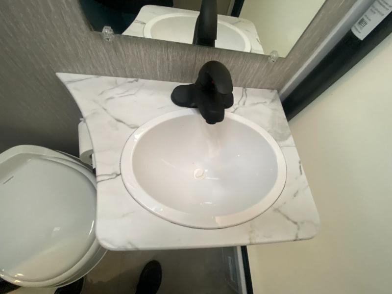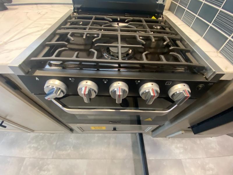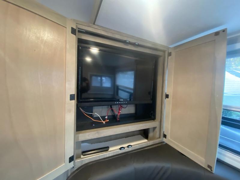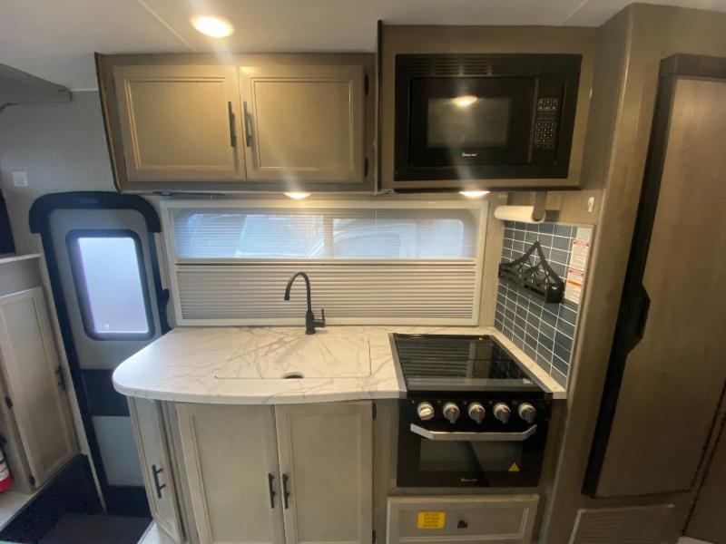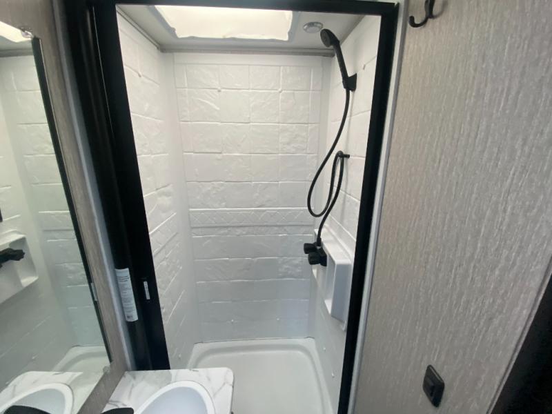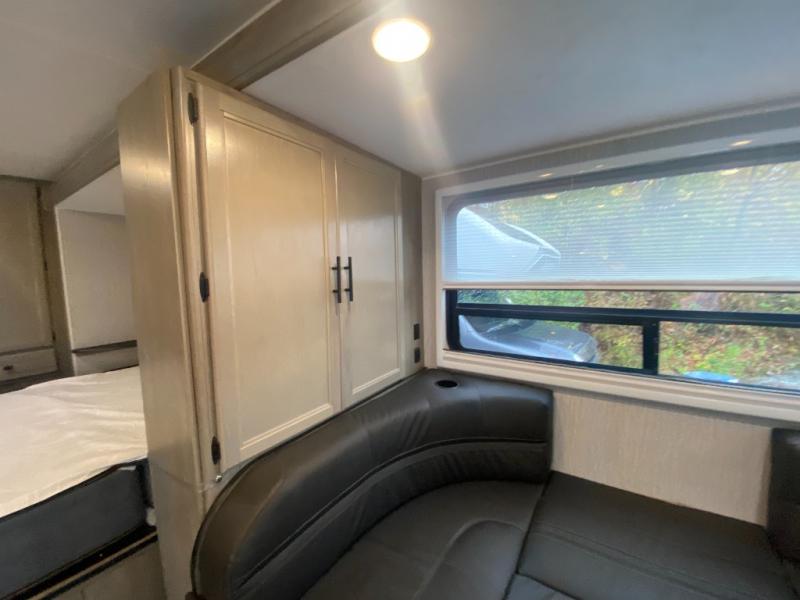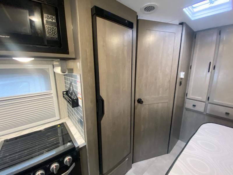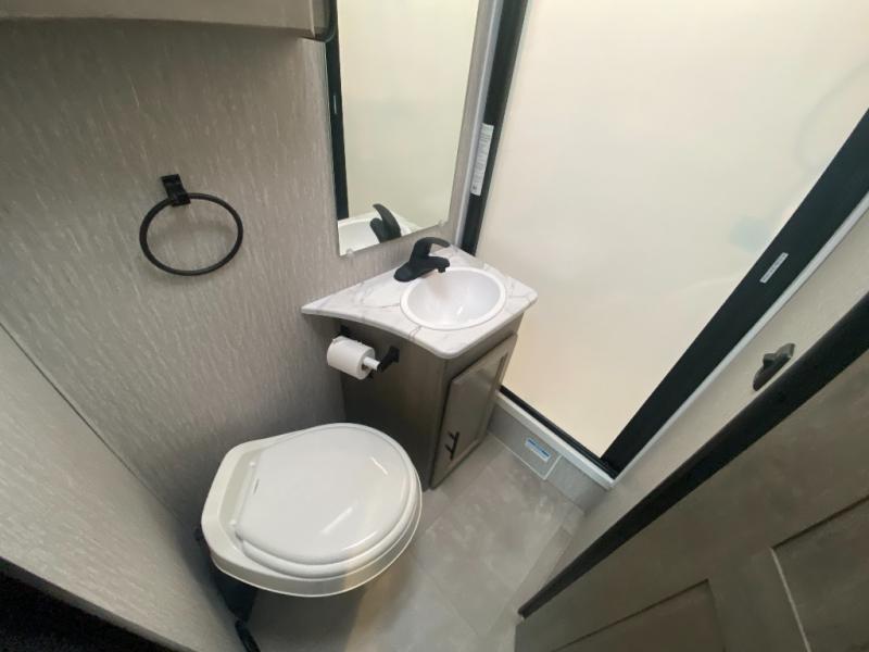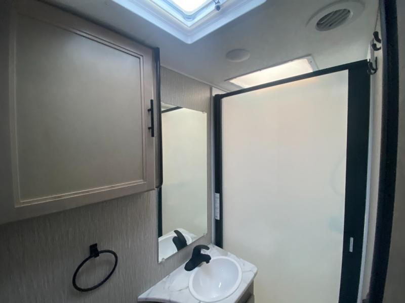 After enjoying the ride, you will love the destination while you relax inside at the U-shaped dinette or choose the optional recliners, and the entertainment center with TV and fireplace slide within the slide, plus pantry will make a cozy place to dine and play games. The front 45" x 80" cab over bunk provides sleeping or storage space, and the full galley kitchen allows you to make warm meals and store leftovers. You will also have overhead cabinets to stow away your dishes and dry goods. There is a queen bed, a nightstand, and a large back wall wardrobe and linen storage, plus a full bathroom in the rear corner of this coach to be able to sleep comfortably and get refreshed each day wherever you are.
