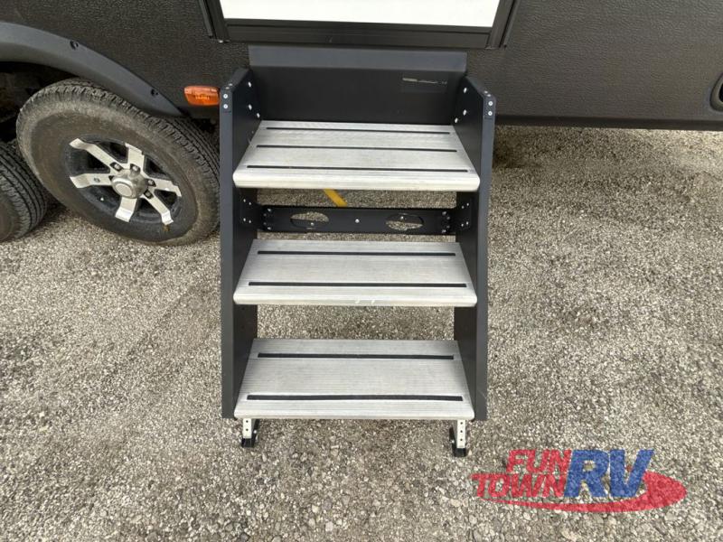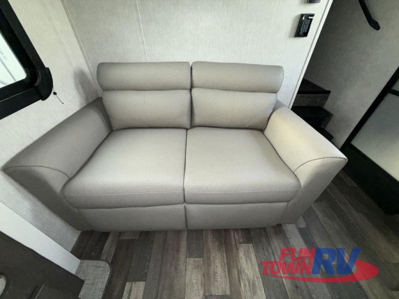 A spacious rear kitchen, plus an outdoor kitchen make this a fun fifth wheel to take to the campground. Make a cold drink from the wine fridge once you arrive at your destination, then head outside to relax under the power awning with LED lights. If the weather isn't coopering, you will find comfortable seating space inside on the tri-fold sofa and the U-Dinette. You will appreciate the front private bedroom with a king bed, dual nightstands, and a wardrobe for your clothes!