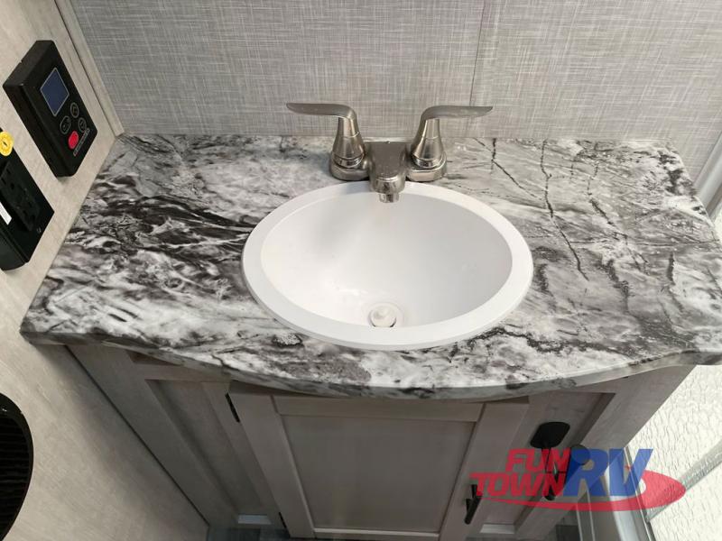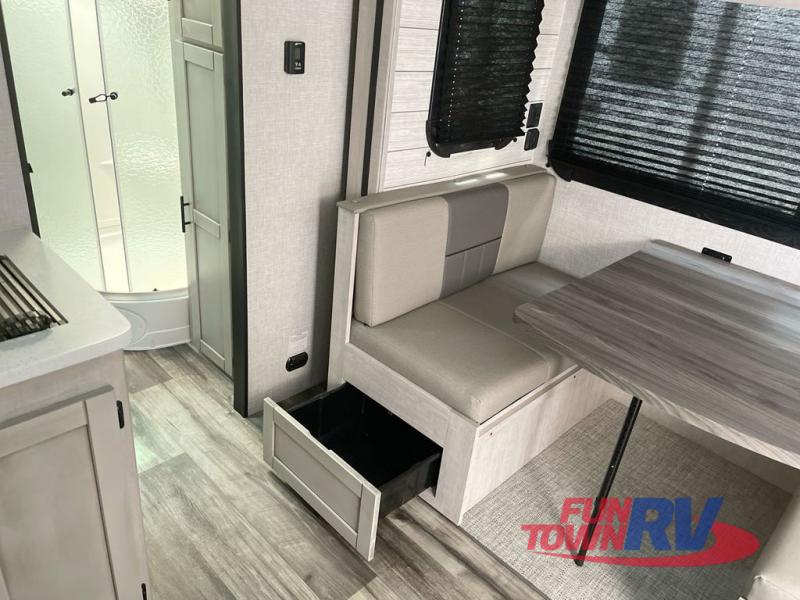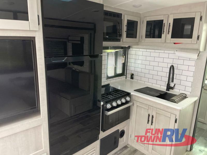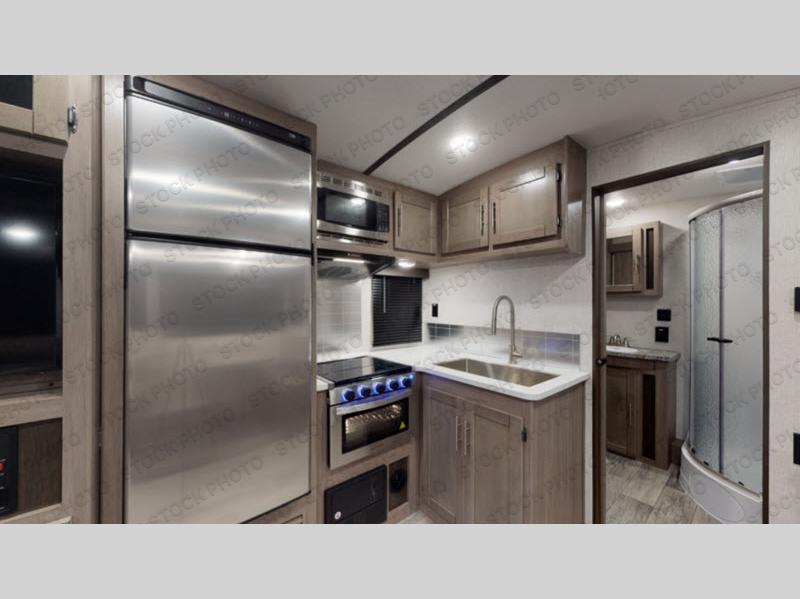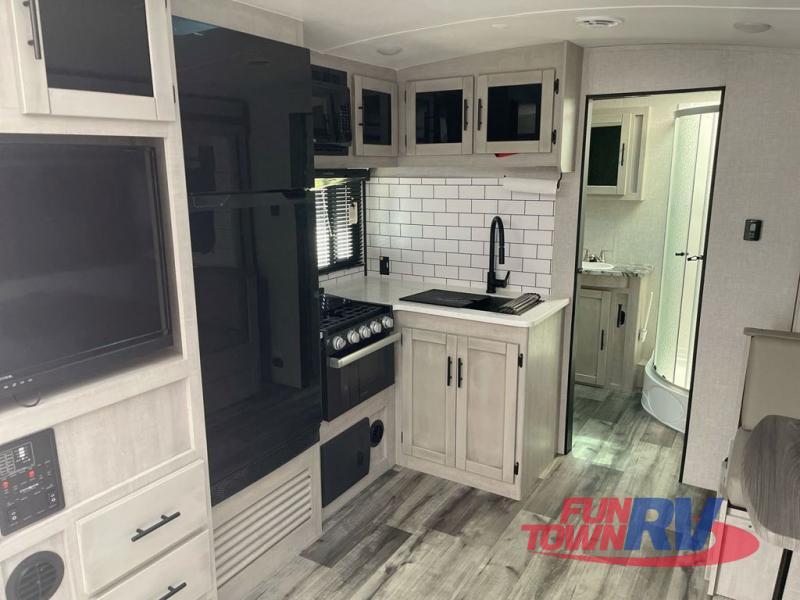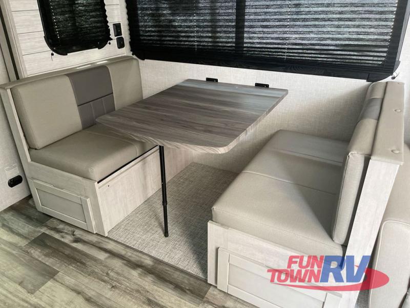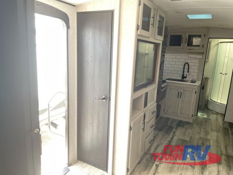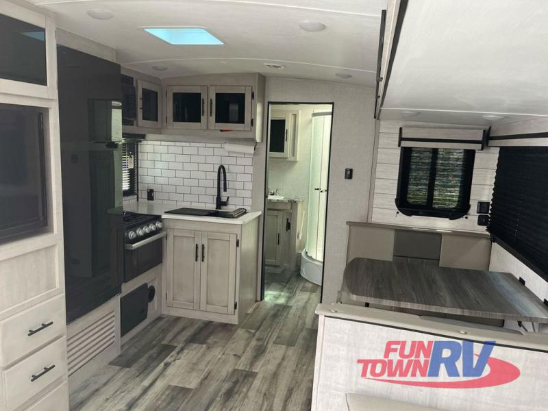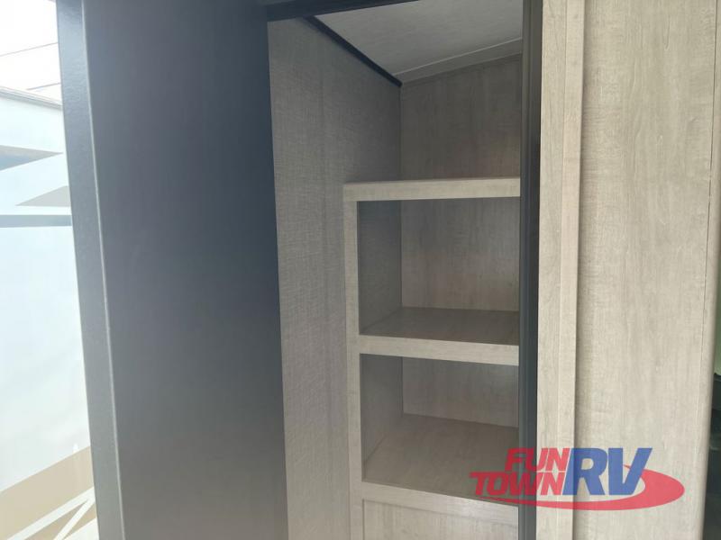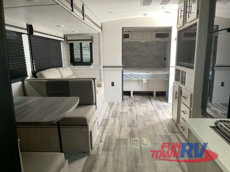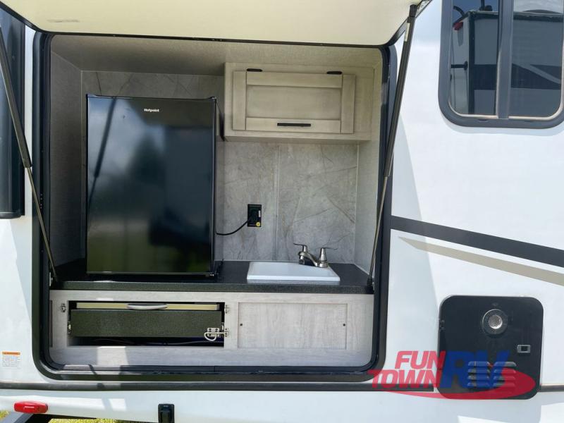 You will love the added interior space you have in this travel trailer thanks to the large slide out in the main living area. Here, you'll enjoy playing cards at the XL booth dinette and relaxing on the tri-fold sofa. Make home-cooked meals on the glass top range or use the exterior camp kitchen. There is even an exterior refrigerator for cold drinks, and the power awning will shade you from the hot summer sun. This model features a full rear bath for added privacy, and the shower skylight will allow natural light in. The front private bedroom includes a king bed, dual wardrobes, plus a shoe storage and pet station for your convenience!